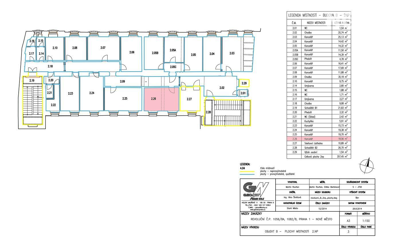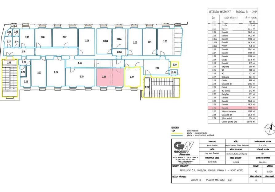 Nabízíme k pronájmu kancelář v prvním patře administrativní budovy (B) v Praze 1 – Nové Město. Jedná se o prostor č. 2.26 (viz. plánek). Celková výměra v nájmu je 25,76 m2 (kancelář 18,56 m2 + společné prostory 7,20 m2). Budova se nachází na prestižní adrese v centru, nedaleko obchodního centra Palladium. Místo je dobře obslužné veřejnou dopravou, v blízkosti stanice metra „B“ Náměstí Republiky. V okolí velká nabídka služeb. Pro více informací volejte makléřku. Pro komunikaci uvádějte evidenční číslo zakázky N115994.