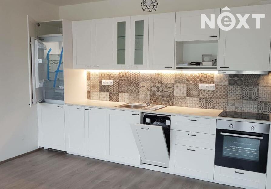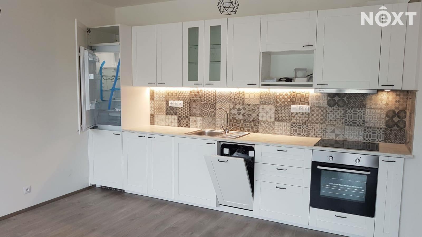 Ve větším pokoji nalezneme kuchyňský kout s troubou se sklokeramickou deskou, digestoří, myčkou a velkou lednicí s mrazákem. Odtud je vstup na větší balkón (7m2).