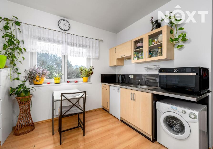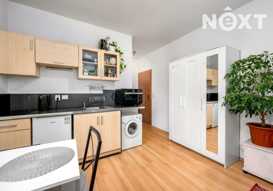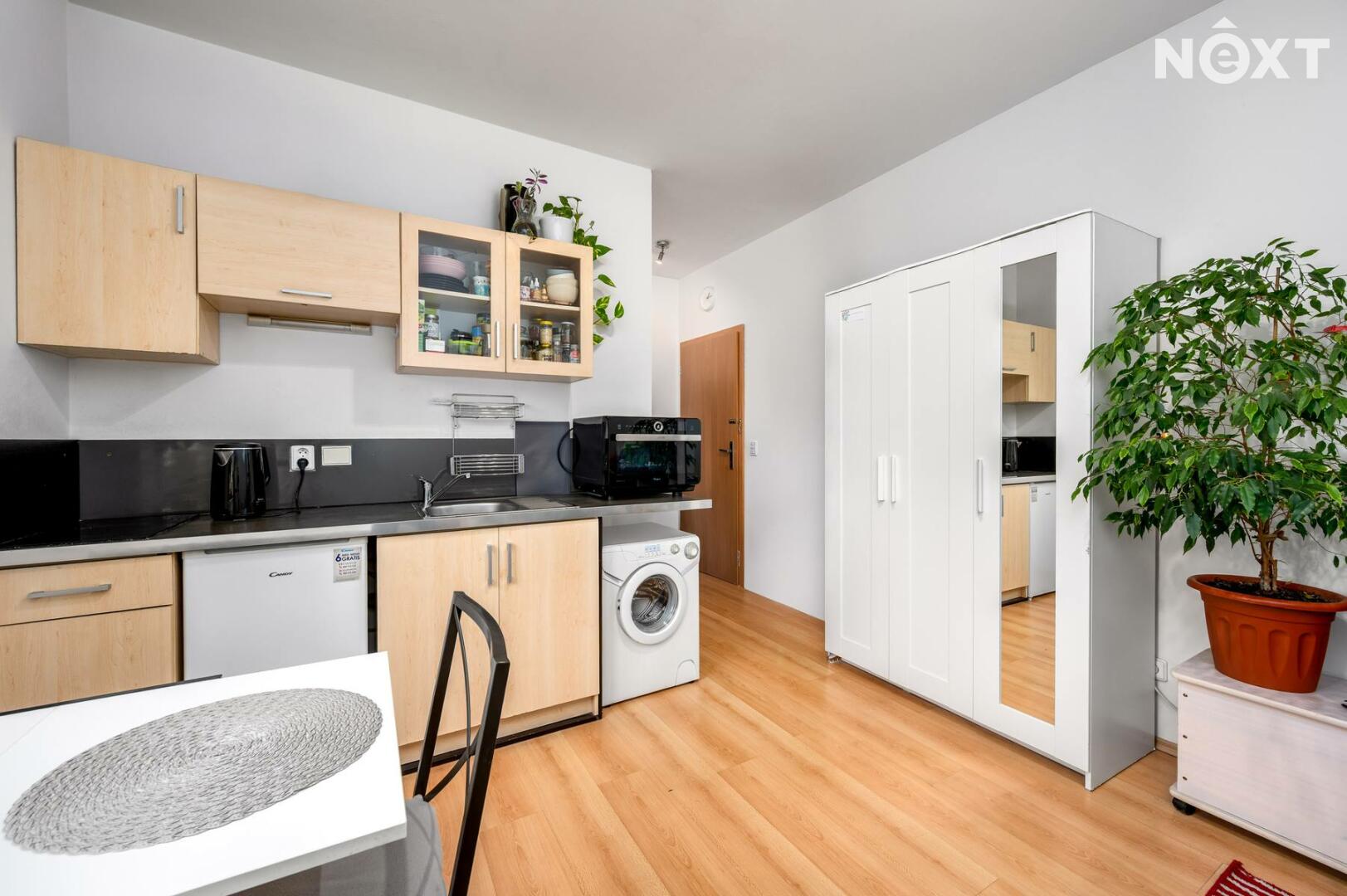 Byt působí světlým a udržovaným dojmem a je řešen velmi účelně. Hlavní obytný prostor nabízí kuchyňský kout s elektrickou varnou deskou, lednicí a pračkou, nechybí místo pro jídelní stůl ani úložné prostory. Díky oknu je byt příjemně prosvětlený po celý den.