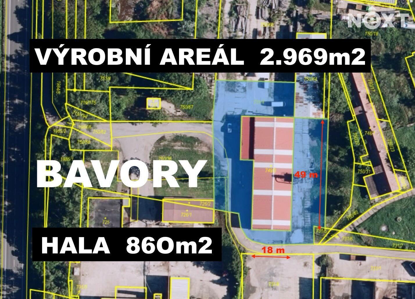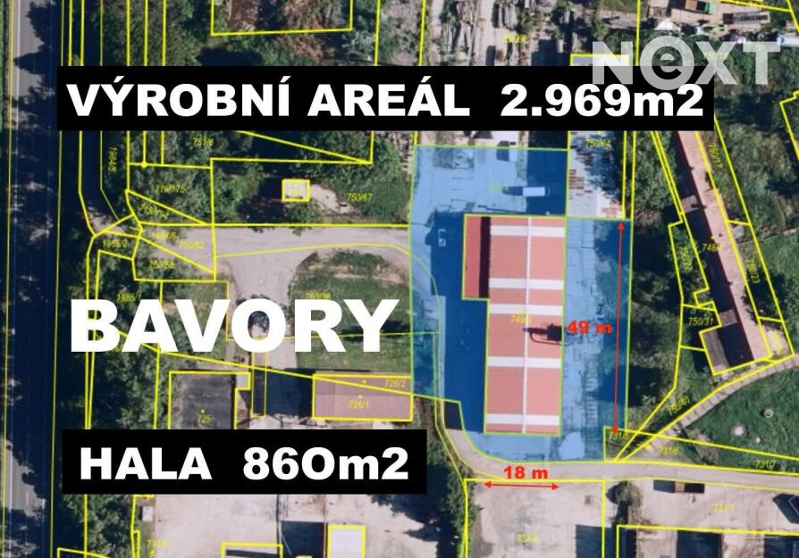 Ve výhradním zastoupení společnosti nabízíme k prodeji průmyslový areál s výrobní halou, kancelářemi a zázemím v Bavorech, asi 5 minut autem z Mikulova, v lokalitě bývalého zemědělského družstva. Celková plocha areálu na třech parcelách je 3.758 m2, podlahová plocha haly je asi 860 m2, Hala má obdélníkový tvar, 18x49m, výška po okap je 4m, v nejvyšším bodě sedlové střechy je výška 5 m. Kanceláře se zázemím mají plochu 108 m2, celkem tři kanceláře 8 m2, 11 m2 a 18 m2, vzorkovna 30 m2, koupelna a 2x WC. Celý areál nyní slouží jako kovovýroba a je dostupný z hlavního tahu Mikulov – Brno, silnice a dálnice D52.