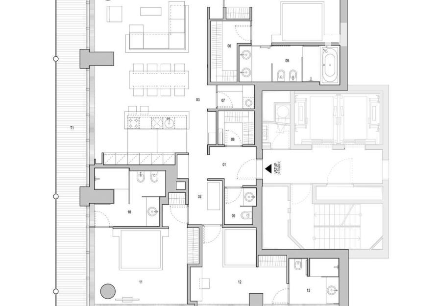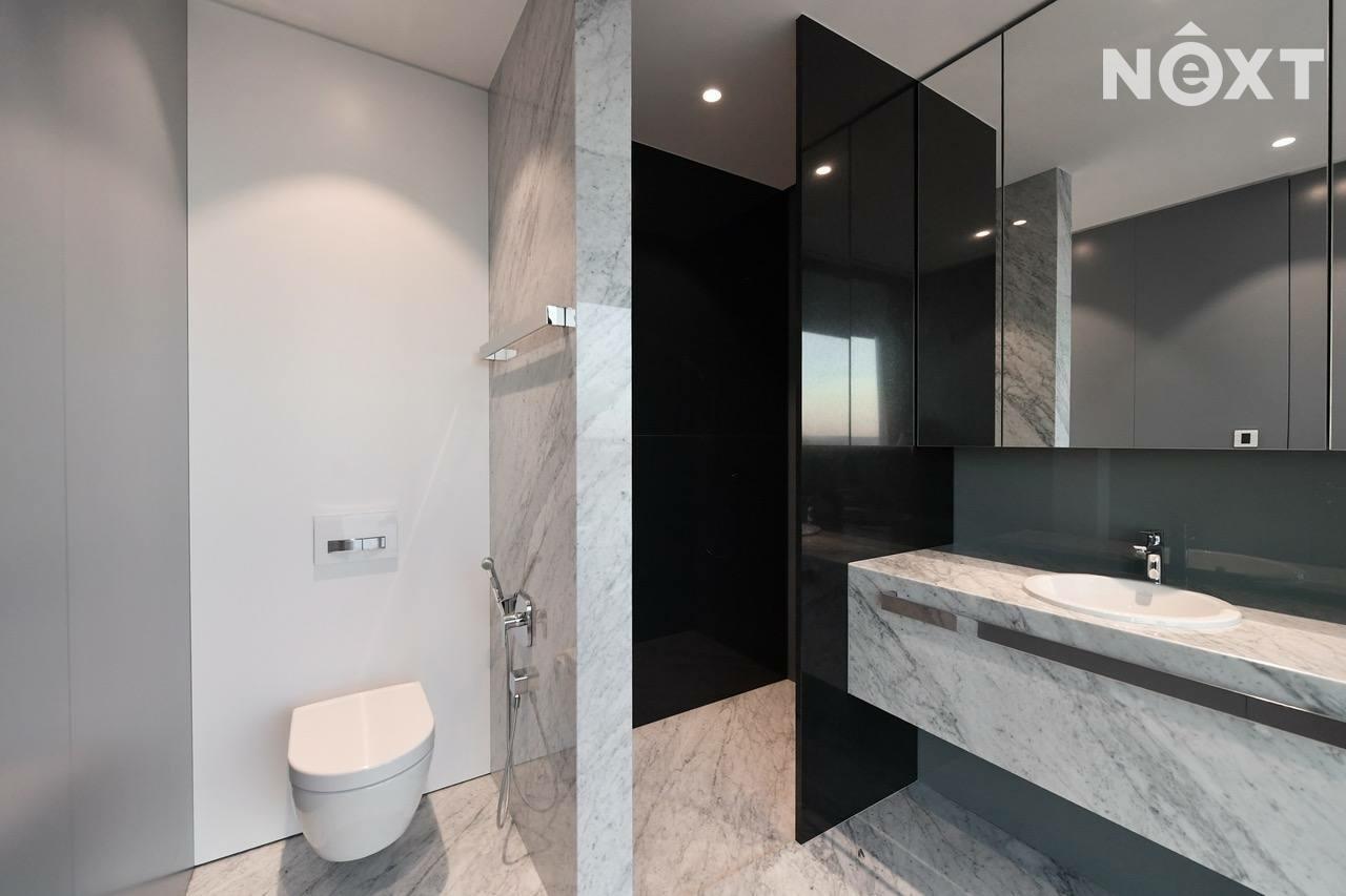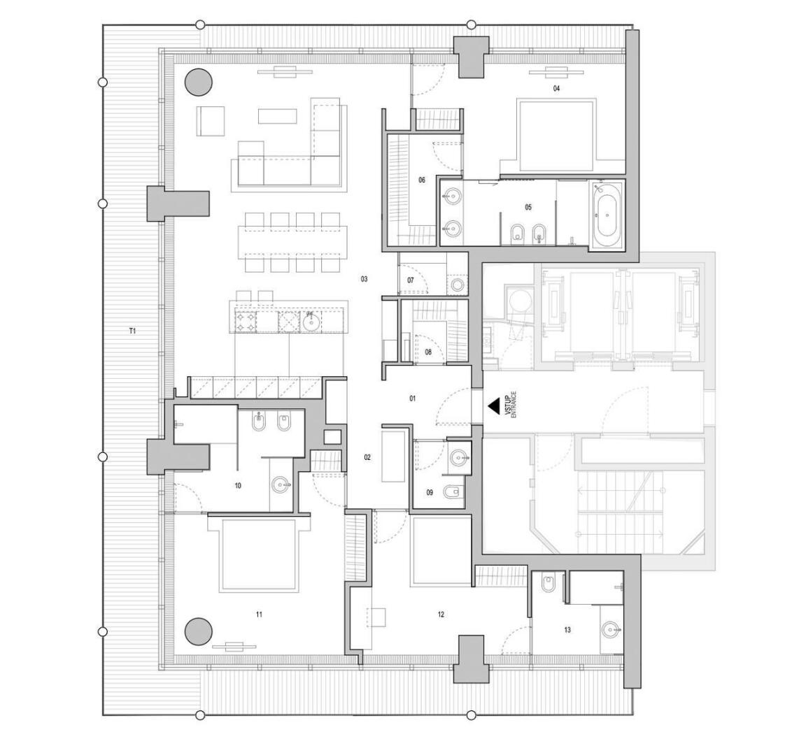 Byt se třemi ložnicemi, prostorným obývacím pokojem a terasou (51,1 m2) nabízí výhledy do tří světových stran - na celé město i okolí, zejména pak na Pražský Hrad, Vyšehrad, Vltavu a celé historické centrum města. Další předností tohoto bytu jsou koupelny u každé ložnice, komfortní šatny a úložné prostory.