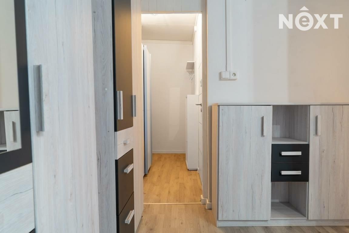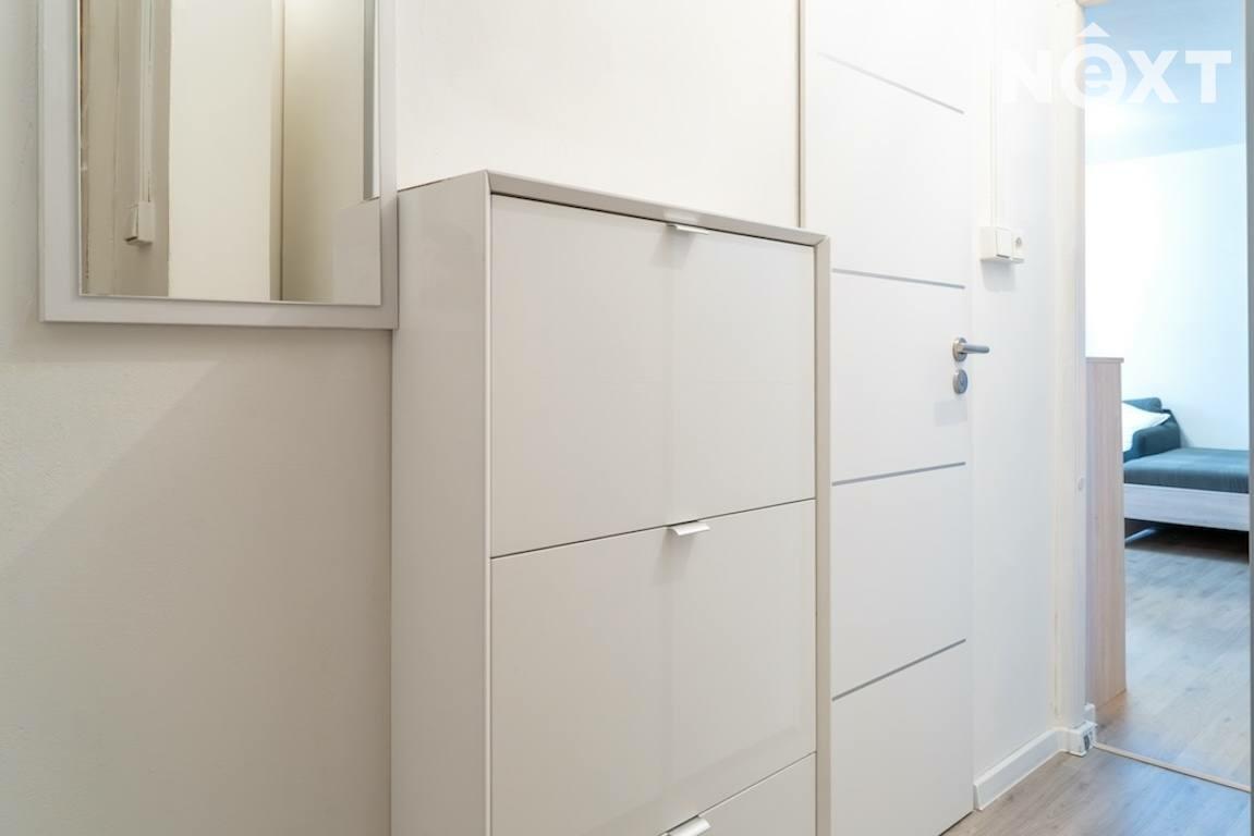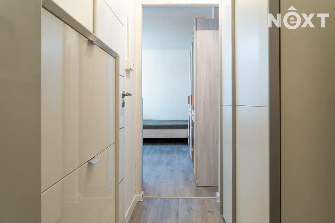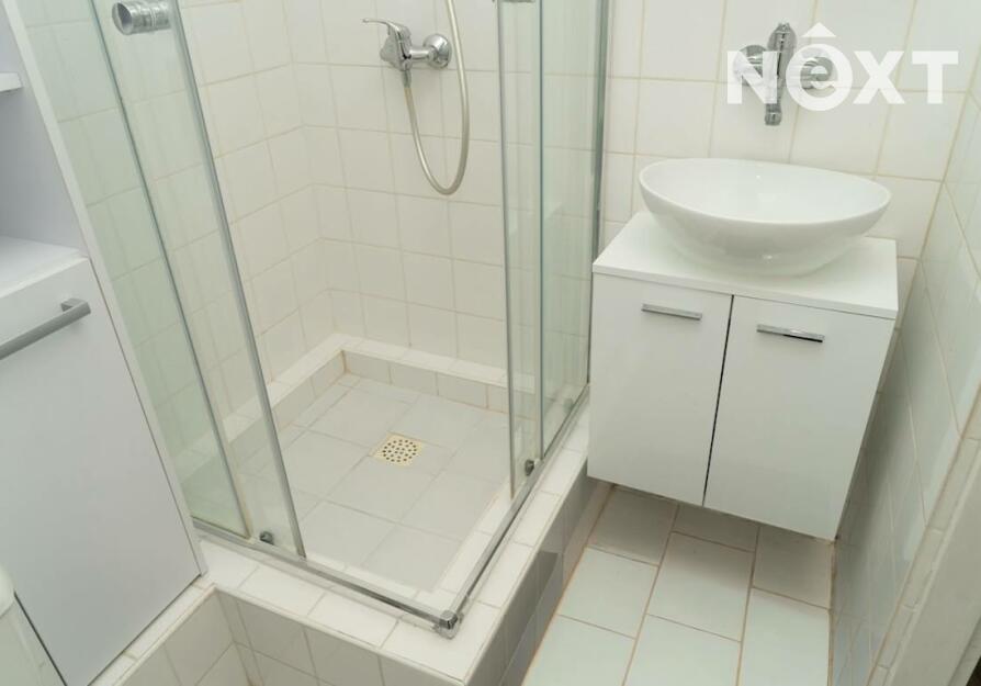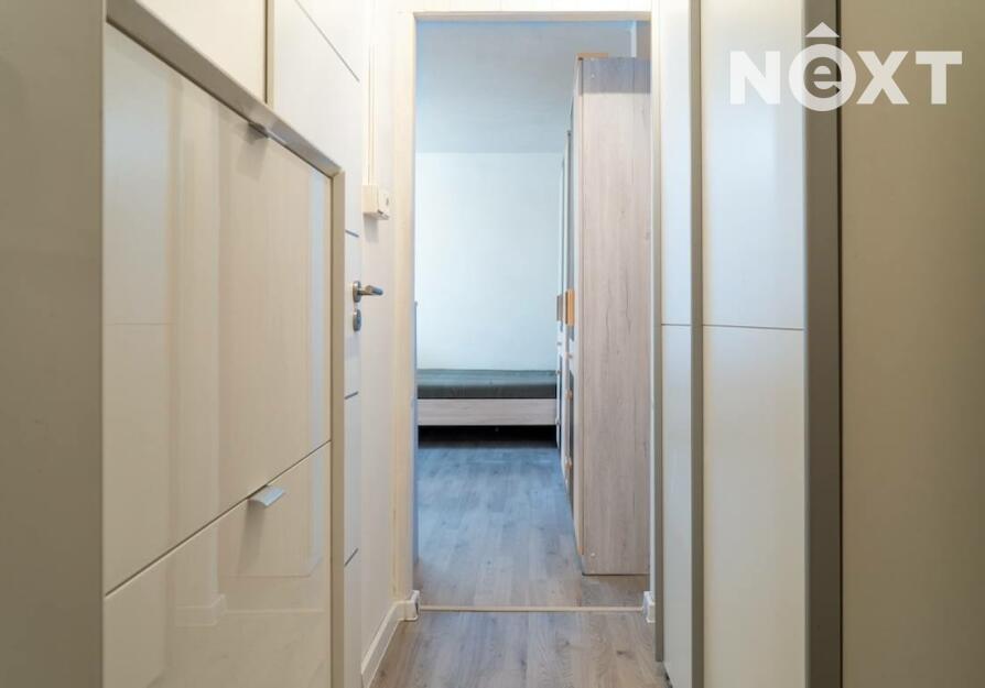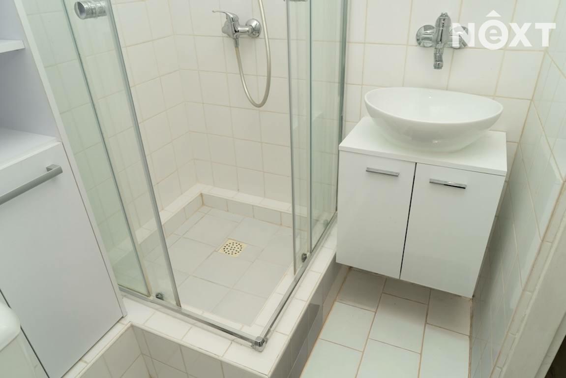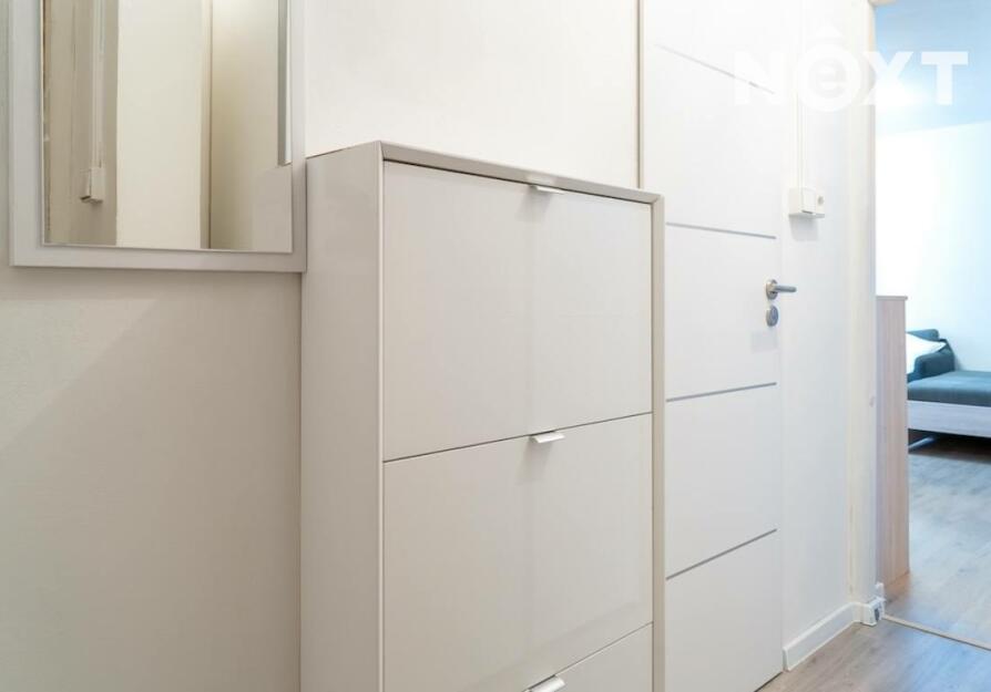 Koupelna je vybavena sprchovým koutem, WC, koupelnovou skříňkou s umyvadlem a elegantní zrcadlovou skříňkou. Předsíň disponuje vestavěnou skříní a botníkem, které poskytují dostatek úložného prostoru a podtrhují čistý, upravený dojem bytu.