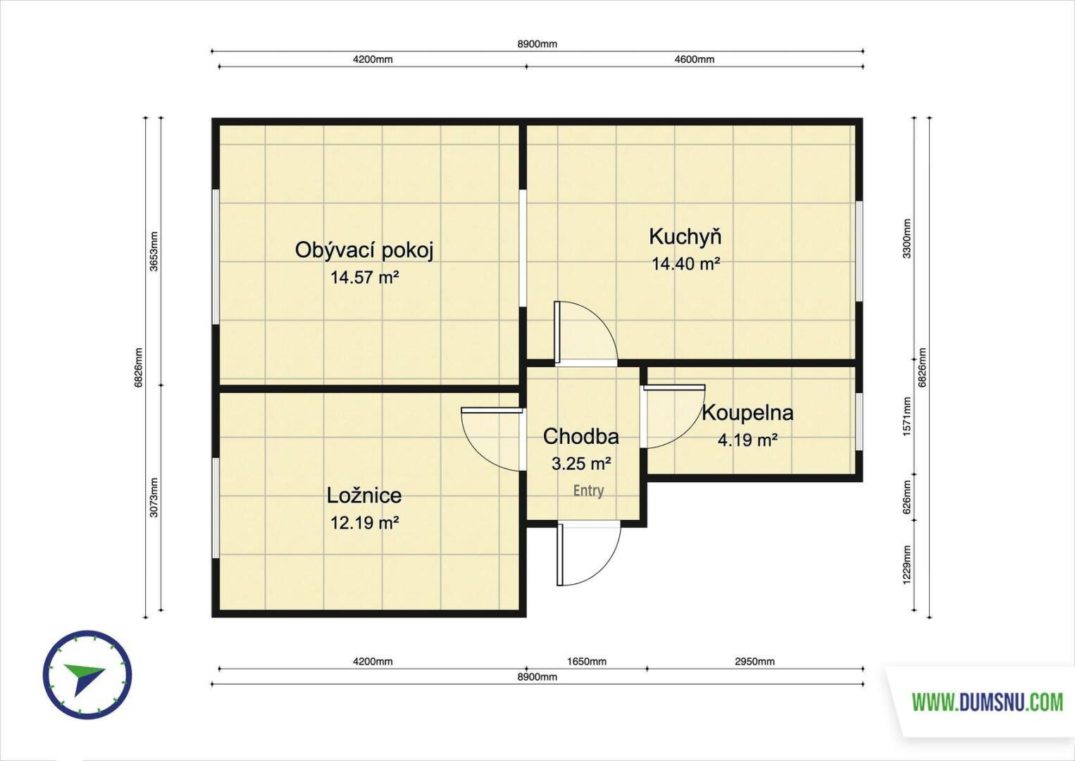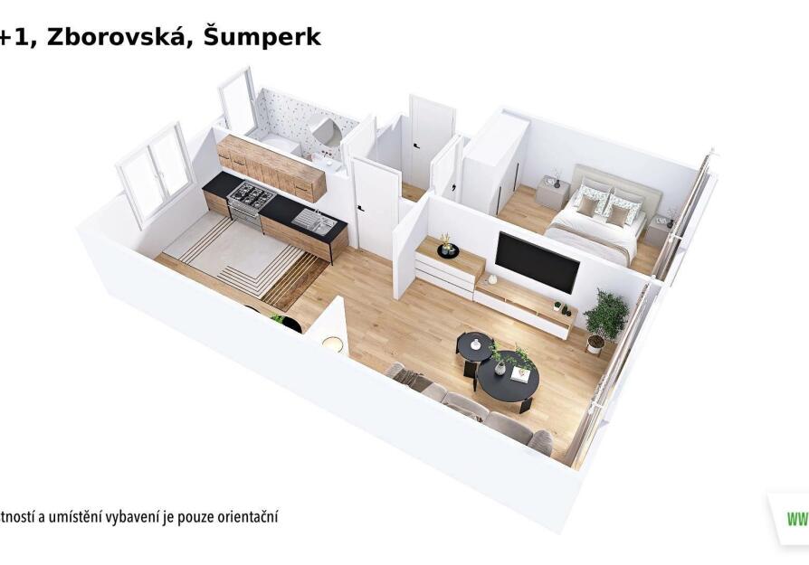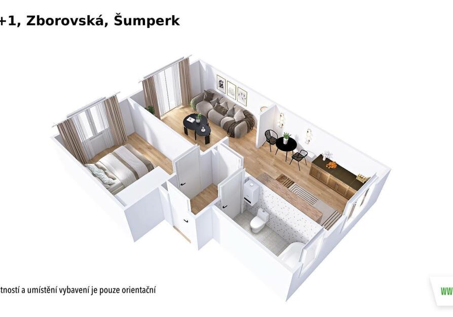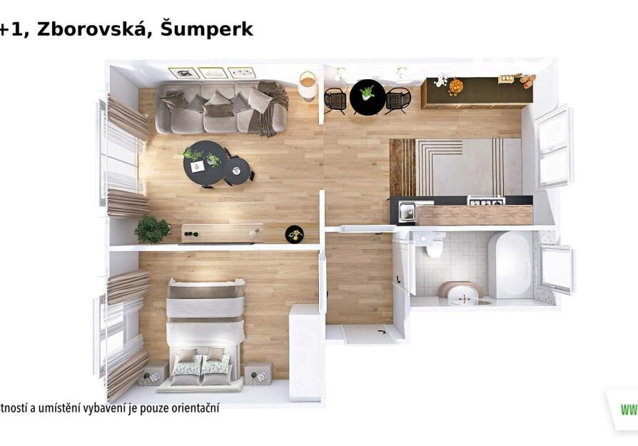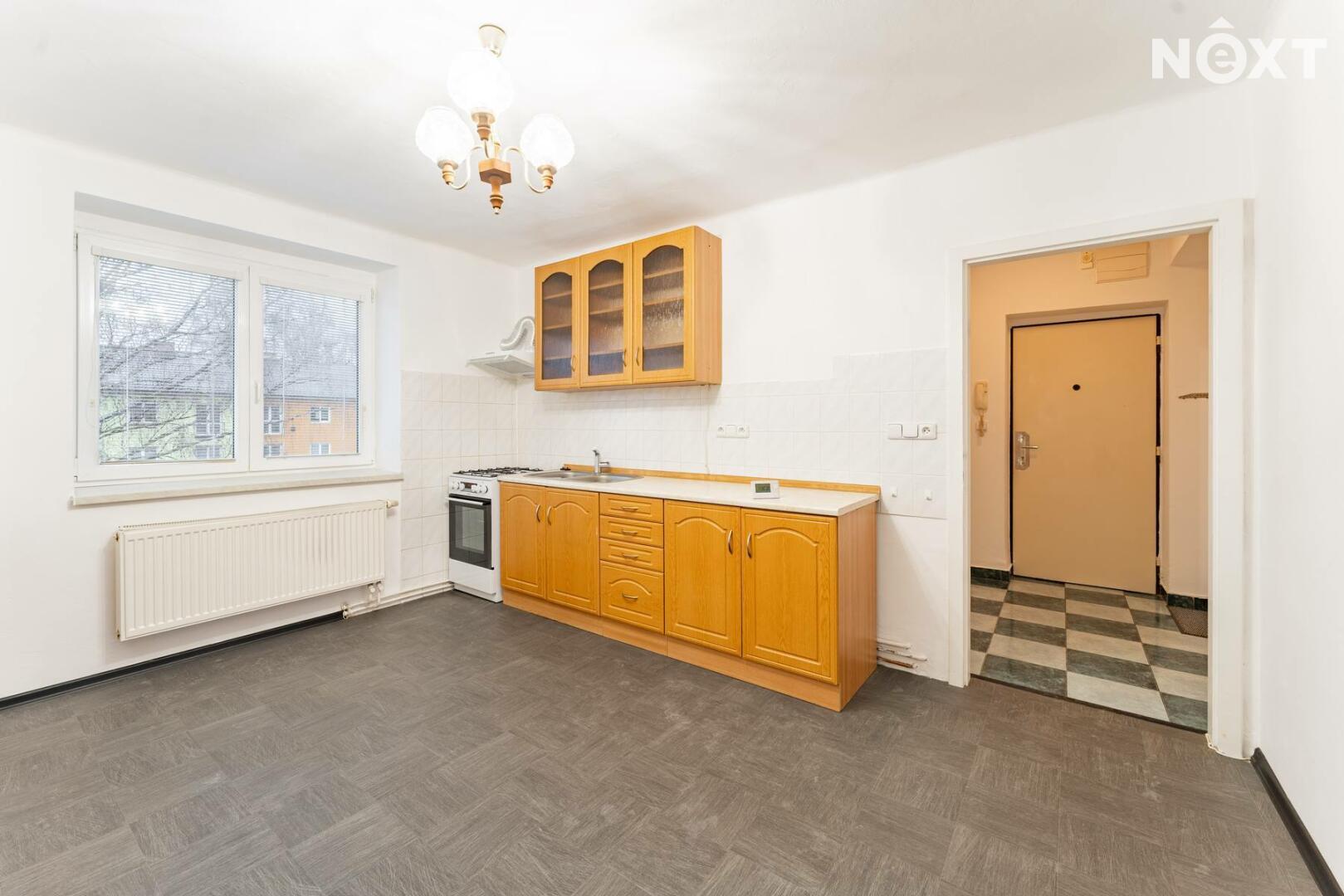 Dispozice bytu je praktická a funkční – dvě samostatné místnosti, kuchyně, koupelna a WC. Vytápění i