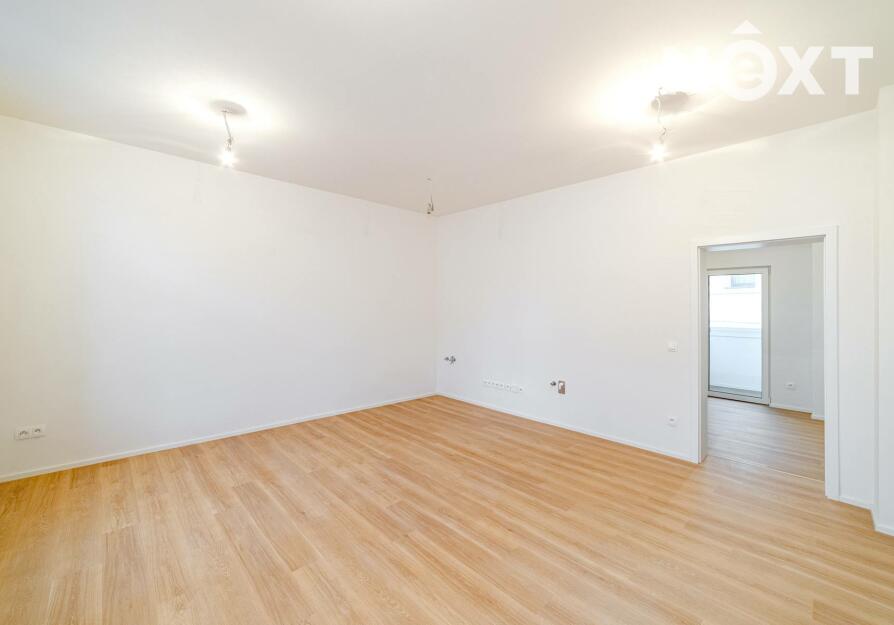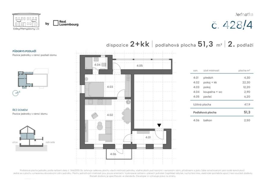 Moderní a prostorná jednotka o dispozici 2+kk (51 m²), balkonem (2,5 m²) a zasklenou pavlačí (6,5 m²).