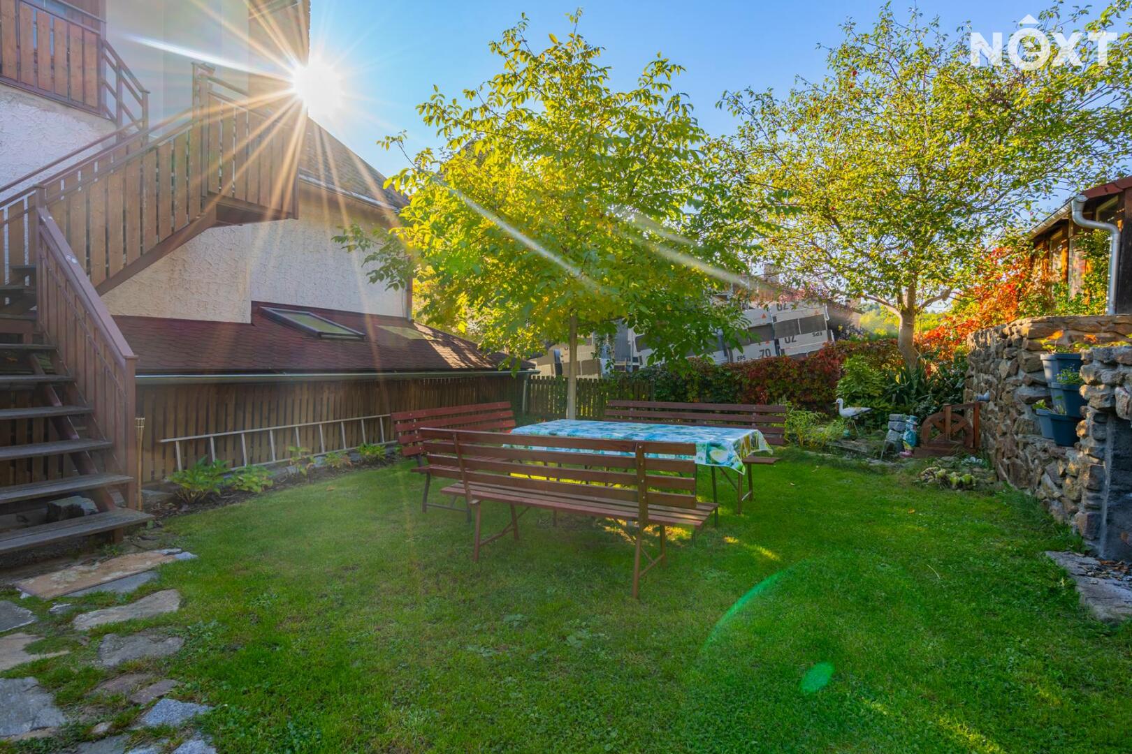 Součástí prodeje je podíl na kaskádovitě řešené zahradě o výměře 562 m2 s travnatou plochou, ovocnými stromy a místem pro posezení. Součástí zahrady je také krytá terasa s krbem, ideální pro odpočinek i grilování. Na zahradě se nachází zahradní domek, který lze využít jako dílničku, ateliér nebo ubytování pro hosty. Zahrada nabízí klid, soukromí a prostor pro vaši kreativitu.