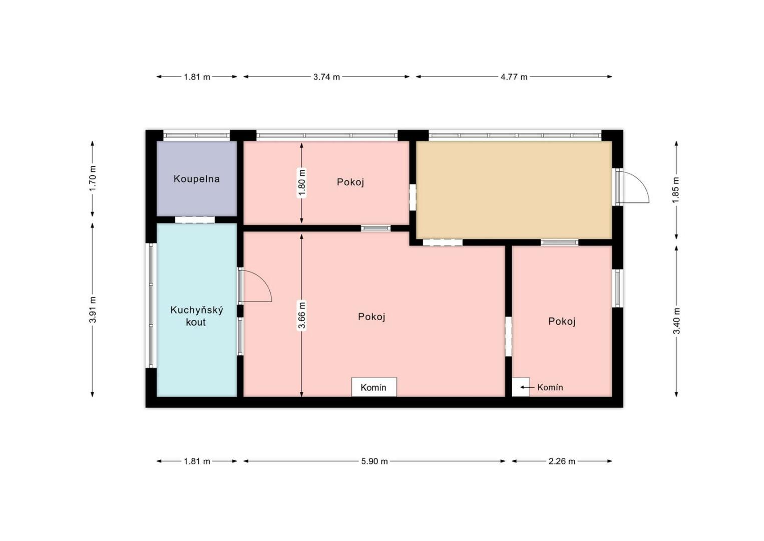 Dispozice nabízí vše potřebné pro pohodový pobyt – obývací místnost, kuchyňský kout, koupelničku, dvě menší místnosti a vstupní verandu.