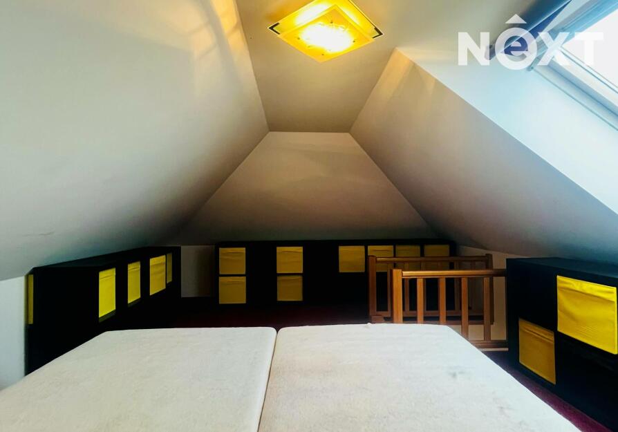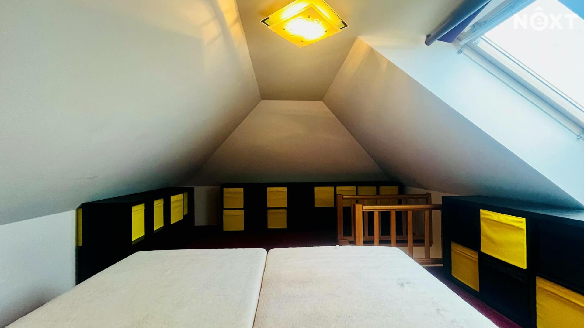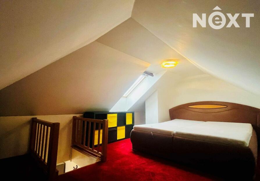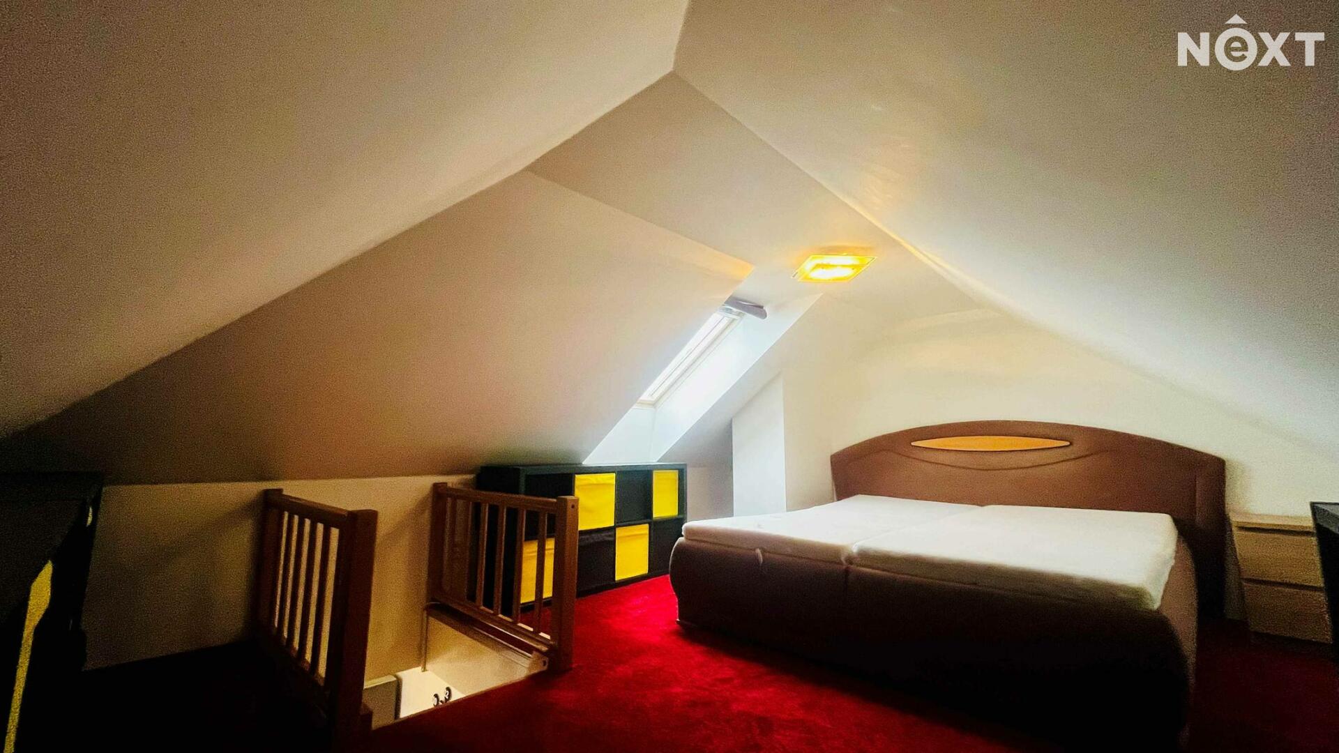 Do horního patra vede schodiště, kde se nachází ložnice .Patro je odděleno od denní části bytu a poskytuje klidovou zónu pro spaní nebo práci.