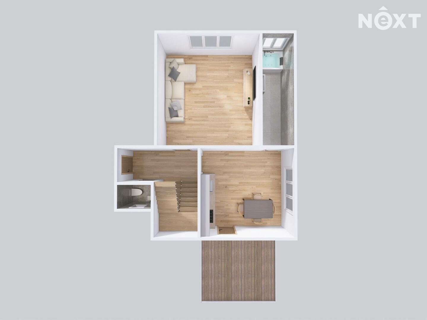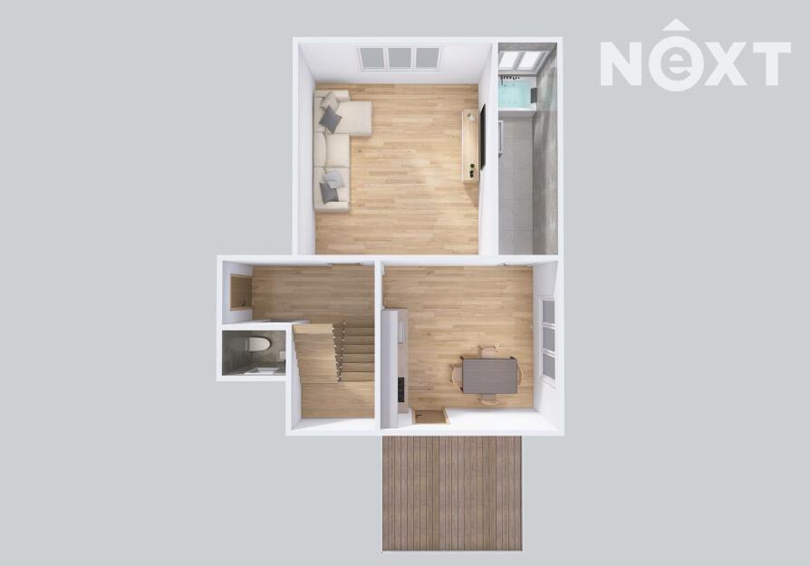 Tady se odehrává život. Kuchyně propojená s jídelnou, obývák a koupelna. A teď to nejlepší – z kuchyně se dá vyběhnout přímo ven. Do jara vám tam „přičarujeme“ terasu, takže první jarní drink už si vychutnáte s nohama nahoře.