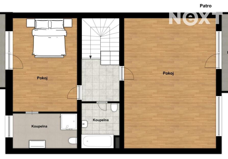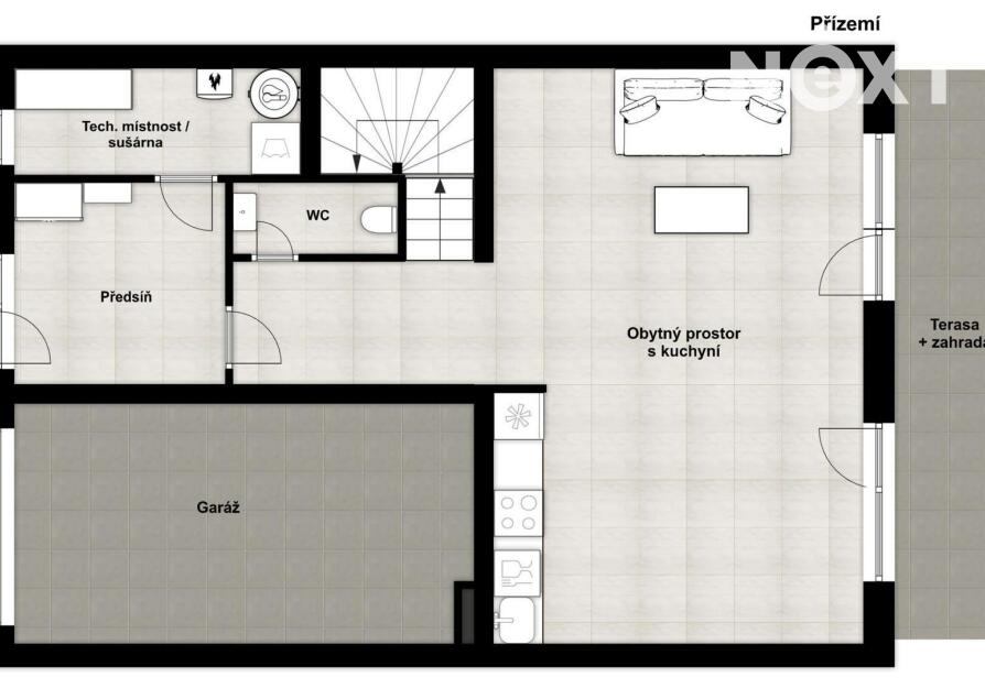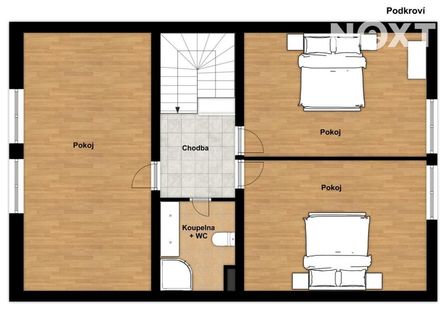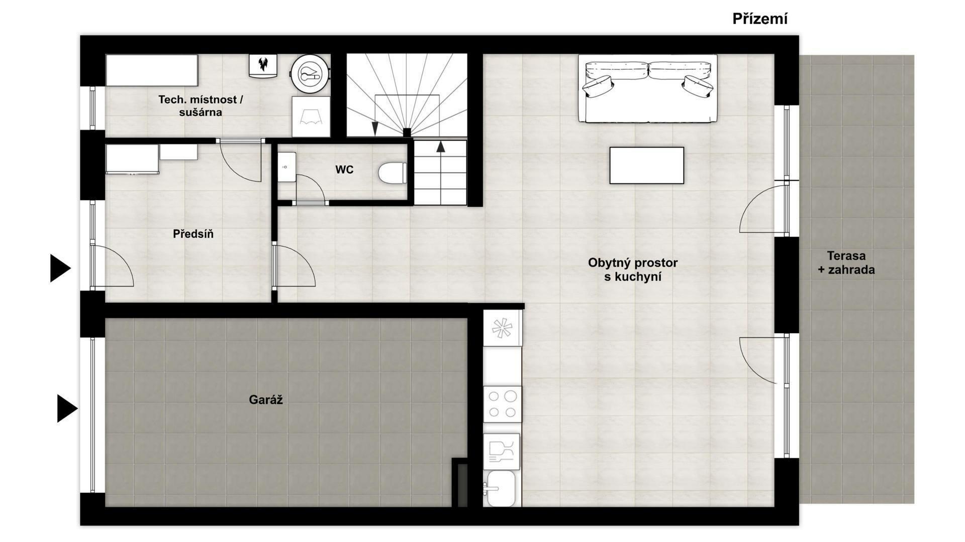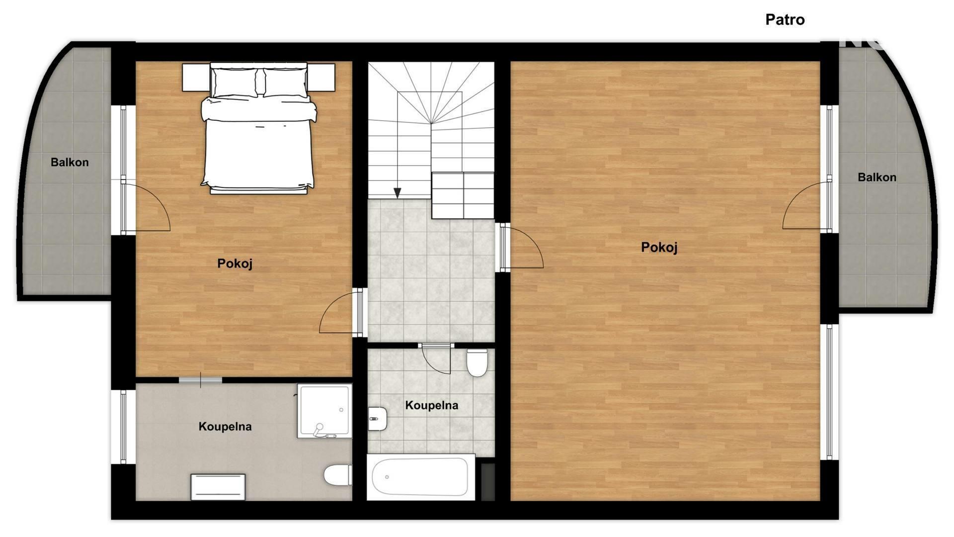Promyšlená dispozice: Přízemí - vstupní hala, technická místnost, sušárna s kombinovanou pračkou a sušičkou, samostatná toaleta s umyvadlem. Dominantou tohoto podlaží je velkorysý obývací prostor s kuchyňským koutem, který díky přímému vstupu na zahradu plynule propojuje interiér s exteriérem. 1. patro - dva samostatné pokoje, každý s vlastním balkónem, koupelna s vanou, samostatné WC na podestě a další koupelna se sprchovým koutem a WC u pokoje orientovaného do ulice. Podkroví - tři samostatné pokoje, vhodné jako ložnice, pracovna či pokoj pro hosty, a koupelna s vanou a WC.