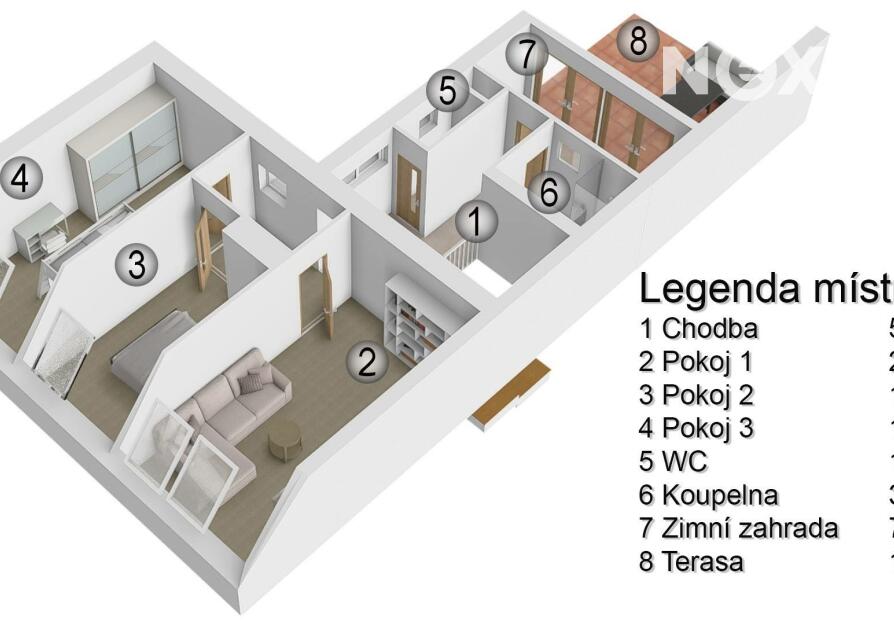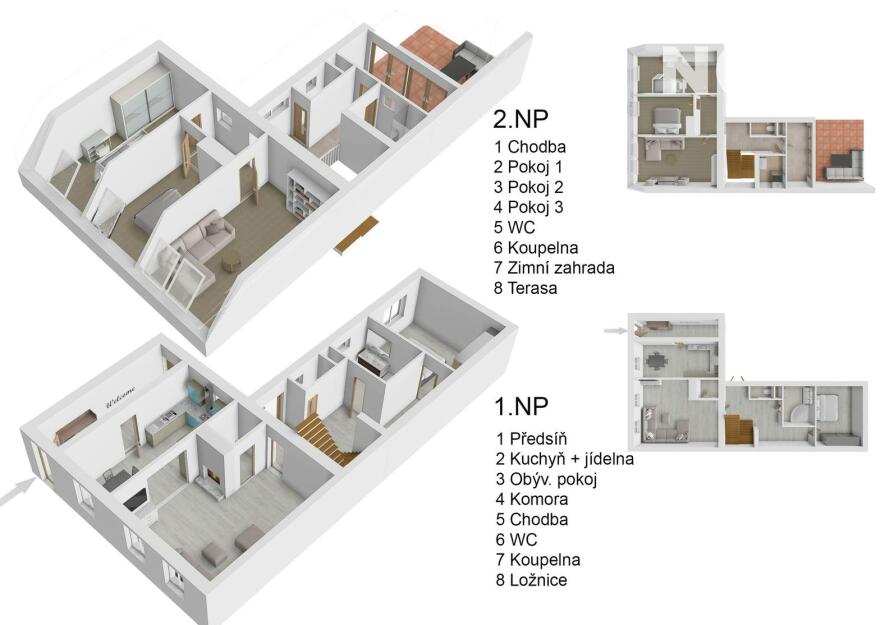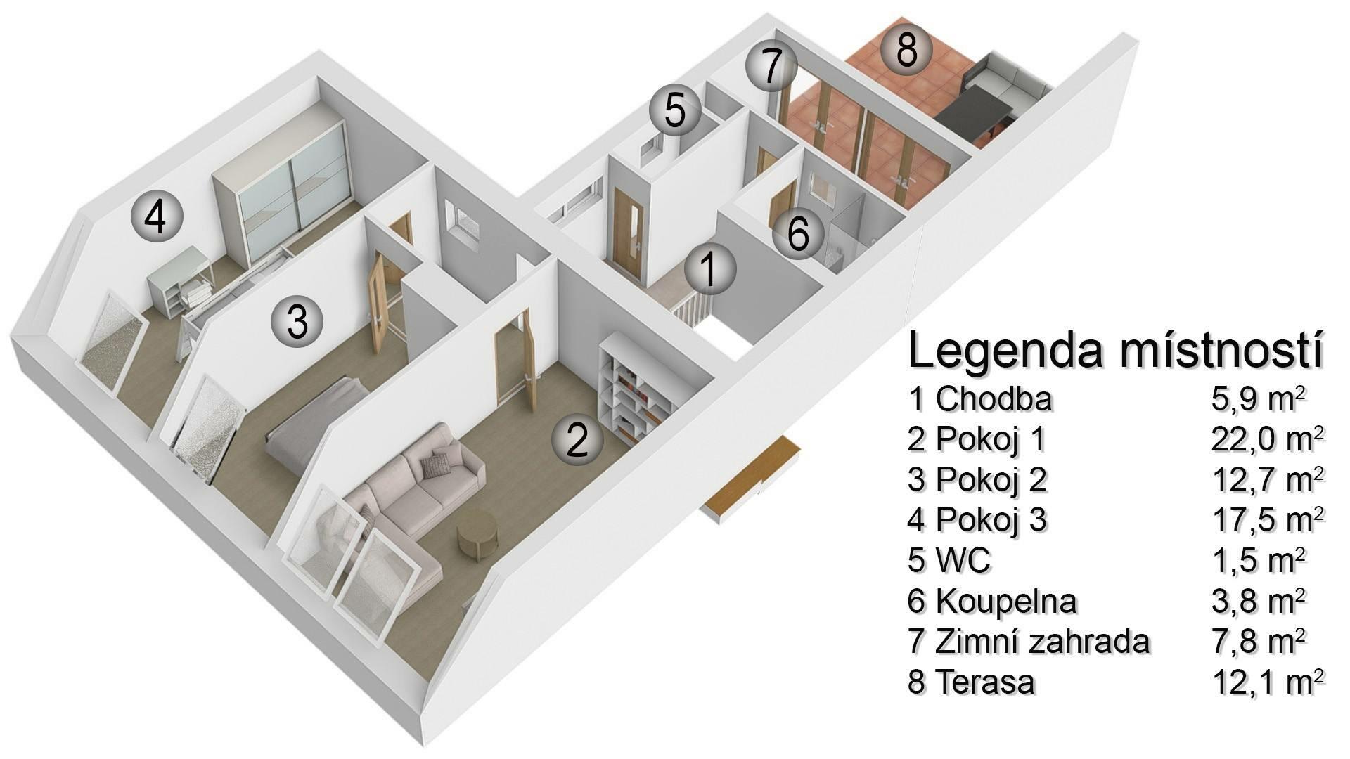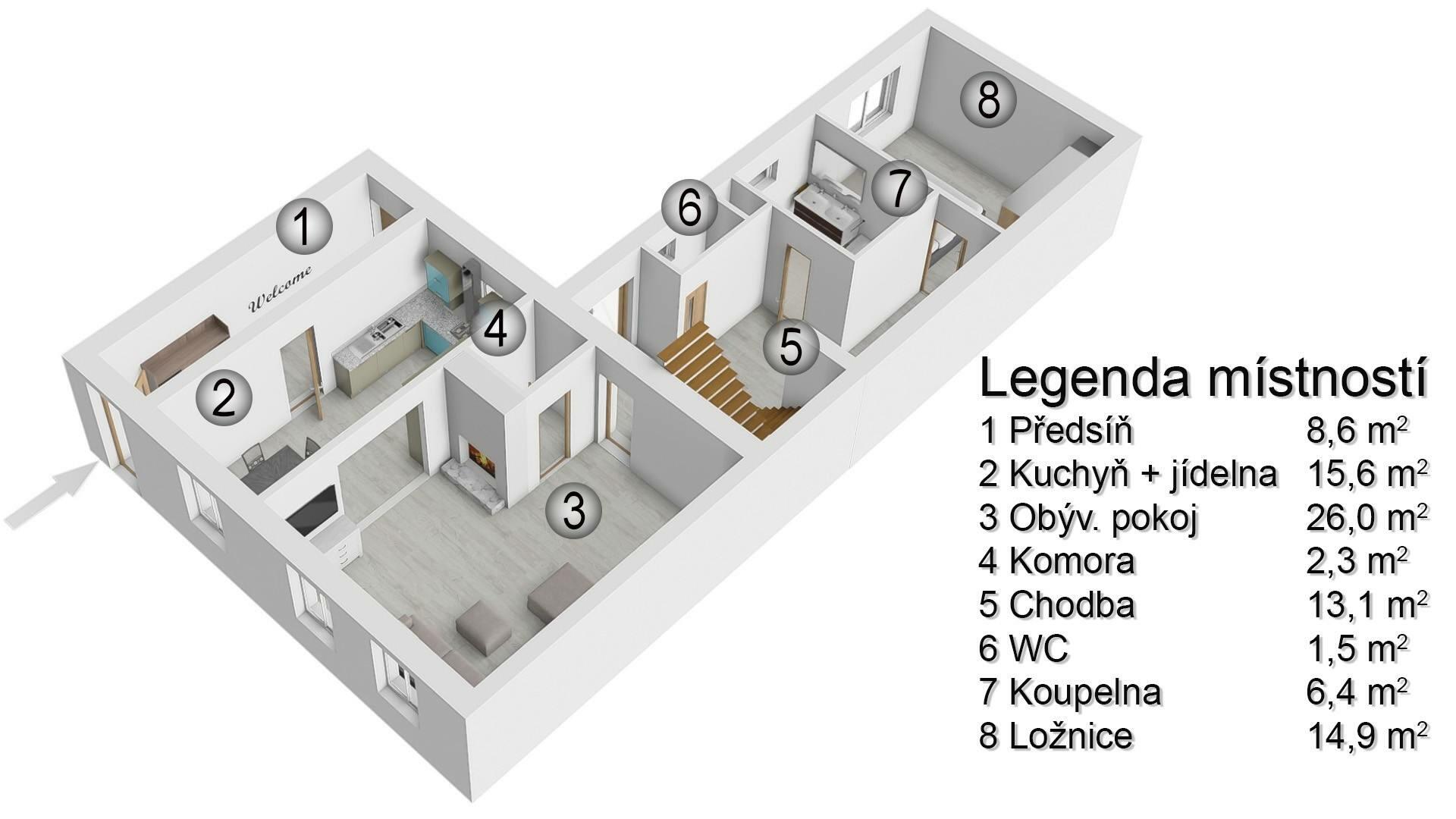 Vstup do domu je přes vstupní předsíň (8,56 m2), která tvoří spojnici s nádvořím. V přízemí najdete kuchyňský kout (6,5m2) s jídelnou (9,10 m2), na ni navazující průchozí obývací pokoj (25,97 m2), technickou místnost (2,25 m2), chodbu (13,06 m2) se vstupem do ložnice (14,9 m2), na samostatnou toaletu (1,53 m2), vstup do koupelny (6,41 m2) s vanou a dvojumyvadlem a východ přímo na dvůr. Po schodišti z chodby je možné sejít do menšího sklepu a směrem nahoru vyjít do podkroví, kde se nachází kromě samostatné toalety (1,53 m2) a koupelny (3,82 m2) 3 samostatné pokoje (17,5 m2, 21,97 m2 a 12,68 m2). V jednom z pokojů jsou připraveny instalace k zařízení kuchyně. Protože pozemek za domem je svažitý, dispozice domu tuto terénní nerovnost využila a umožňuje vyjít po rovině z horního podlaží přes zimní zahradu s terasou přímo na malou zahrádku, kde Vás mile překvapí venkovní bazén. Na úrovni dvora je k dispozici úložný prostor umístěný pod horní terasou.