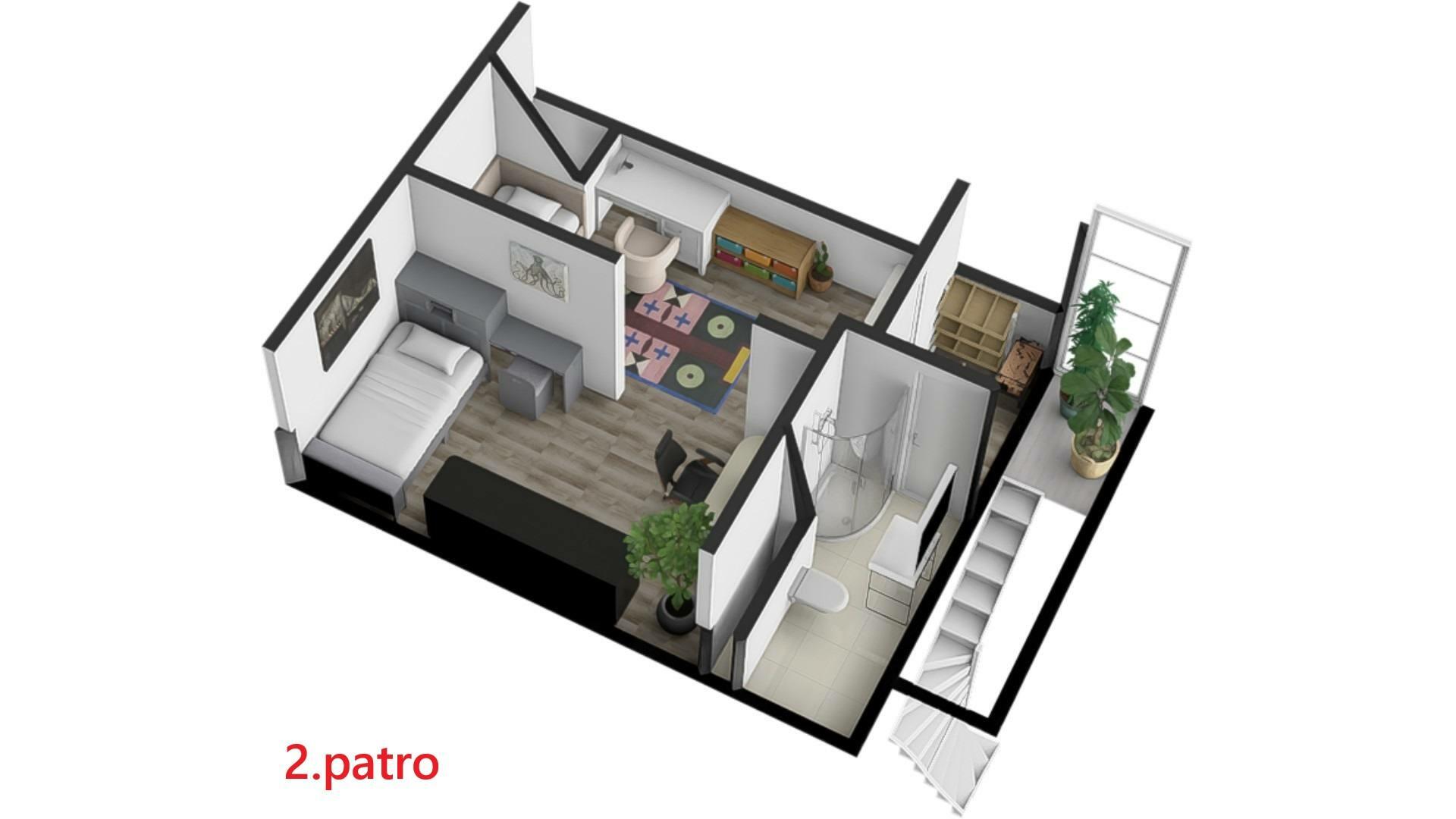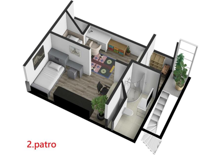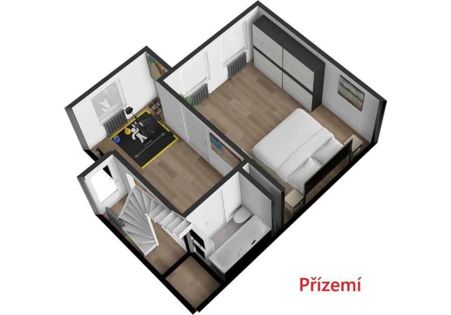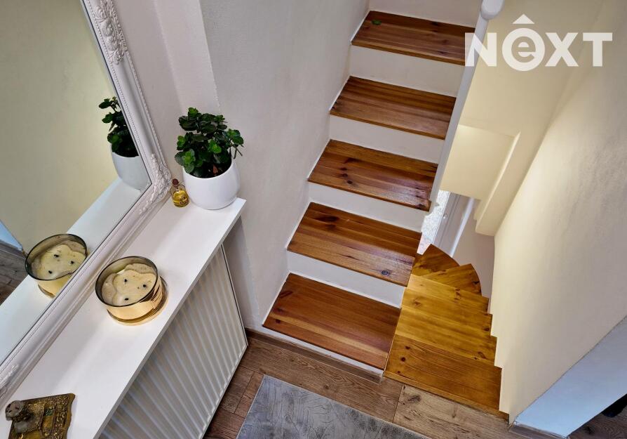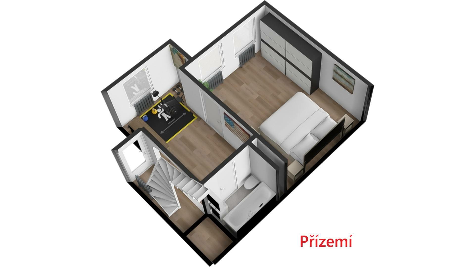 Dům se skládá ze tří pater, kdy ve spodním patře se nachází ložnice, chodba, koupelna s vanou, toaletou a umyvadlem, dále vstup na zahradu(terasu). V prvním patře se nachází vstup z hlavní ulice, kde je umístěn obývací pokoj propojený v kuchyňským koutem, který je vybaven chladničkou, myčkou, indukčním sporákem a v prvním patře se nachází koupelna s toaletou, umyvadlem a sprchovým koutem a dva průchozí pokoje.