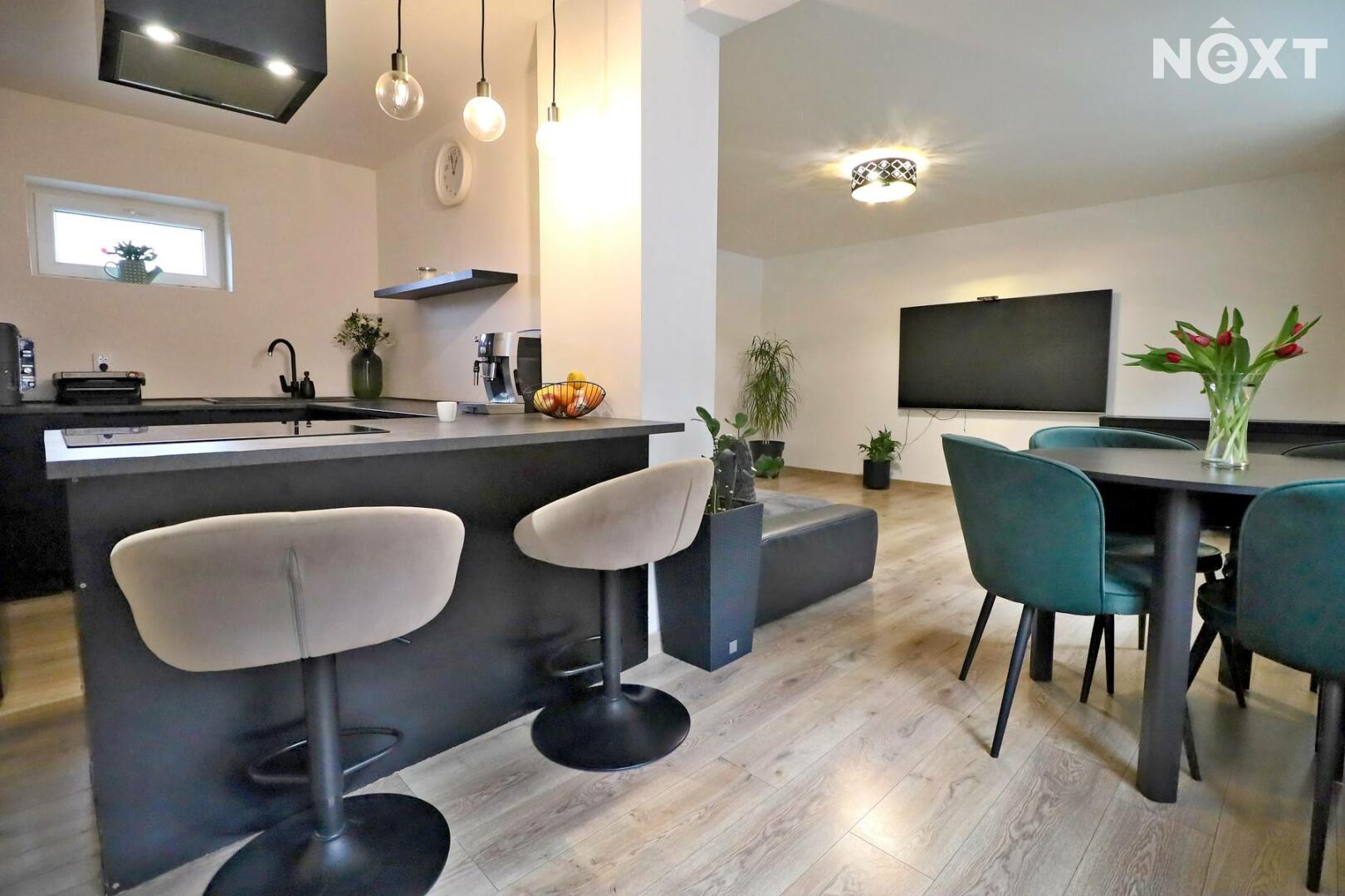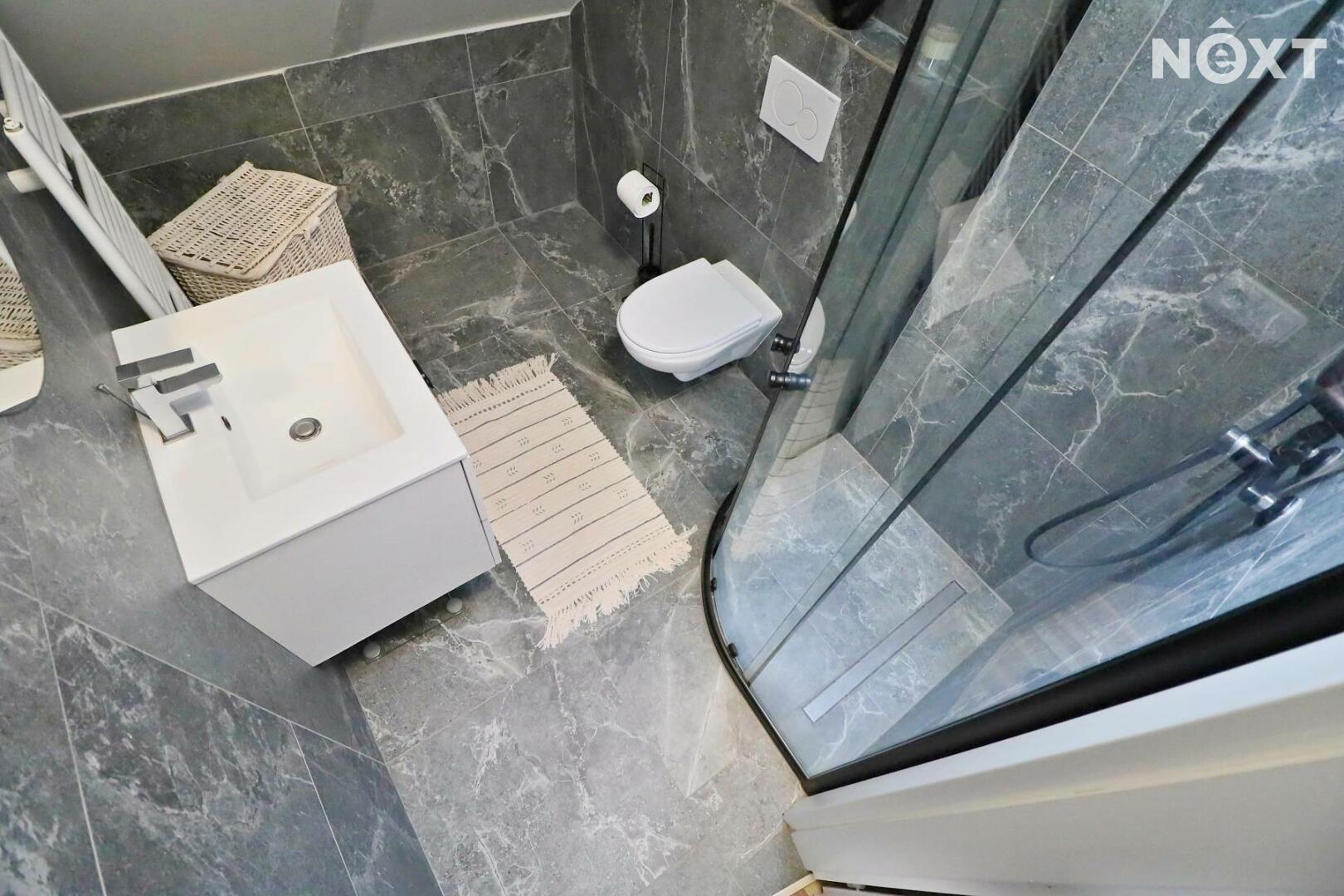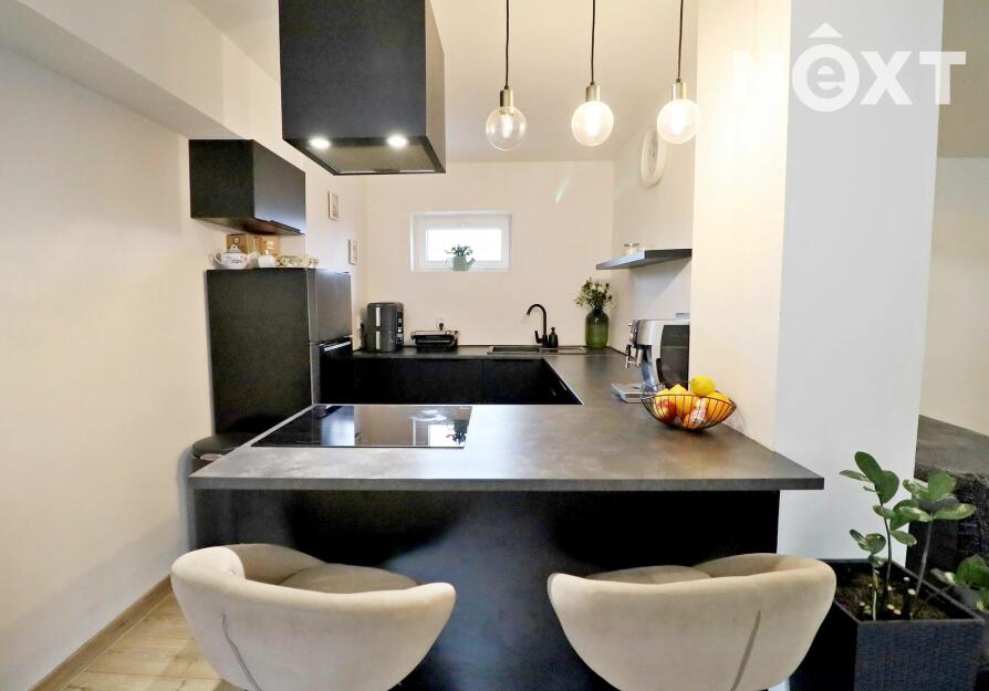 Dům se skládá ze tří pater, kdy ve spodním patře se nachází ložnice, chodba, koupelna s vanou, toaletou a umyvadlem, dále vstup na zahradu(terasu). V prvním patře se nachází vstup z hlavní ulice, kde je umístěn obývací pokoj propojený v kuchyňským koutem, který je vybaven chladničkou, myčkou, indukčním sporákem a v prvním patře se nachází koupelna s toaletou, umyvadlem a sprchovým koutem a dva průchozí pokoje.