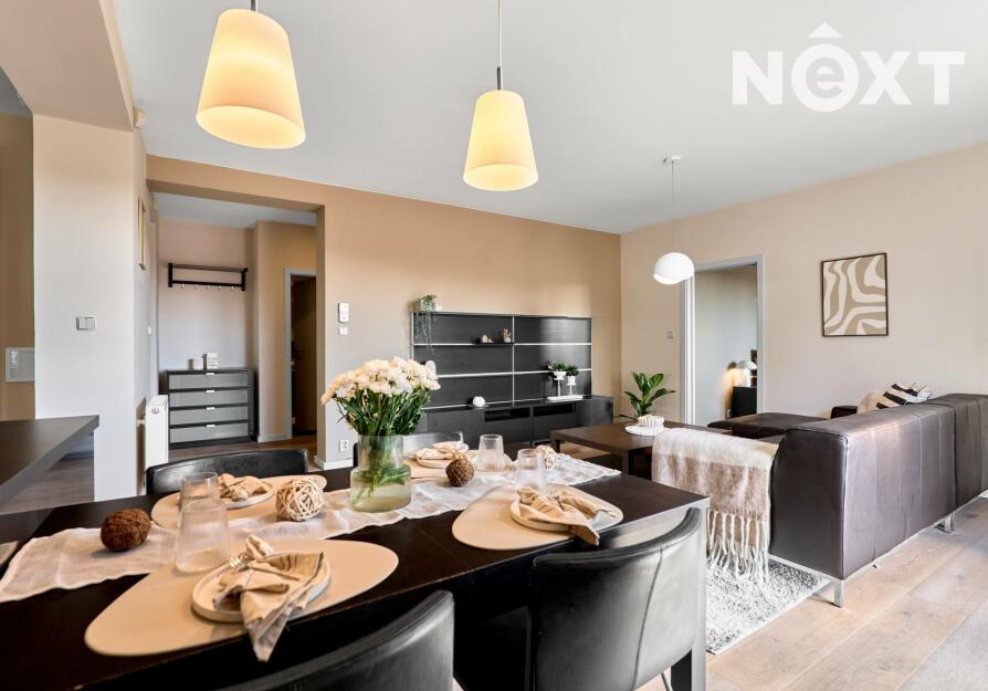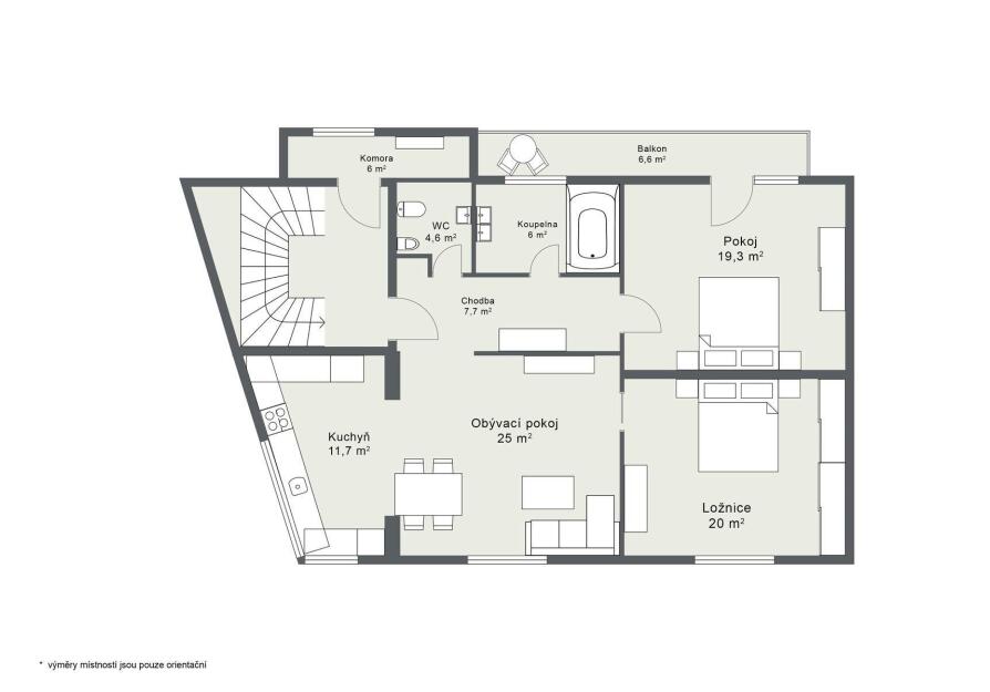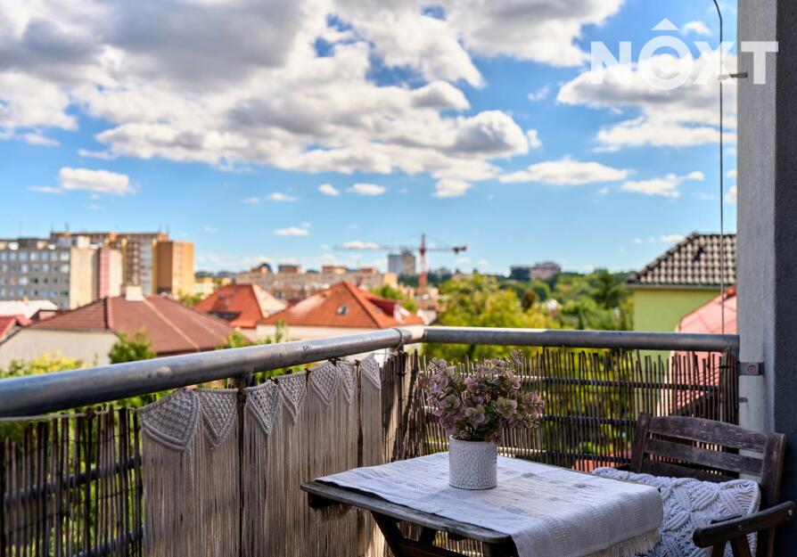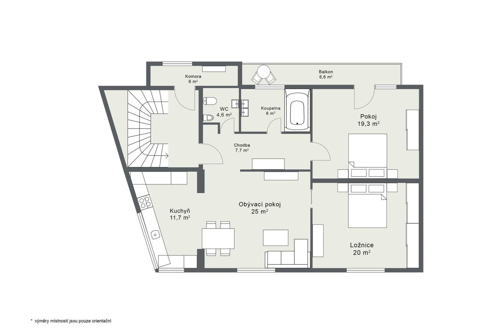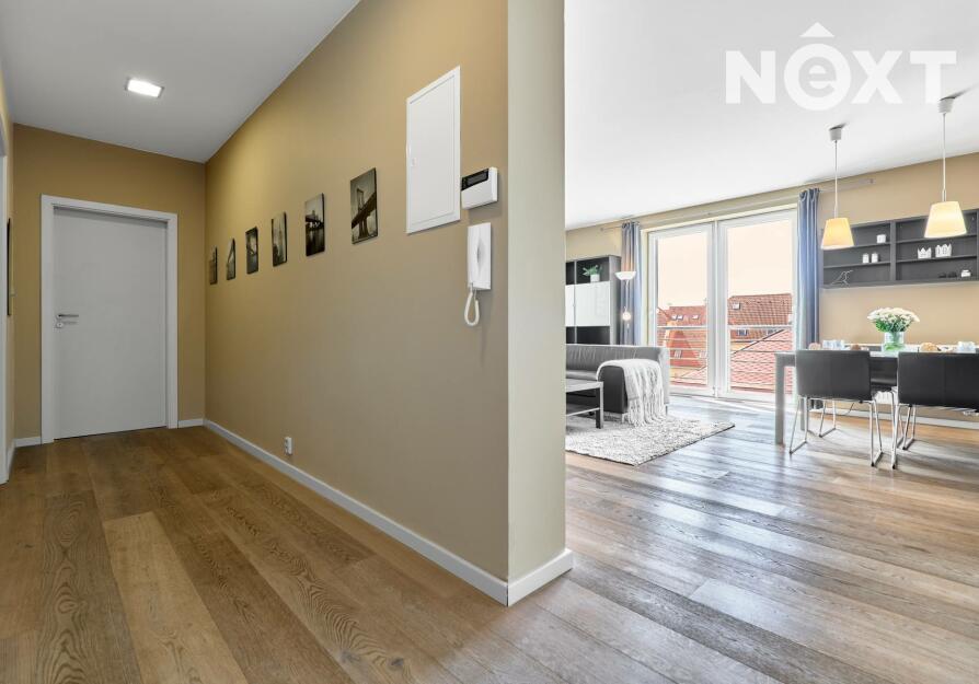 Byt je navržen tak, aby poskytoval maximální komfort i praktické využití. Velkorysý obývací prostor s kuchyňskou linkou na míru je prosvětlený díky velkým oknům s příjemným výhledem. Dvě prostorné ložnice nabízejí dostatek soukromí, přičemž jedna z nich má přístup na vlastní balkón orientovaný na severovýchod. Součástí bytu je také komora umístěná hned vedle bytu na patře, ideální pro pračku, sušičku i úložné prostory.