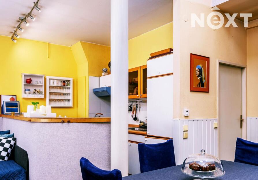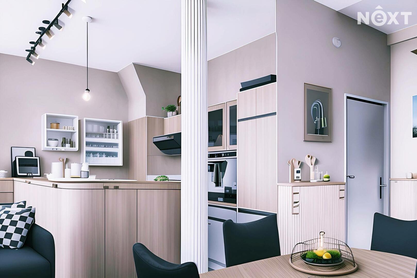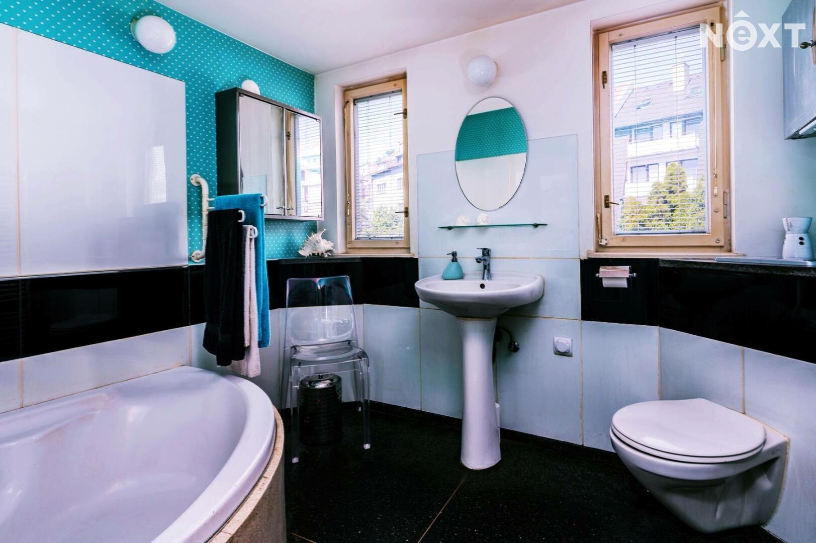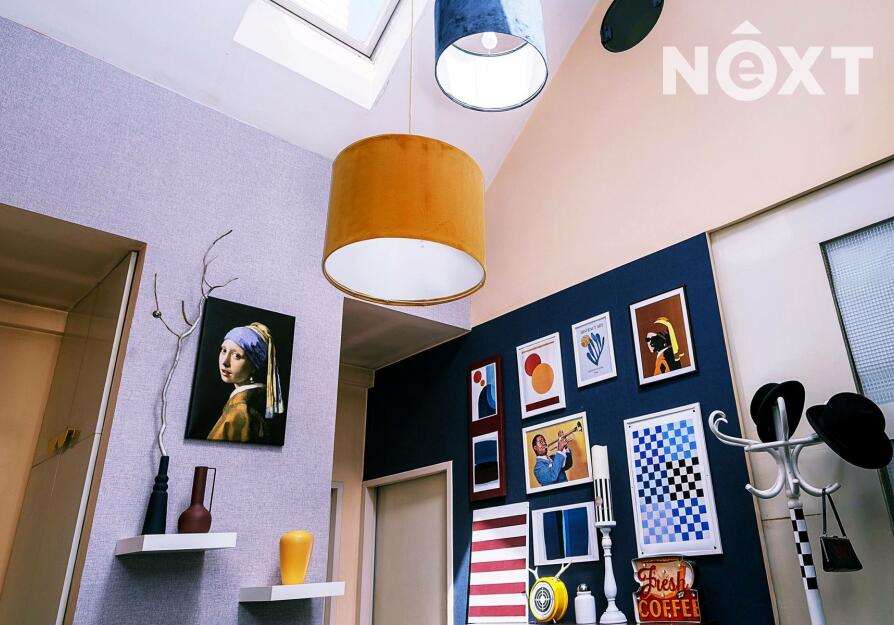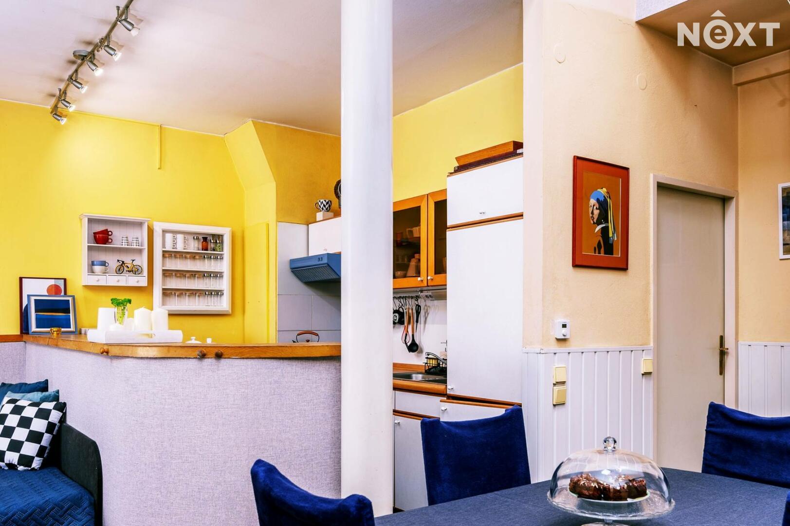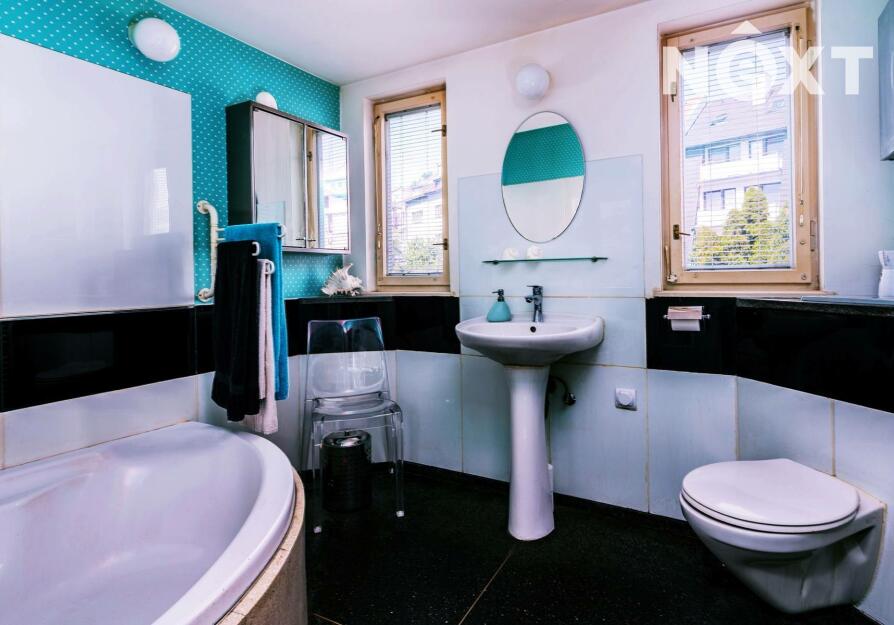 Dominantou je vysoký strop ve vzdušné vstupní hale, na kterou navazuje kuchyňský kout i obývací prostor, a pak dveře dalších místností. Byt nabízí dostatek úložných prostor – vestavěné skříně, knihovnu, zrcadlovou niku, praktické výklenky. Komfort zvyšuje rohová vana, ale i netradiční prvky jako bytelná hrazda nebo ribstol pro domácí cvičení. Na podlahách najdete kombinaci dřevěných parket a vyhřívaného teraca. O vytápění i ohřev vody se stará vlastní plynový kotel, důmyslně ukrytý tak, aby nerušil interiér.