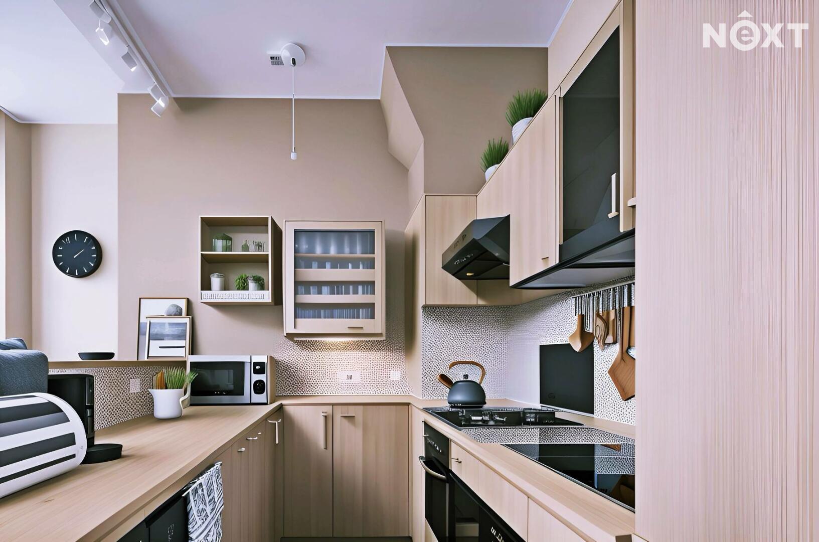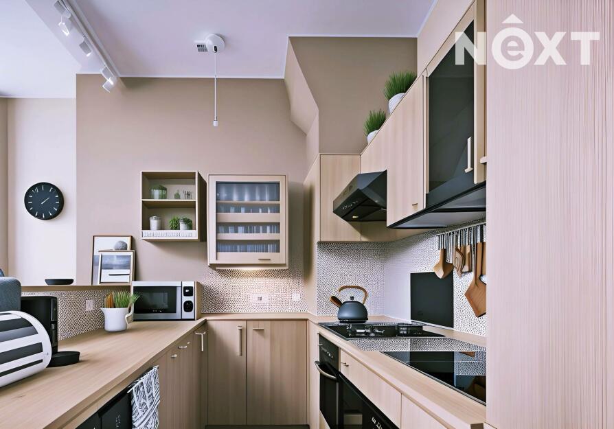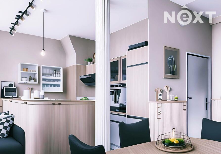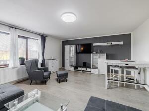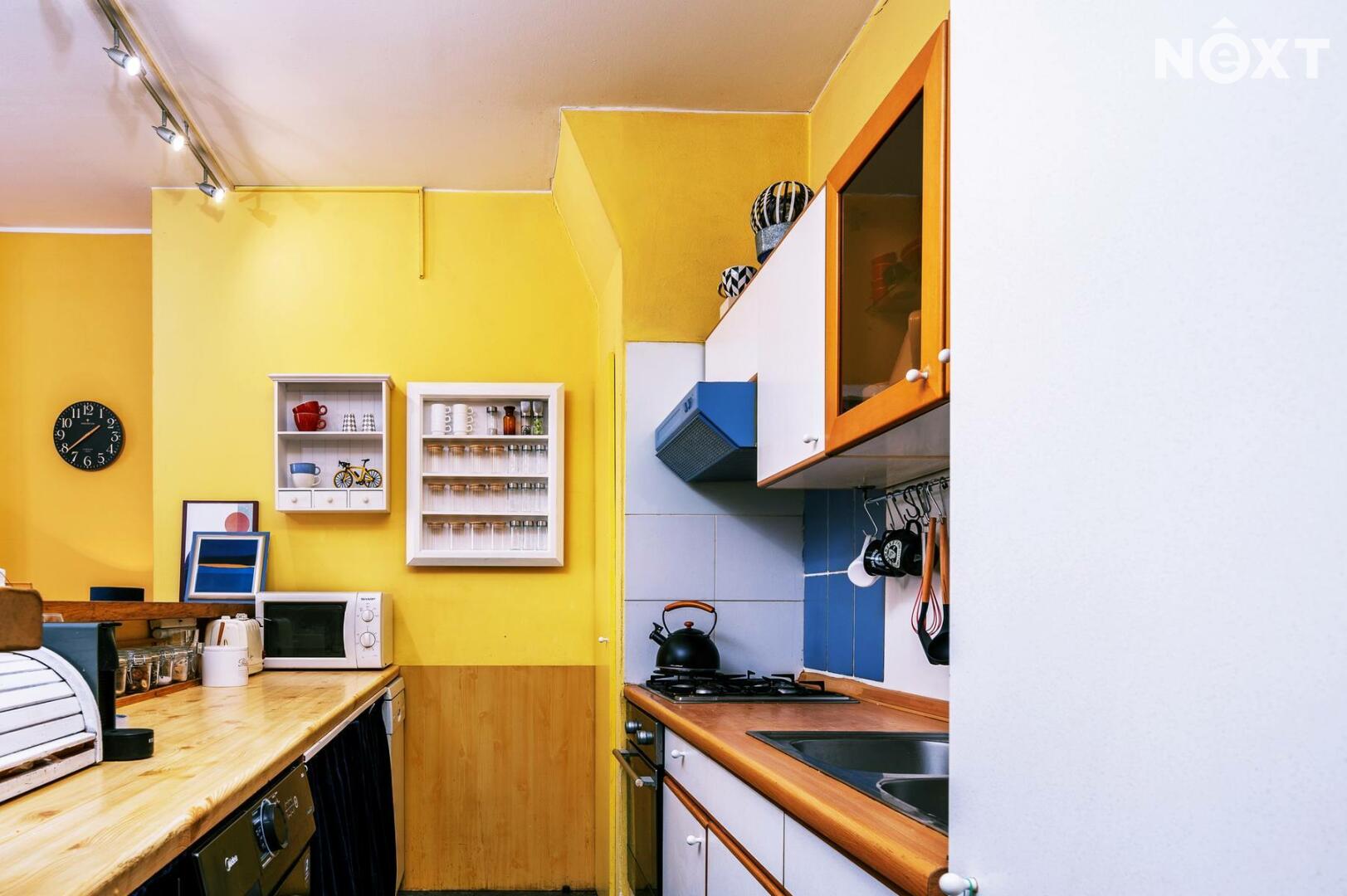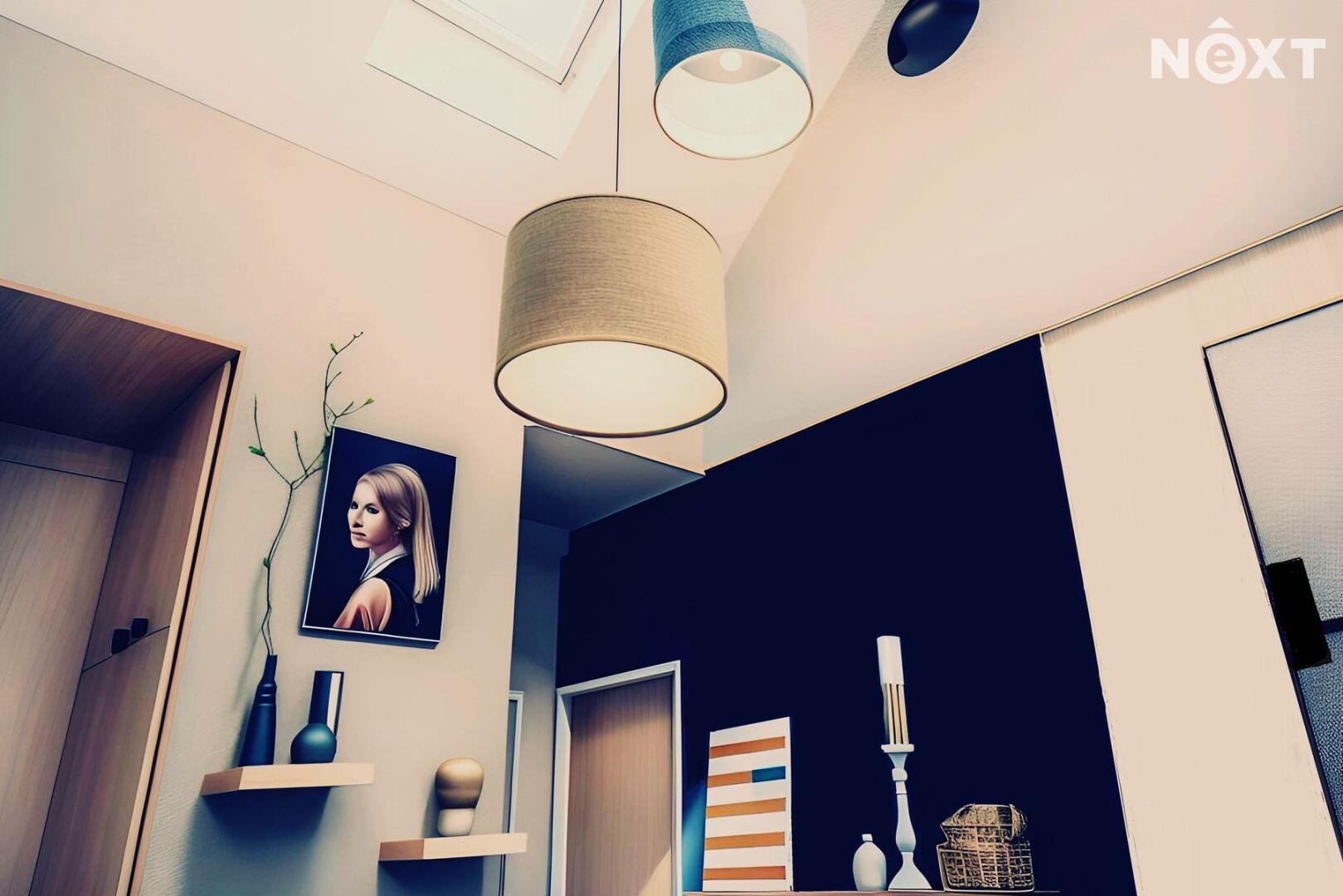 Dominantou je vysoký strop ve vzdušné vstupní hale, na kterou navazuje kuchyňský kout i obývací prostor, a pak dveře dalších místností. Byt nabízí dostatek úložných prostor – vestavěné skříně, knihovnu, zrcadlovou niku, praktické výklenky. Komfort zvyšuje rohová vana, ale i netradiční prvky jako bytelná hrazda nebo ribstol pro domácí cvičení. Na podlahách najdete kombinaci dřevěných parket a vyhřívaného teraca. O vytápění i ohřev vody se stará vlastní plynový kotel, důmyslně ukrytý tak, aby nerušil interiér.