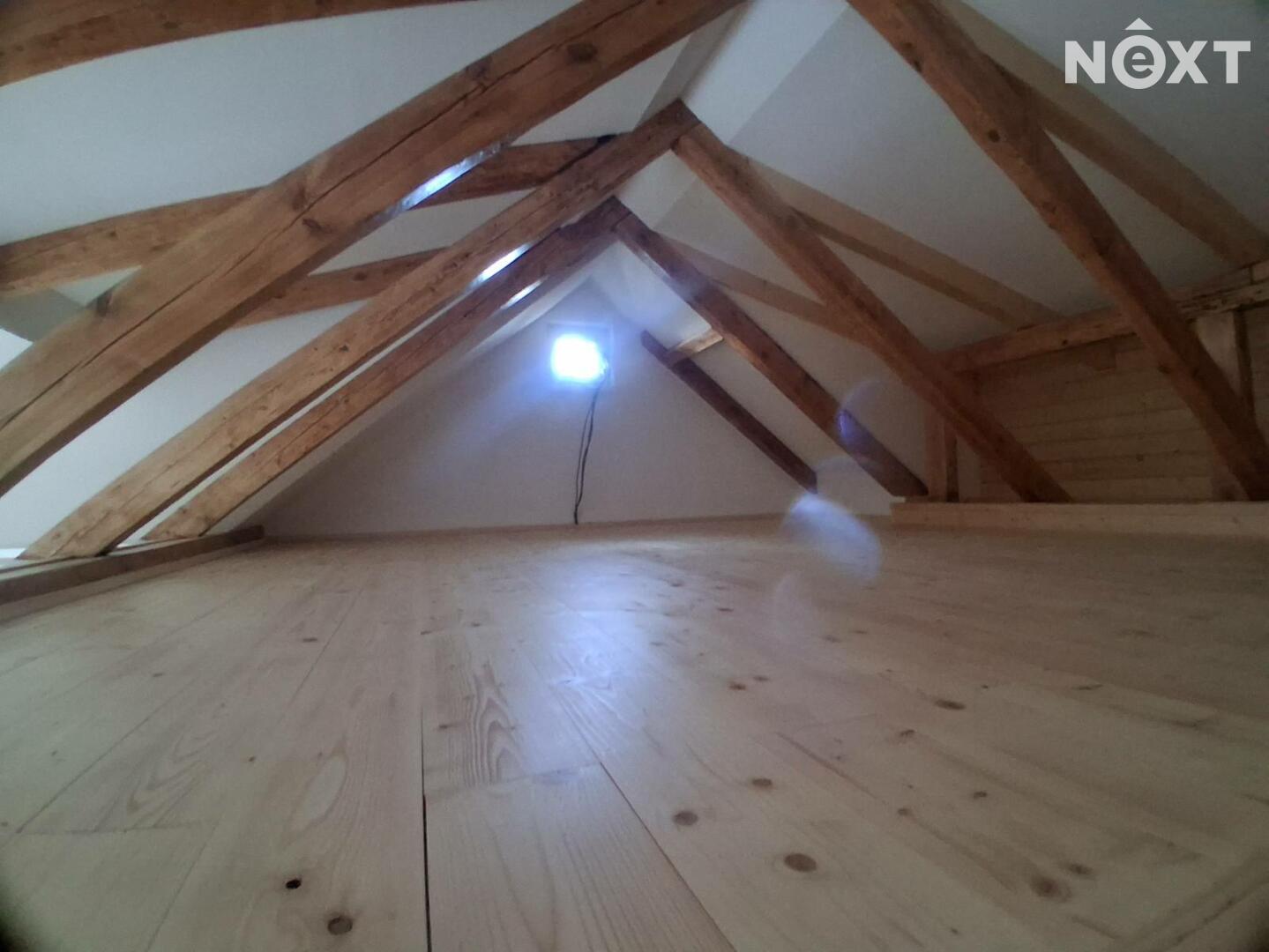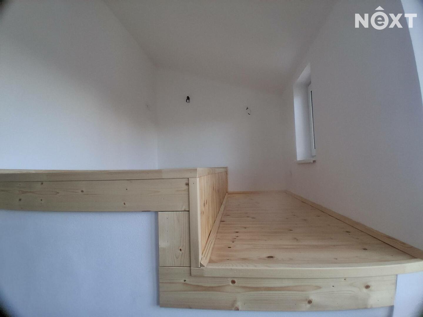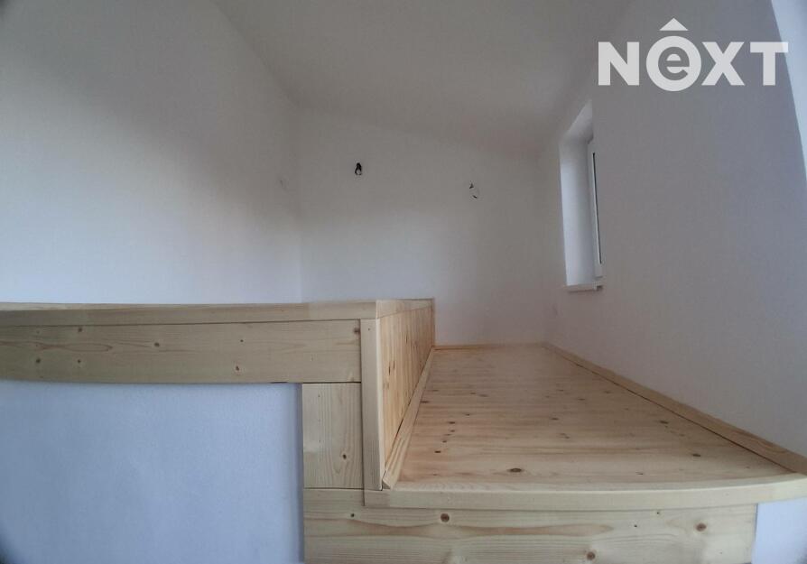 Dominantou bytu je světlý obytný prostor s kuchyňským koutem a otevřeným vstupem do mezonetové ložnice. Spaní v horním patře, přístupné po elegantních dřevěných schodech, vytváří pocit soukromí a dodává interiéru jedinečnou atmosféru loftového bydlení.