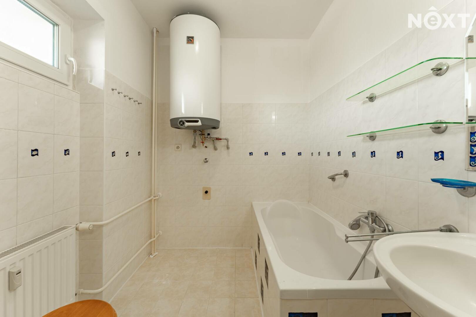 Vytápění je ústřední dálkové, ohřev vody zajišťuje elektrický bojler umístěný v koupelně.