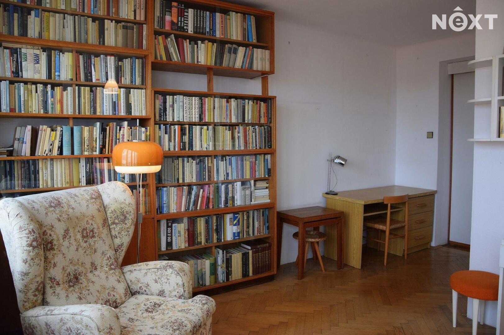 Z kuchyně je vstup do obývacího pokoje, který nabízí dostatek prostoru pro obytnou - relaxační část s pohovkou a knihovnou i pro pracovní kout.