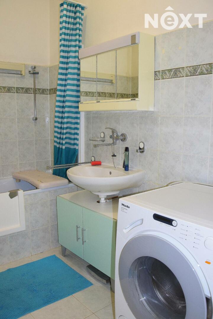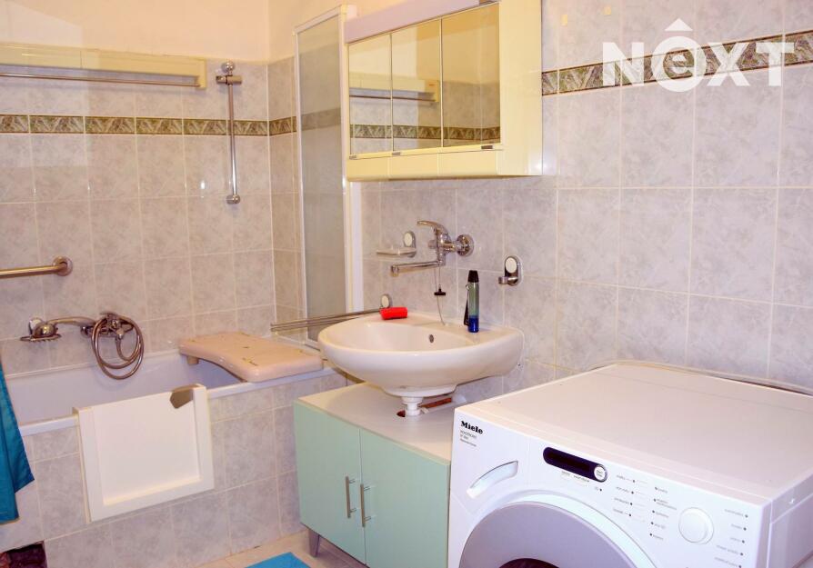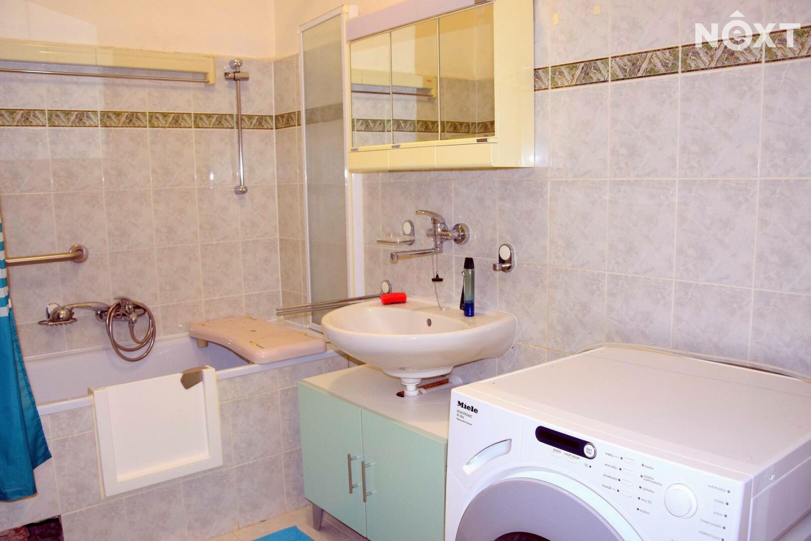 Koupelna je vybavena vanou, zrcadlovou skříňkou a pračkou Miele, toaleta odvětraná oknem je samostatná.