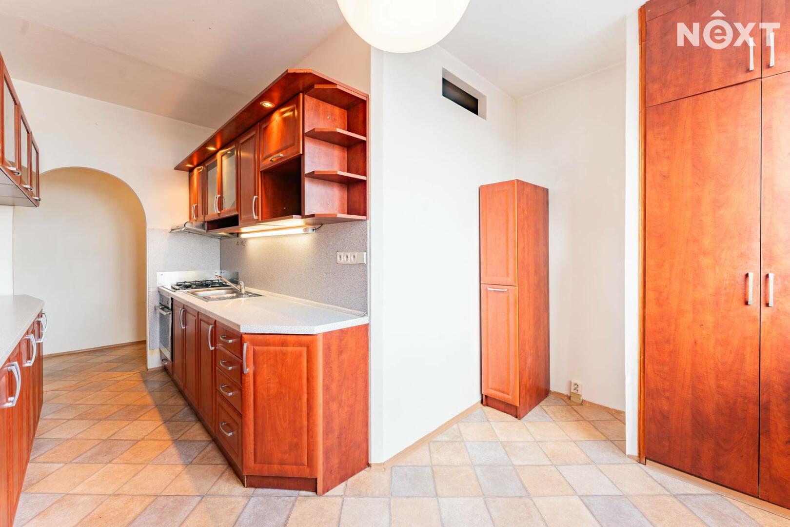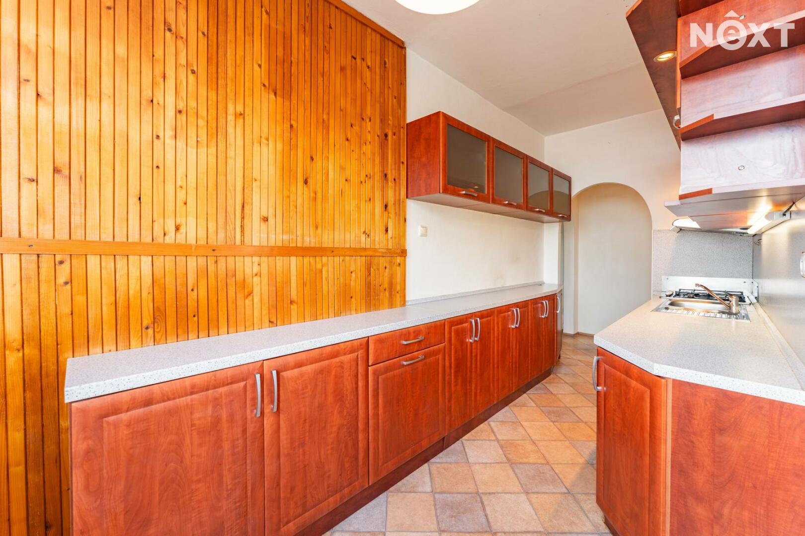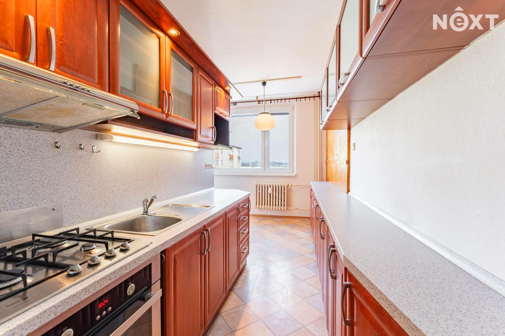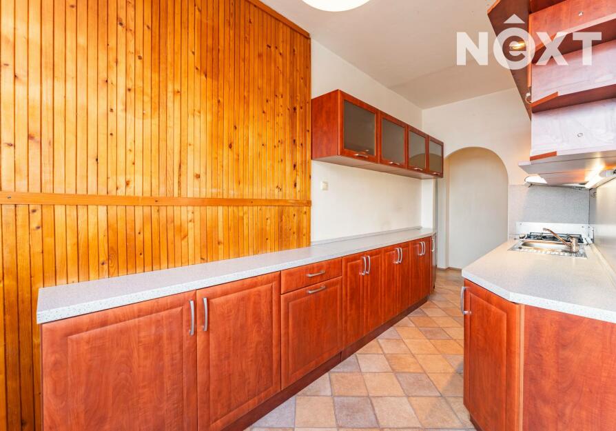 Byt je ve velmi zachovalém stavu. Dispozice zahrnuje koupelnu s toaletou, kuchyni s jídelním koutem a tři pokoje, z nichž jeden je průchozí. Z jednoho pokoje je vstup na zasklenou lodžii. Praktická šatna potěší každého, kdo ocení dostatek úložného prostoru. Součástí je také sklepní kóje.