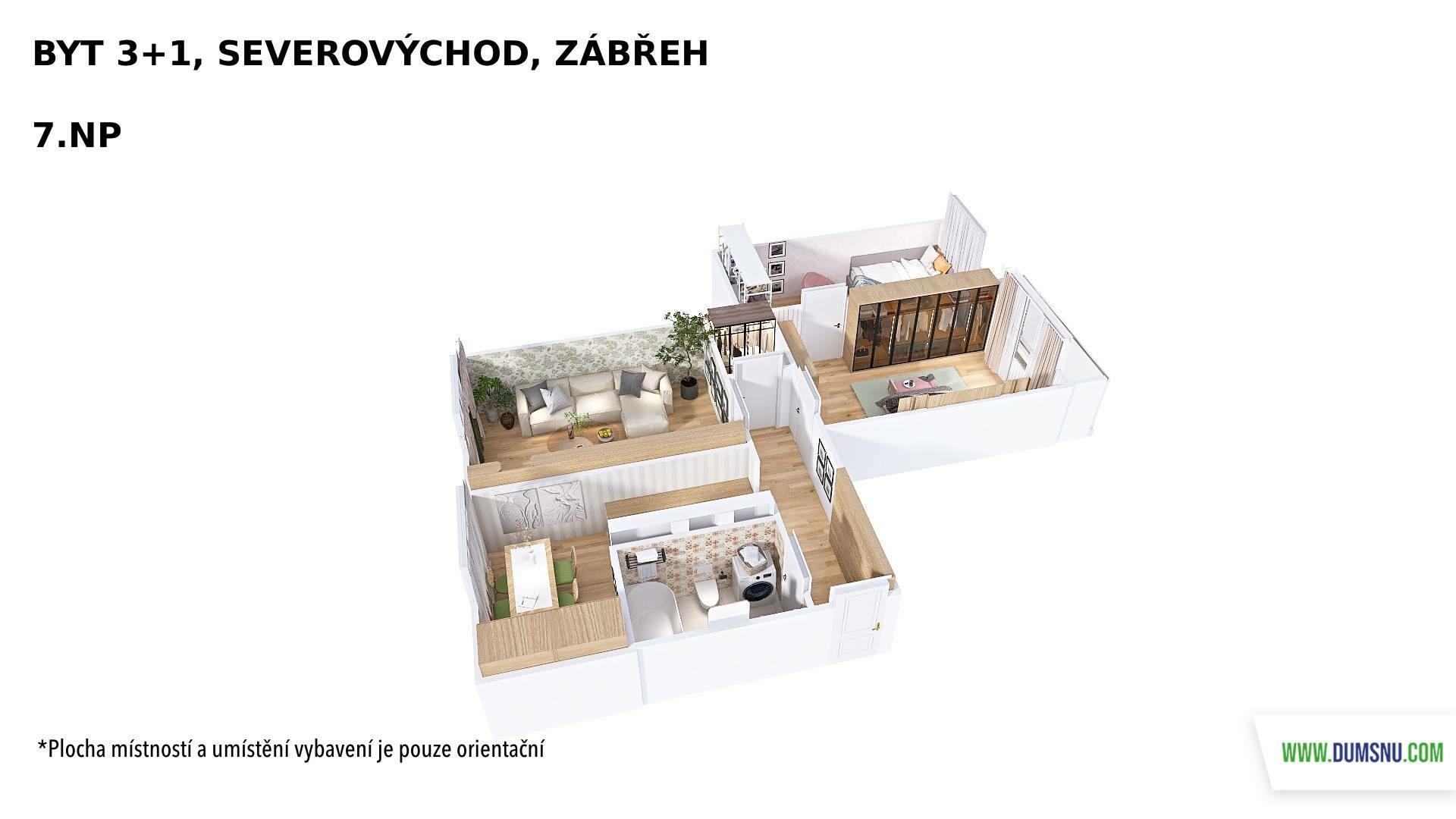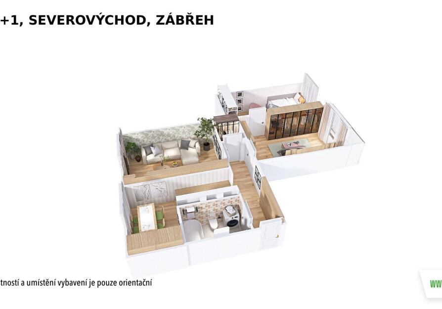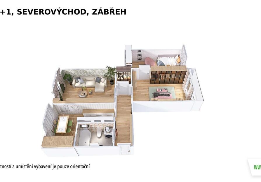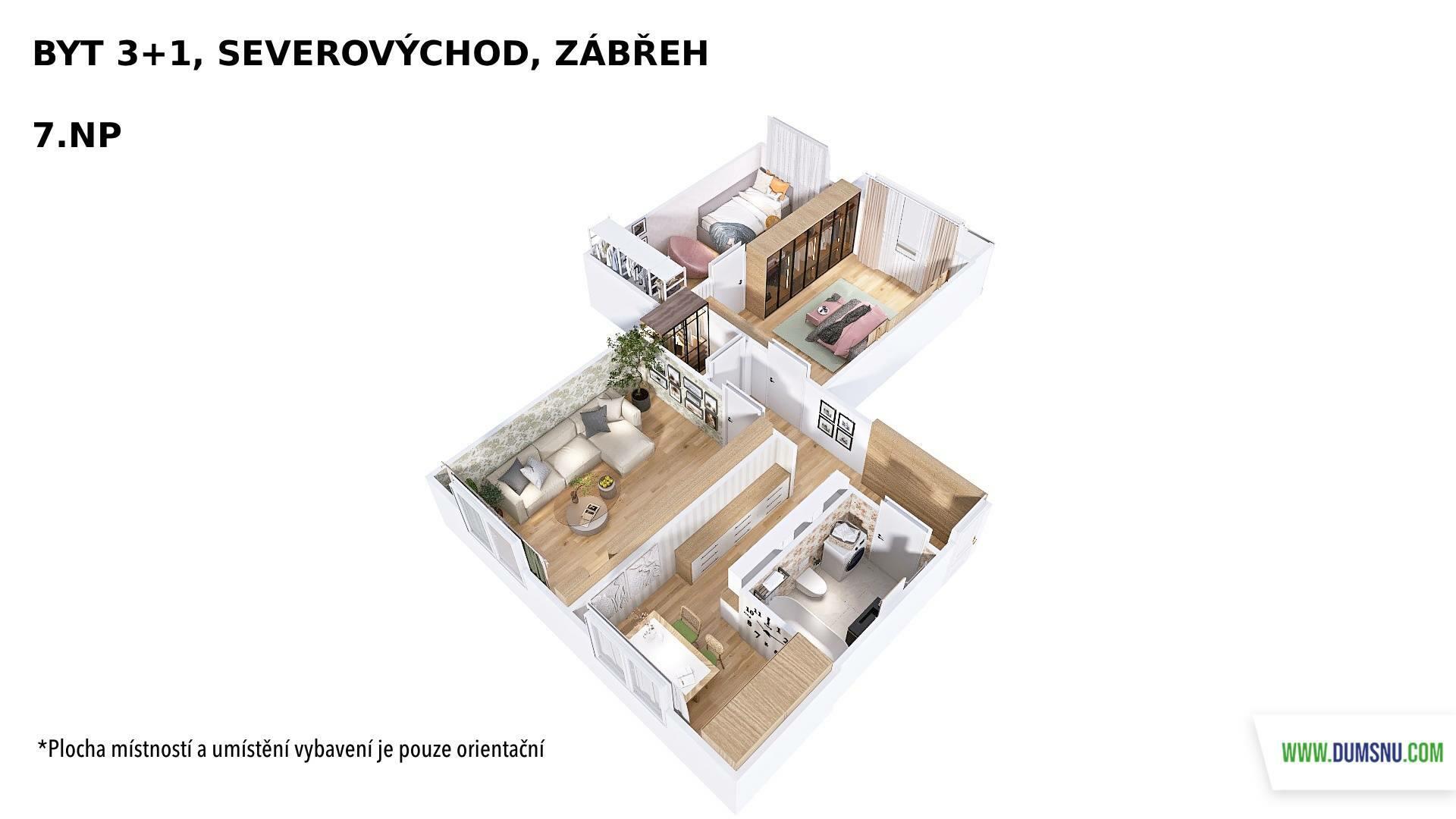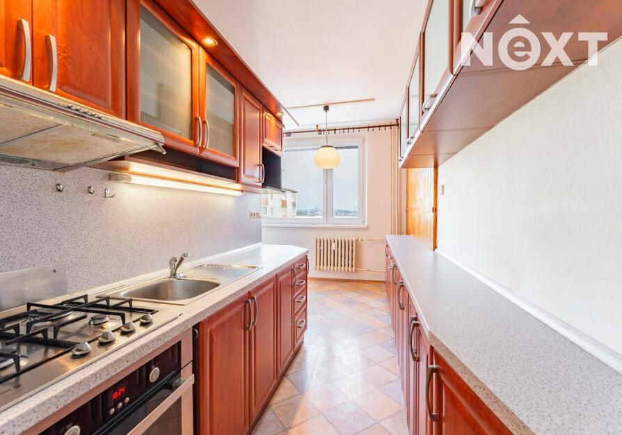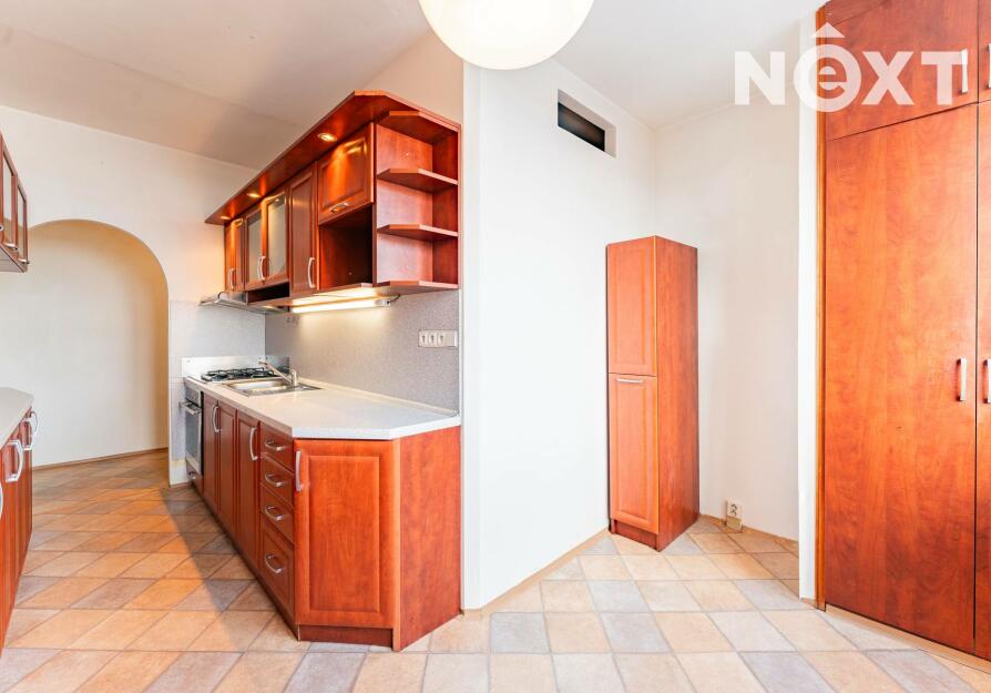 Byt je ve velmi zachovalém stavu. Dispozice zahrnuje koupelnu s toaletou, kuchyni s jídelním koutem a tři pokoje, z nichž jeden je průchozí. Z jednoho pokoje je vstup na zasklenou lodžii. Praktická šatna potěší každého, kdo ocení dostatek úložného prostoru. Součástí je také sklepní kóje.