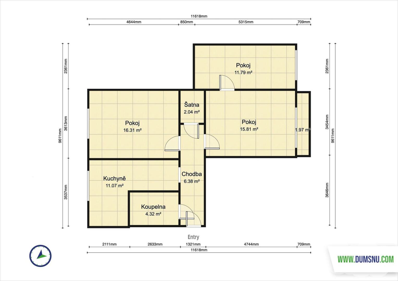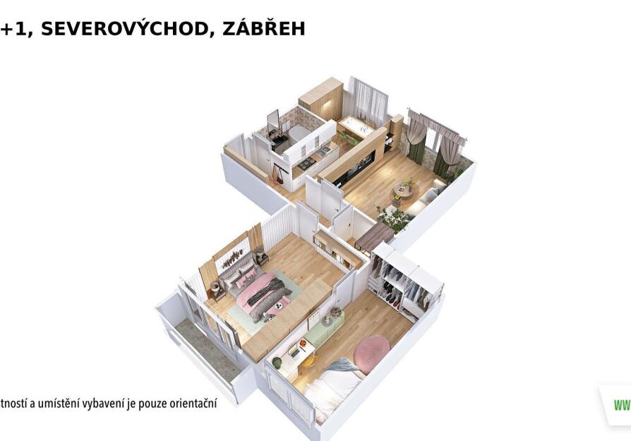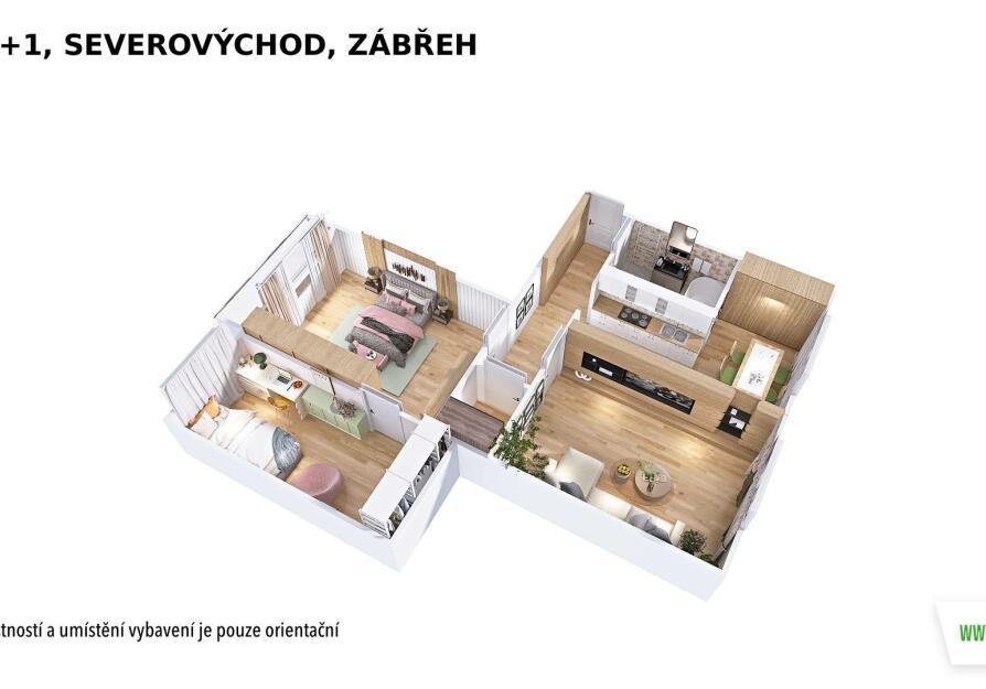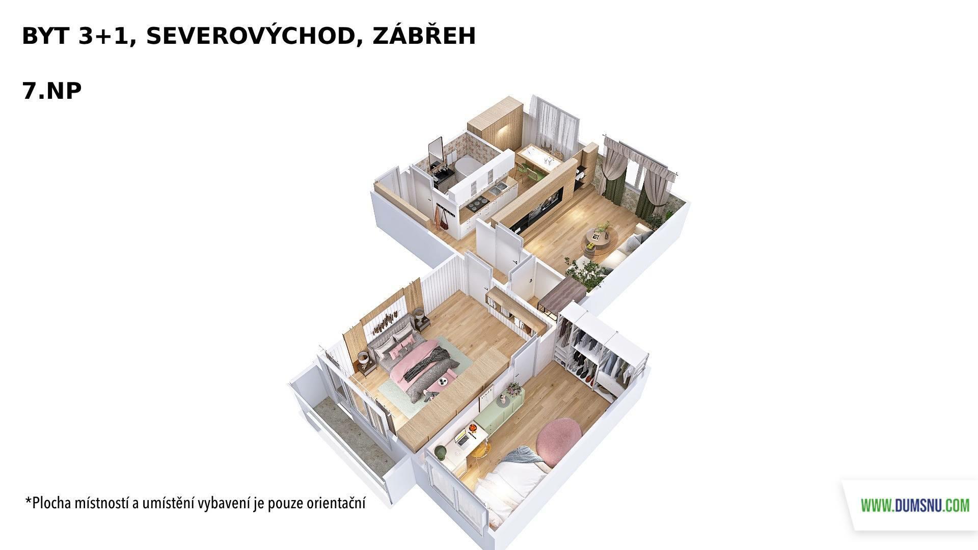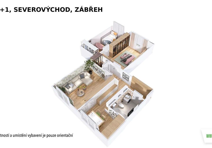 Byt je ve velmi zachovalém stavu. Dispozice zahrnuje koupelnu s toaletou, kuchyni s jídelním koutem a tři pokoje, z nichž jeden je průchozí. Z jednoho pokoje je vstup na zasklenou lodžii. Praktická šatna potěší každého, kdo ocení dostatek úložného prostoru. Součástí je také sklepní kóje.