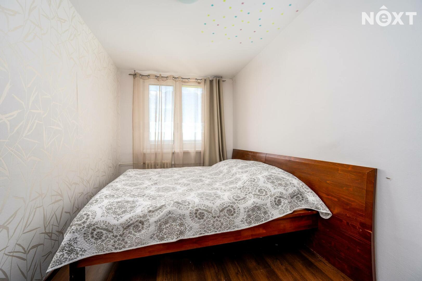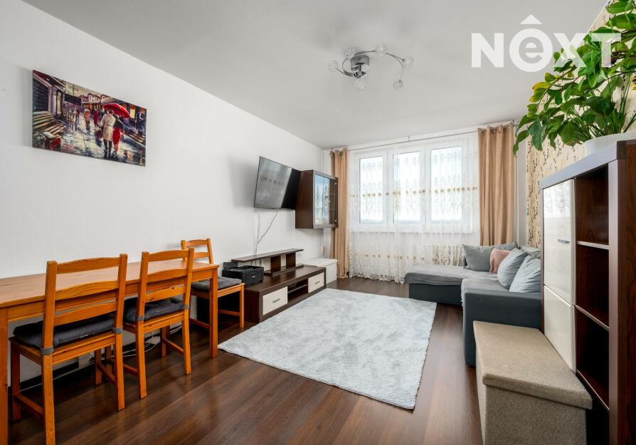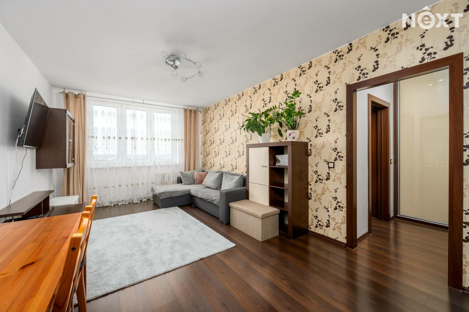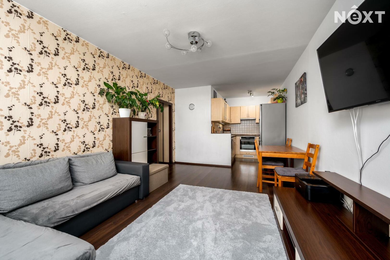 Nabízí praktickou a příjemnou dispozici – prostorný obývací pokoj s kuchyňským koutem a samostatnou ložnici. Z předsíně s vestavěnými skříněmi je vstup do koupelny se sprchovým koutem, toaleta je zvlášť. Okna jsou plastová, na podlahách je plovoucí podlaha, vytápění i ohřev vody jsou řešeny dálkově.