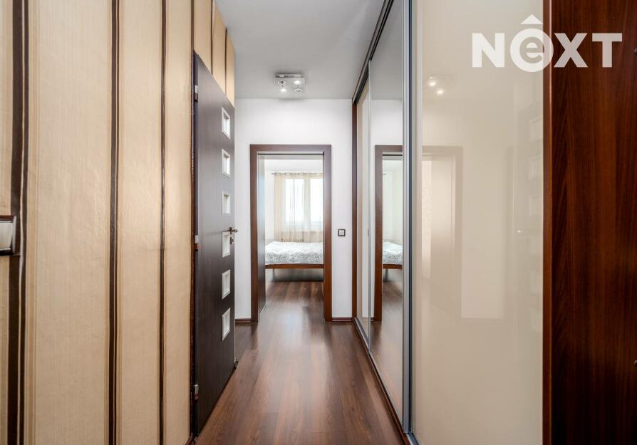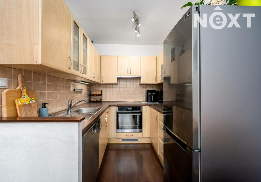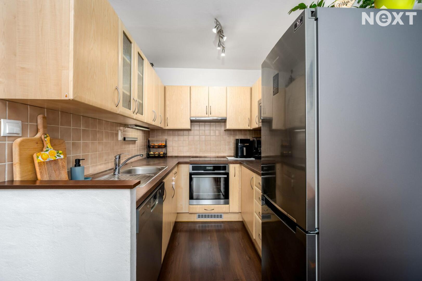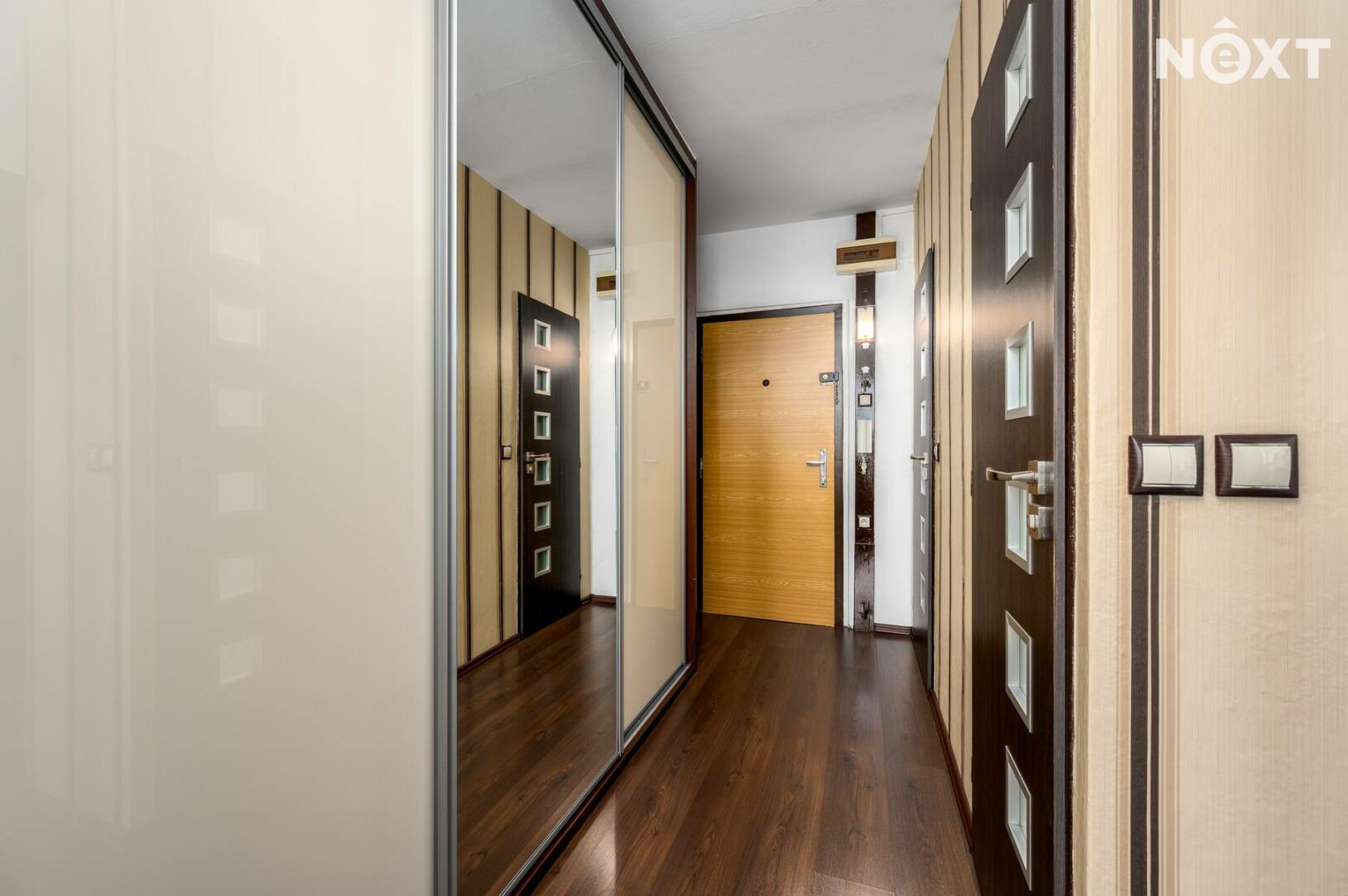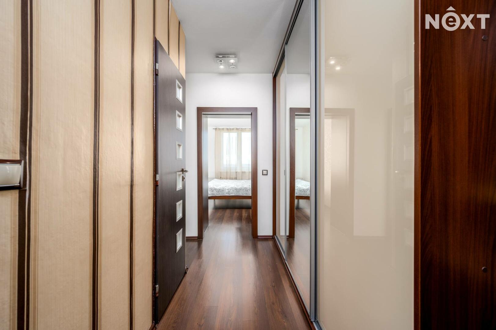 Interiér prošel rekonstrukcí, která zahrnovala zděné jádro, nové rozvody elektřiny v kuchyni, podlahy, vestavěný nábytek, vnitřní dveře. K bytu náleží také sklepní kóje (3,80 m2).
