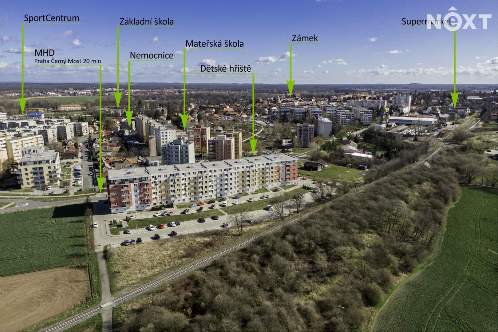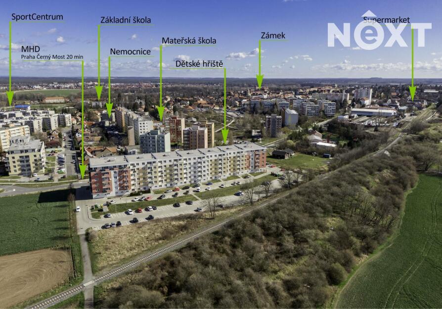Lokalita nabízí kompletní občanskou vybavenost. Dům se nachází na okraji města v bezprostřední blízkosti autobusové zastávky „V Olšinkách“ s přímým spojením do Prahy (cca 20 minut na metro Černý Most). Autem jste v Praze přibližně za 13 minut. V pěší dostupnosti je mateřská škola (200 m), základní škola (600 m), nemocnice (300 m), sportovní centrum (400 m) a přímo u domu navazuje cyklostezka.