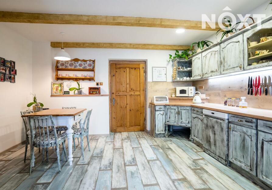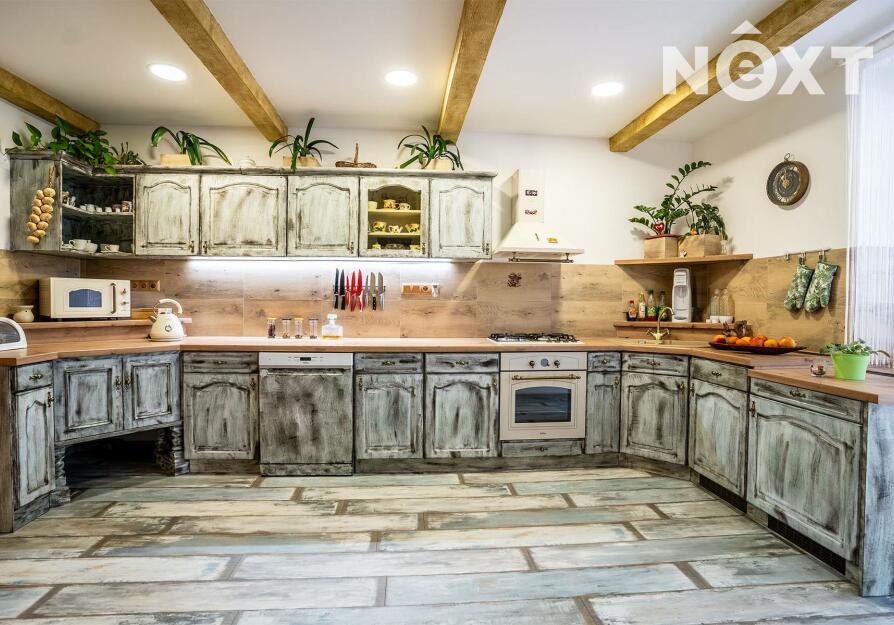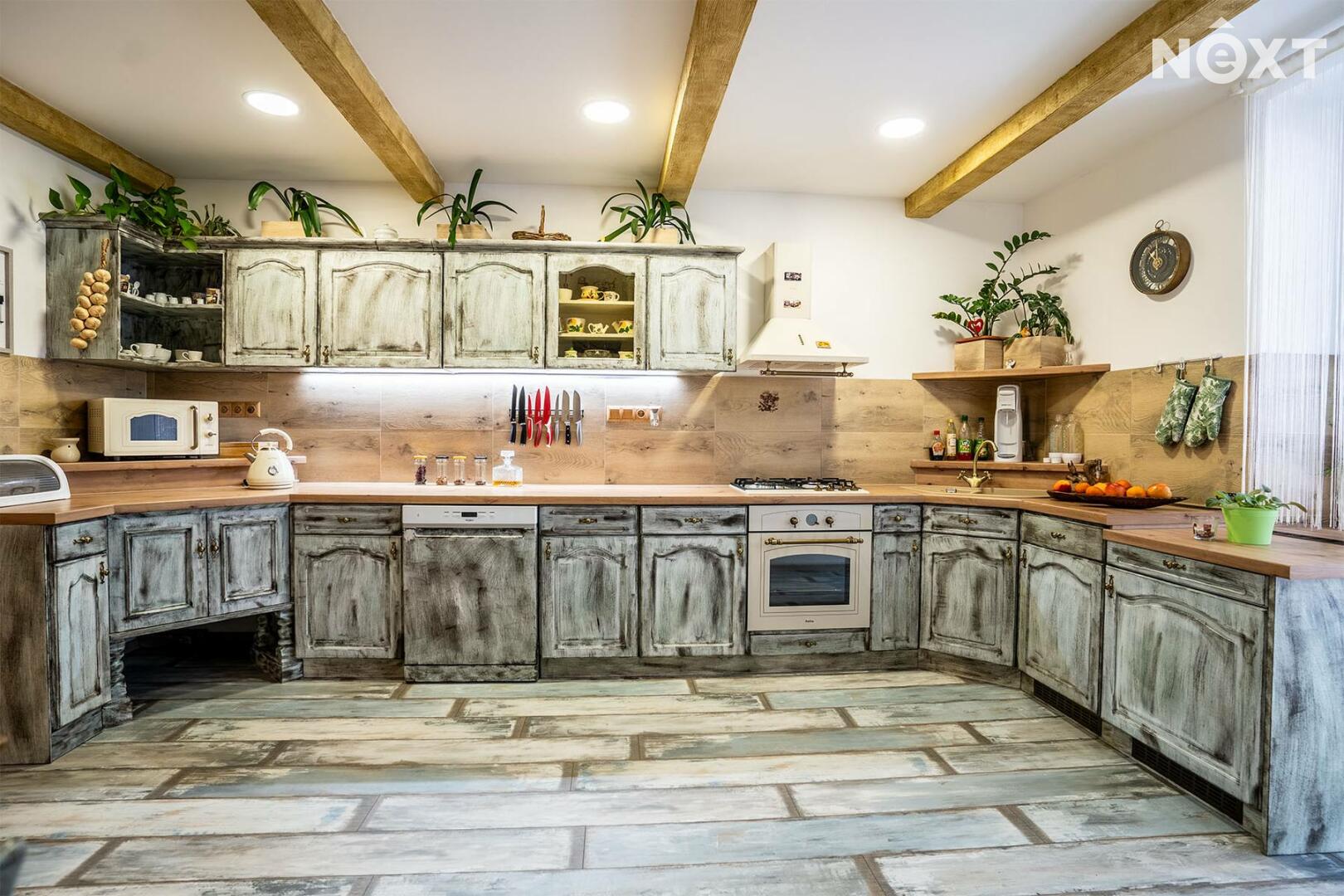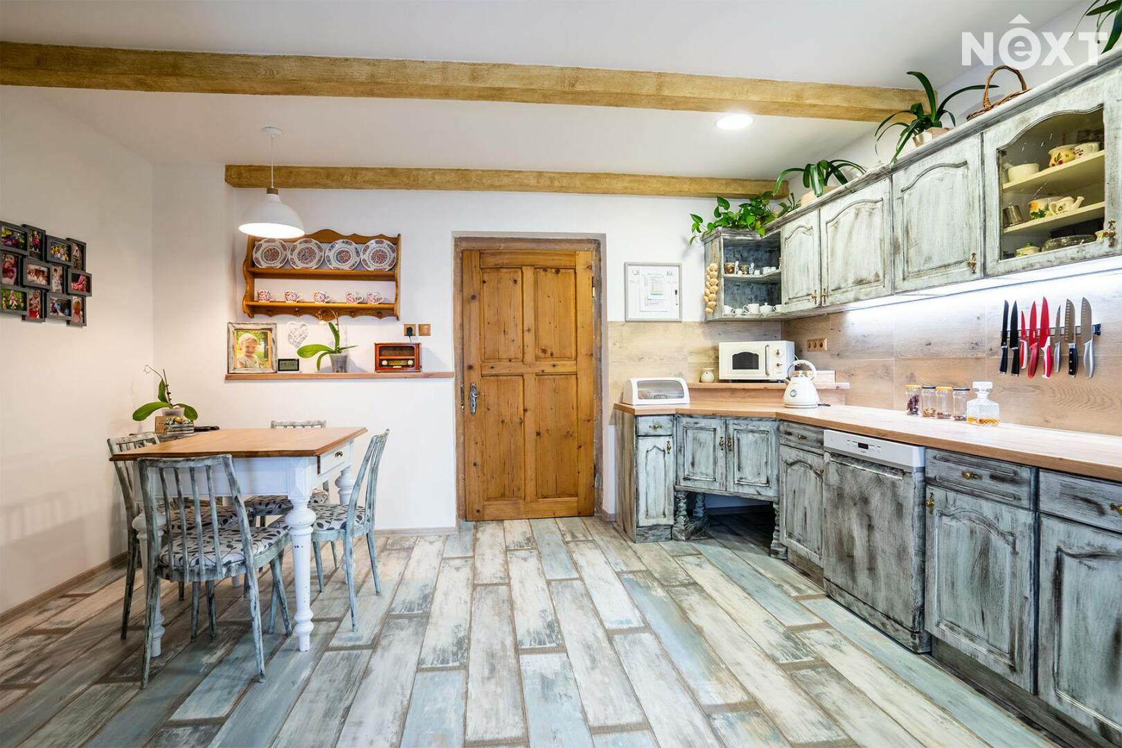 Kuchyně je zařízená rustikální linkou, má spíž a vejde se sem i velký jídelní stůl, u kterého se v pohodě usadí početná rodina. A když bude venku hezky, stačí otevřít dveře a přesunout se na zastřešenou verandu.
