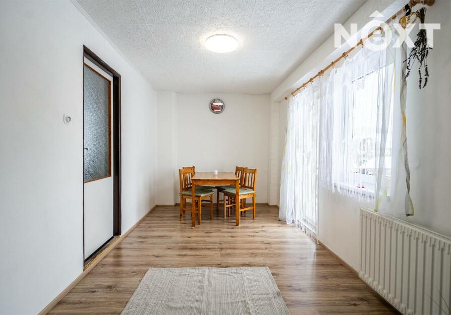 Byt v přízemí má dispozici 3+1. Je tu kuchyně s jídelnou, obývák a dva pokoje. Všechny místnosti jsou navzájem průchozí, takže děti budete mít vždy na dohled.