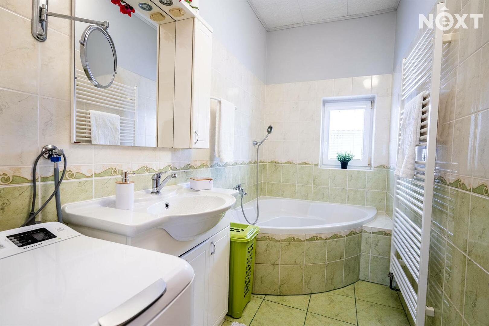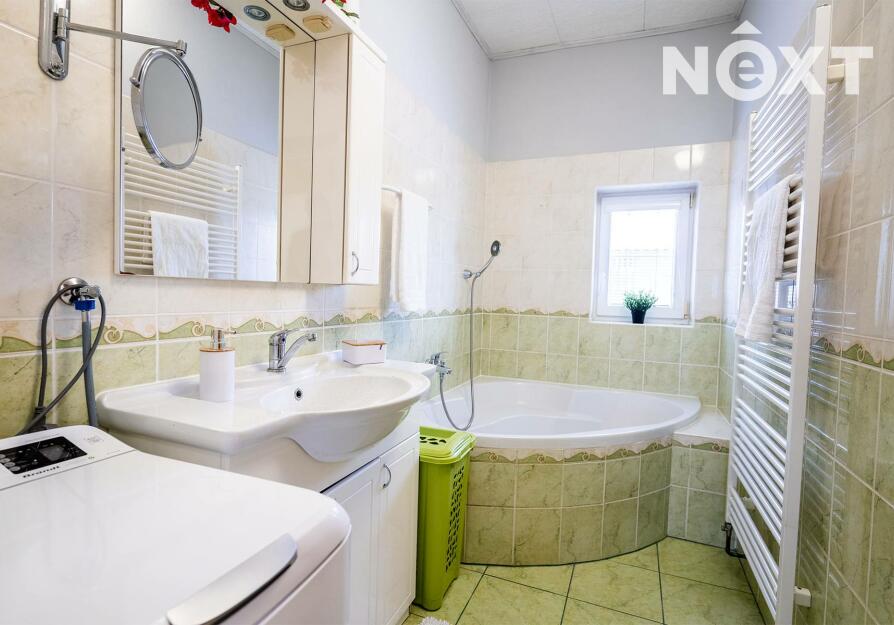 V koupelně je rohová vana i prostor na pračku, toaleta je samostatná. Vedle koupelny je kumbál.