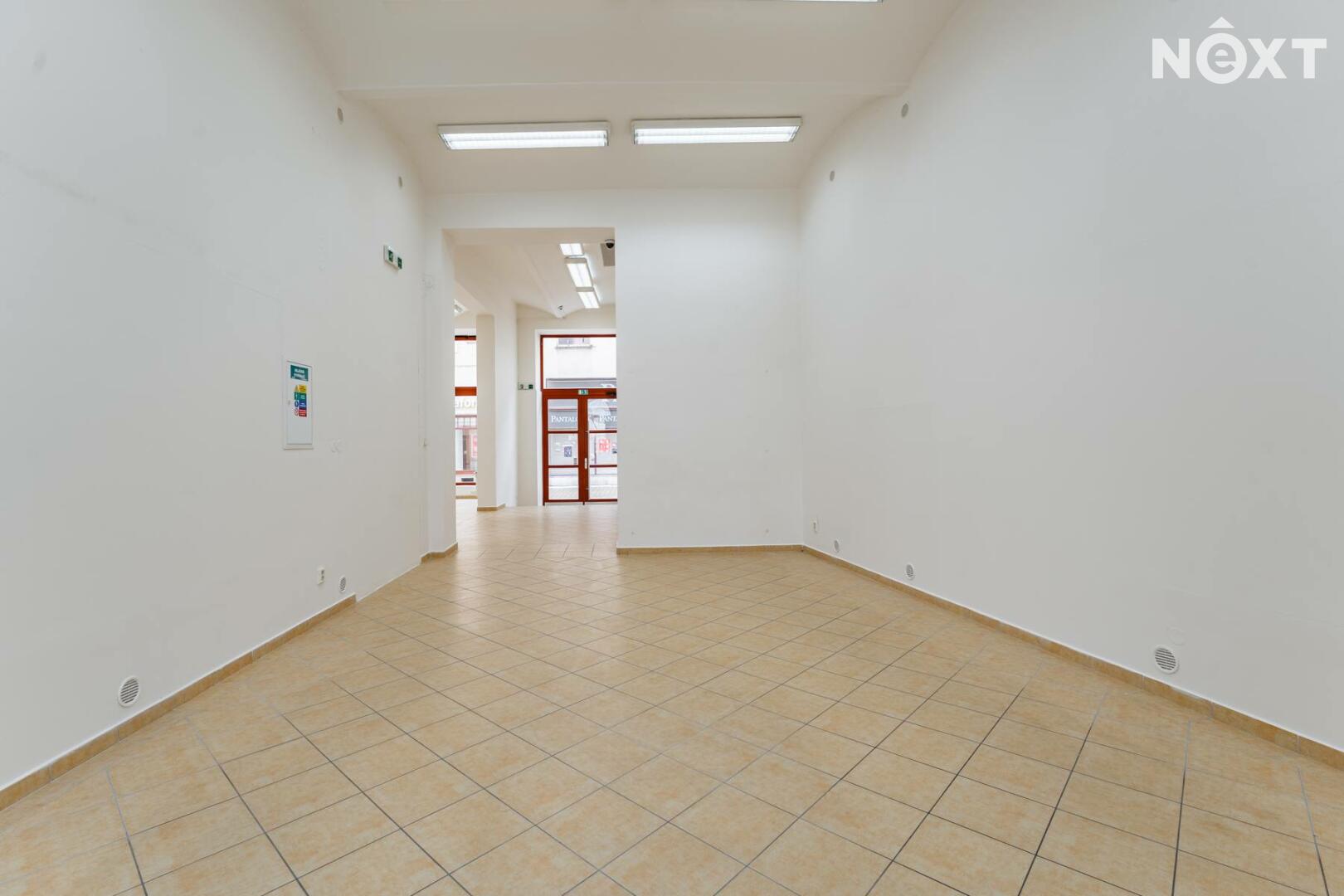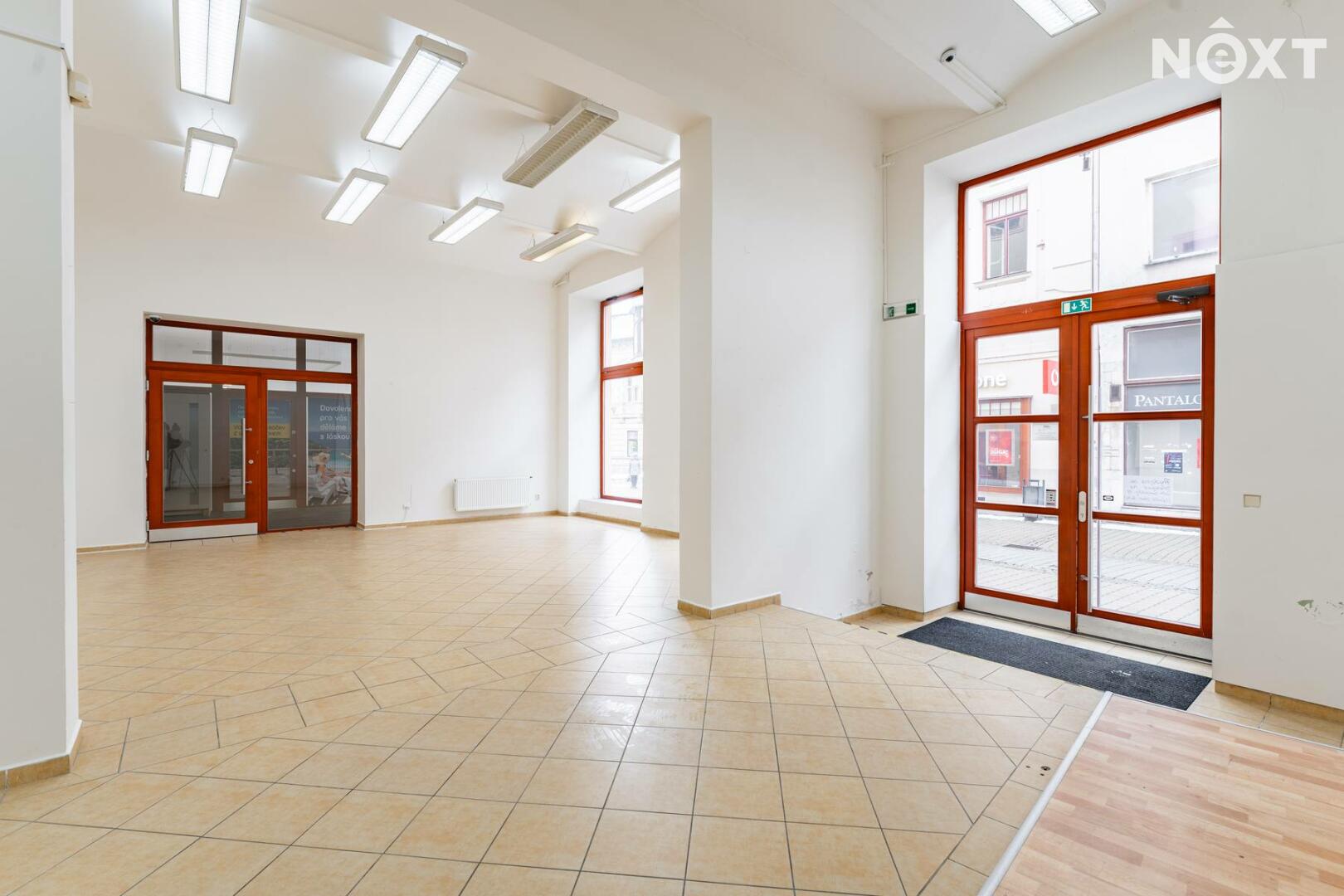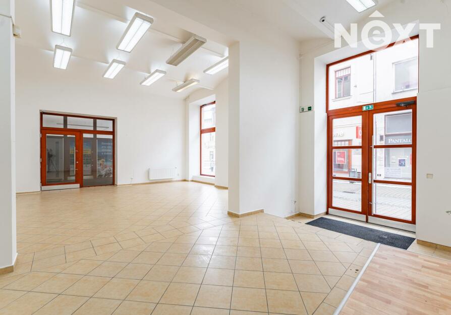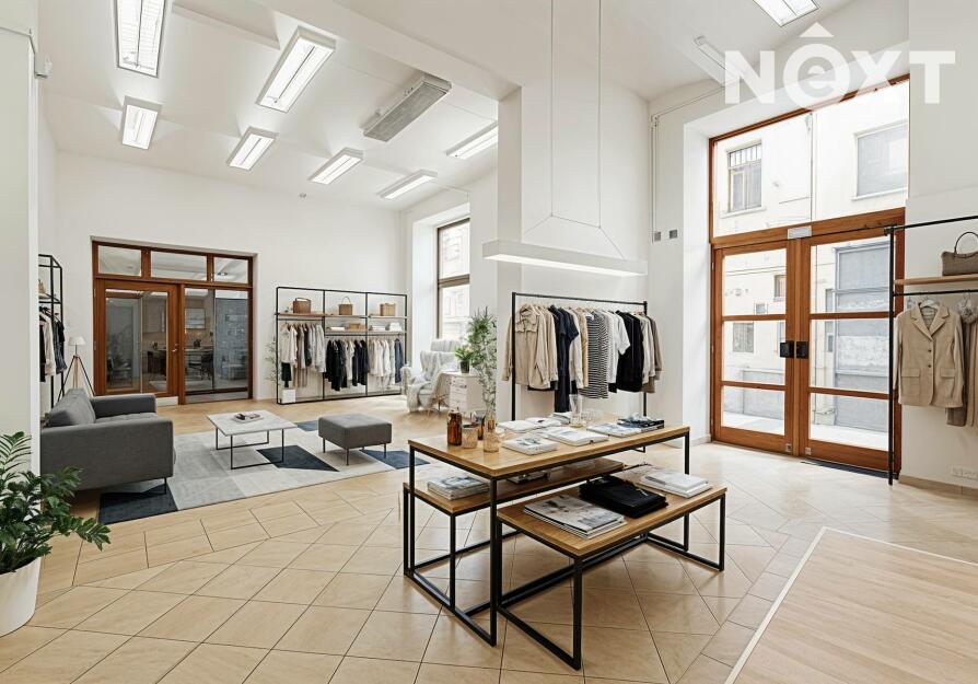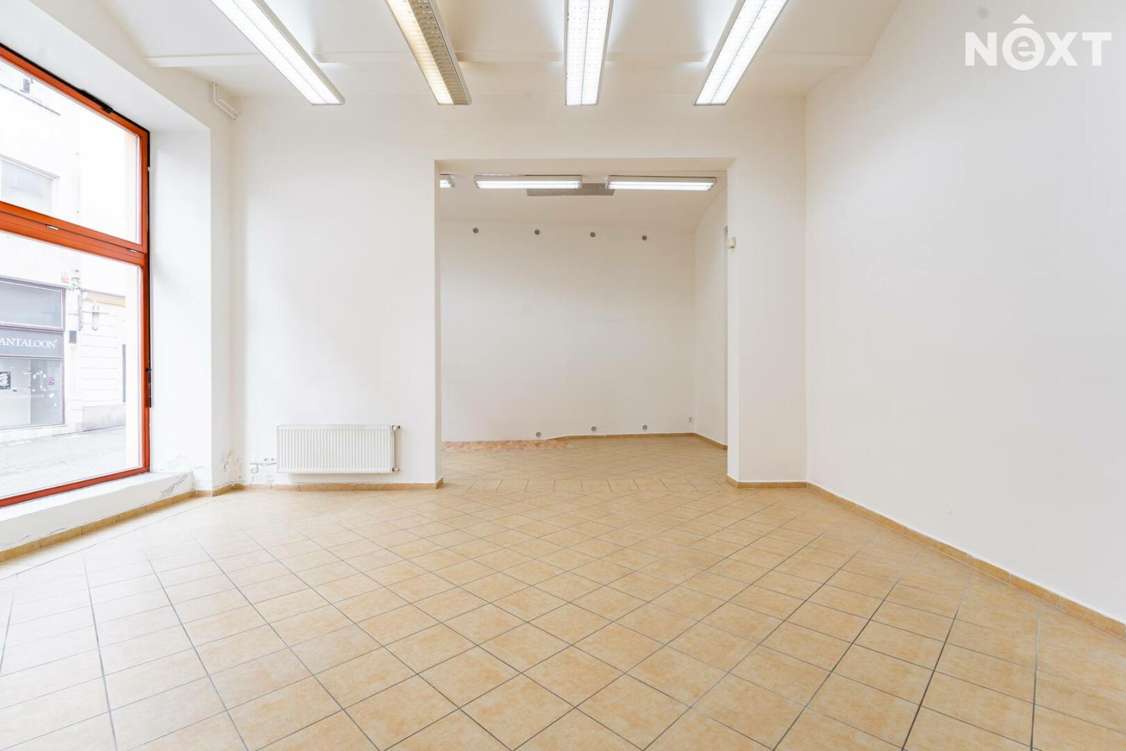 Prostor s výlohami má přímý vstup z pěší zóny a v minulosti sloužil jako prodejna. Dispozičně je řešen převážně jako otevřený prostor vhodný pro prodej nebo showroom, doplněný o menší zázemí a samostatnou místnost, kterou lze využít jako sklad, šatnu či menší kancelář.