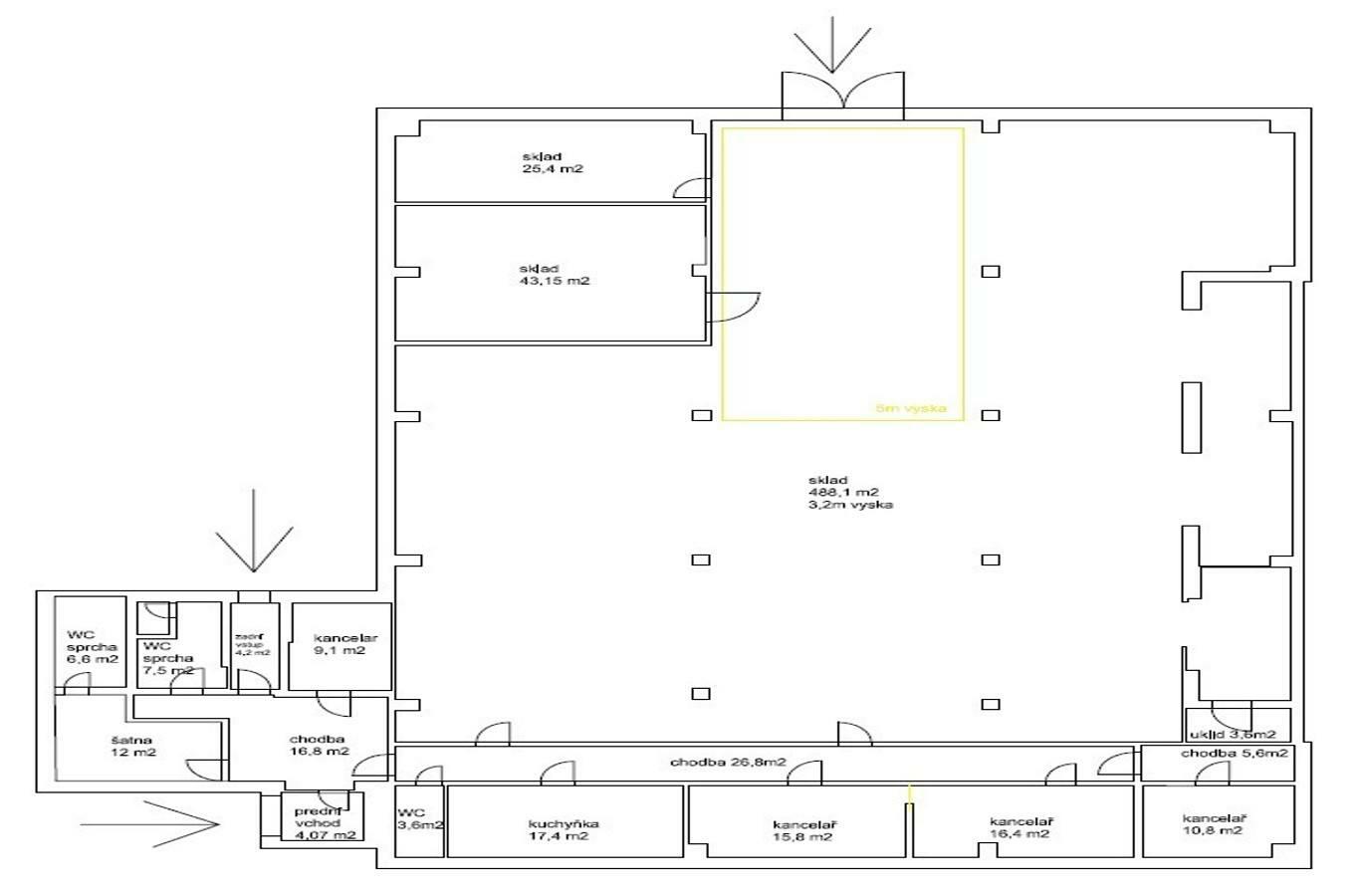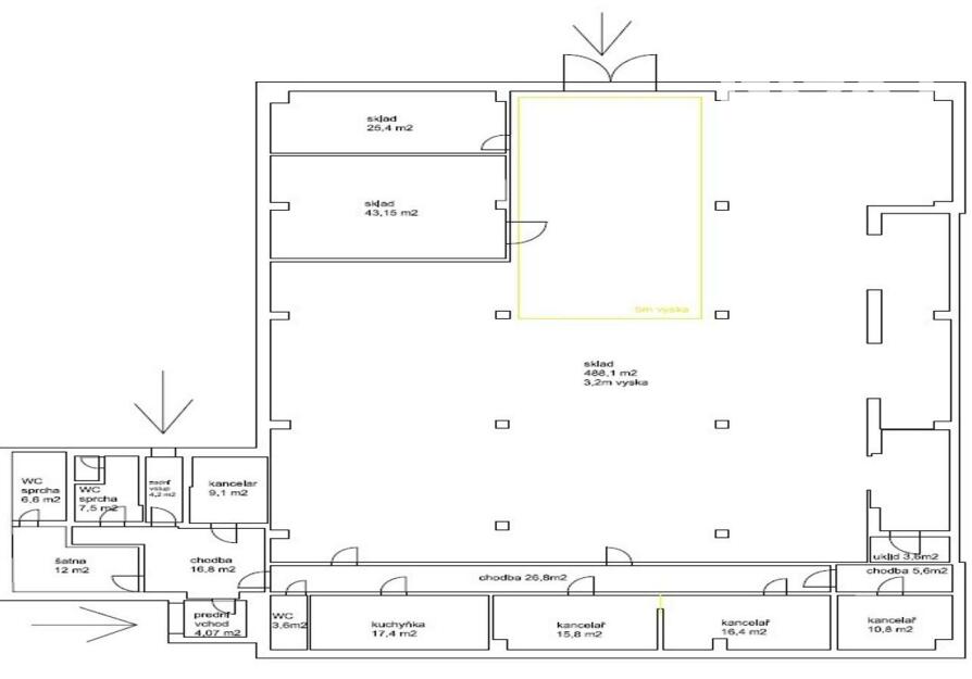 Srdcem budovy je rozsáhlý hlavní skladovací prostor, který poskytuje dostatek místa pro skladování zboží, manipulaci s paletami, provoz regálových systémů nebo organizaci logistických procesů. Prostor je přístupný přes nájezdovou rampu a vrata, která umožňují pohodlný příjezd nákladních vozidel včetně kamionu – bez komplikací, bez zbytečných manévrů. Součástí skladu jsou dvě větší kancelářské místnosti, které lze využít přímo jako operativní zázemí pro vedoucí skladu, dispečery nebo administrativu spojenou s provozem.