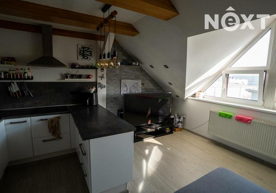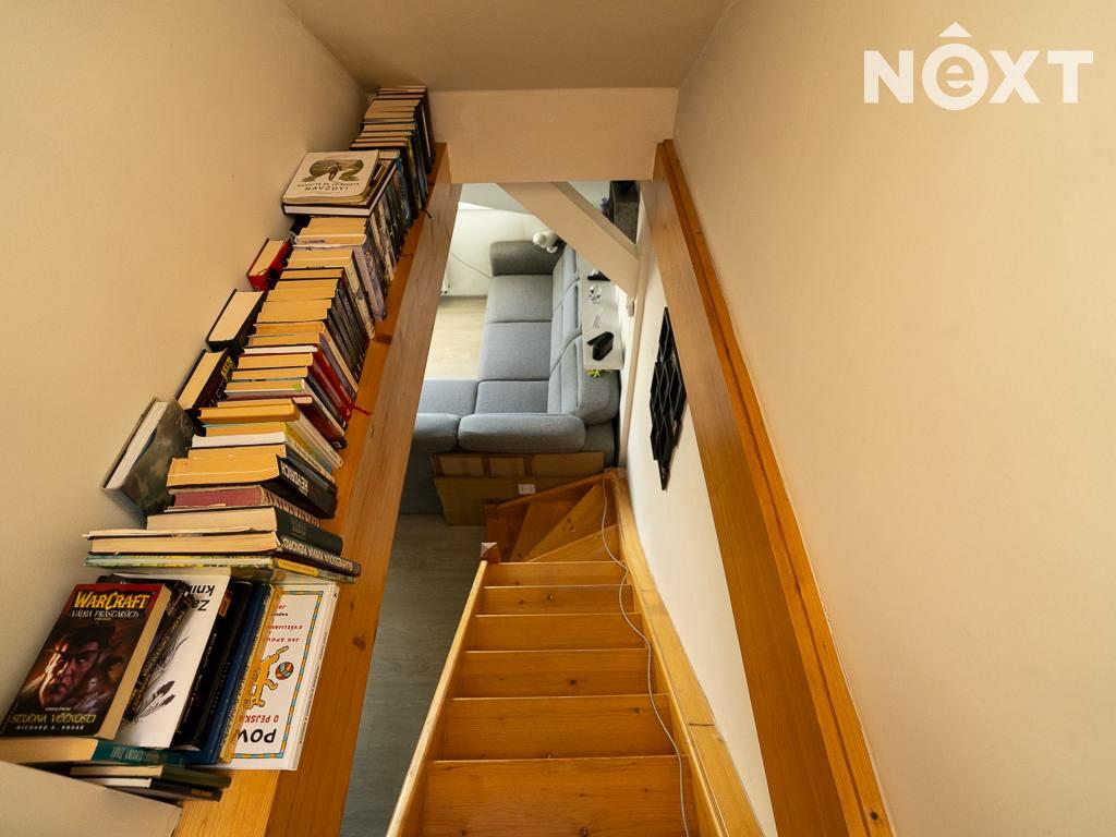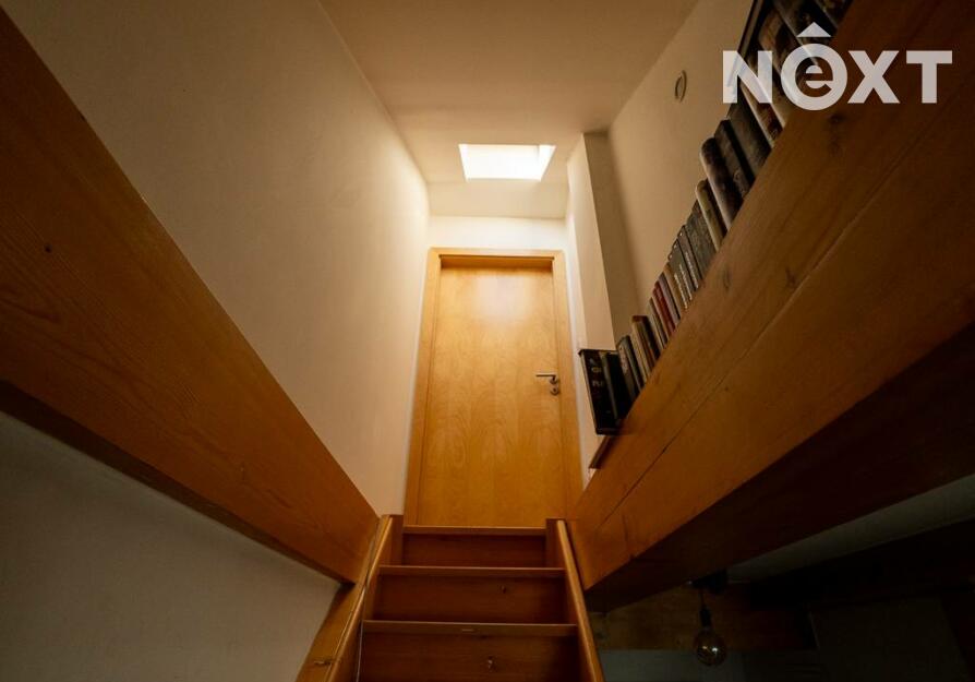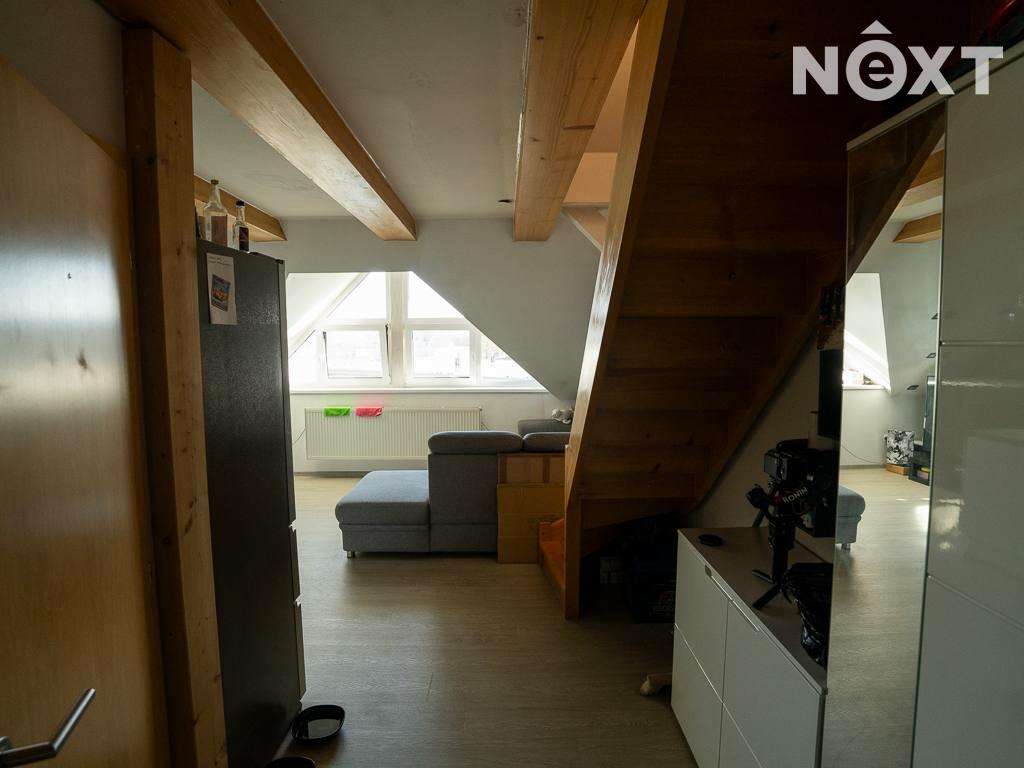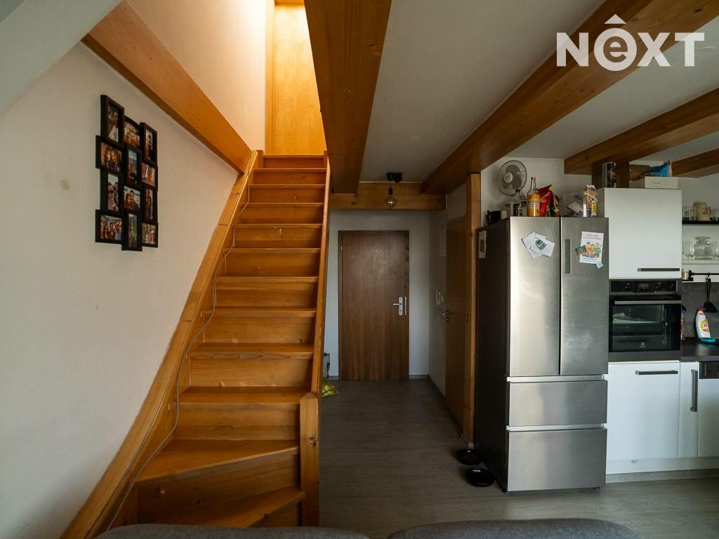 Jeho dispozici tvoří předsíň s vestavěným nábytkem, na kterou navazuje vybavený obývací pokoj s kuchyňským koutem (lednice, trouba, myčka, varná deska, digestoř) a koupelna. Dále je z předsíně schodiště do dalšího patra bytu, kde je další pokoj.