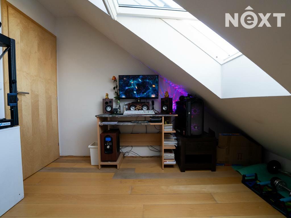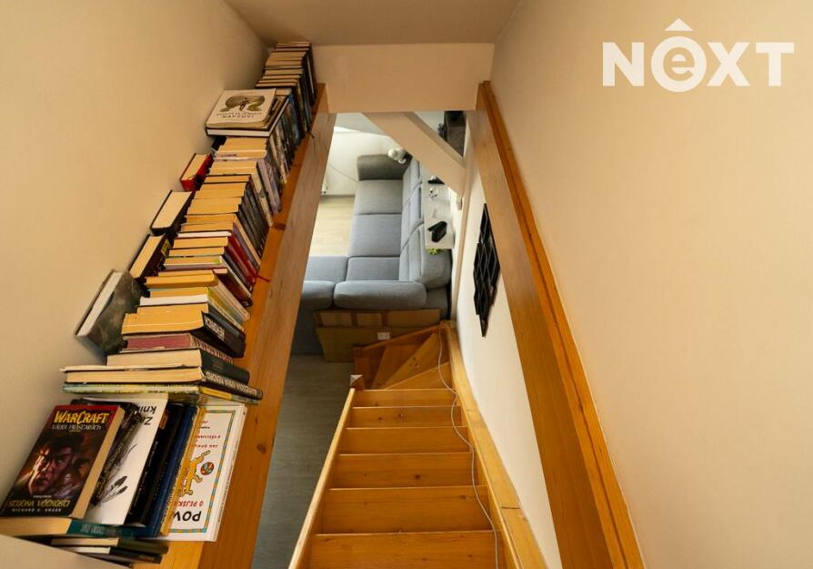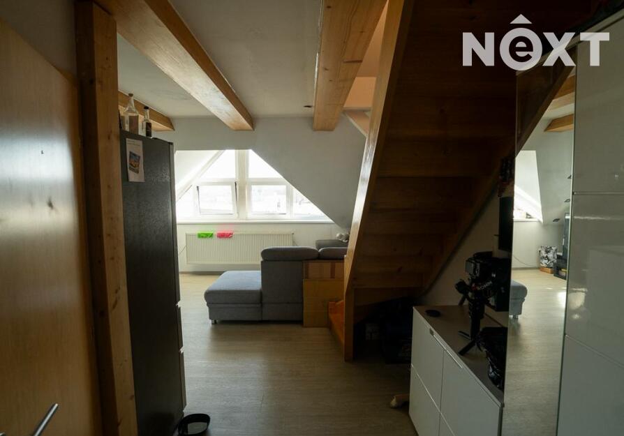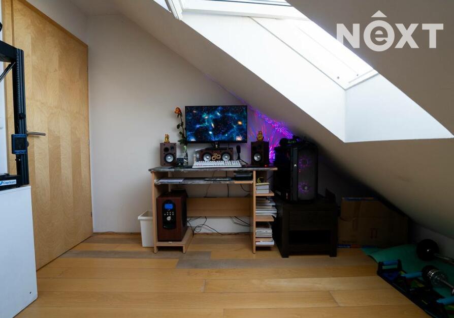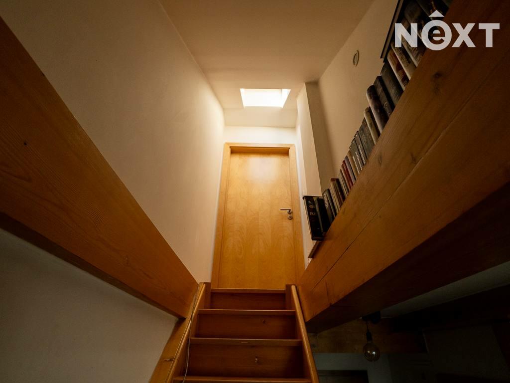 Jeho dispozici tvoří předsíň s vestavěným nábytkem, na kterou navazuje vybavený obývací pokoj s kuchyňským koutem (lednice, trouba, myčka, varná deska, digestoř) a koupelna. Dále je z předsíně schodiště do dalšího patra bytu, kde je další pokoj.