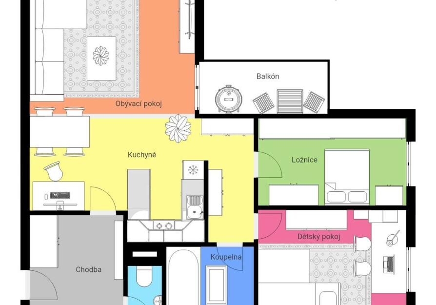Součástí bytu je také balkon o velikosti 4,6 m², který poskytuje příjemné místo k odpočinku. K bytu náleží sklepní kóje o výměře 2 m².