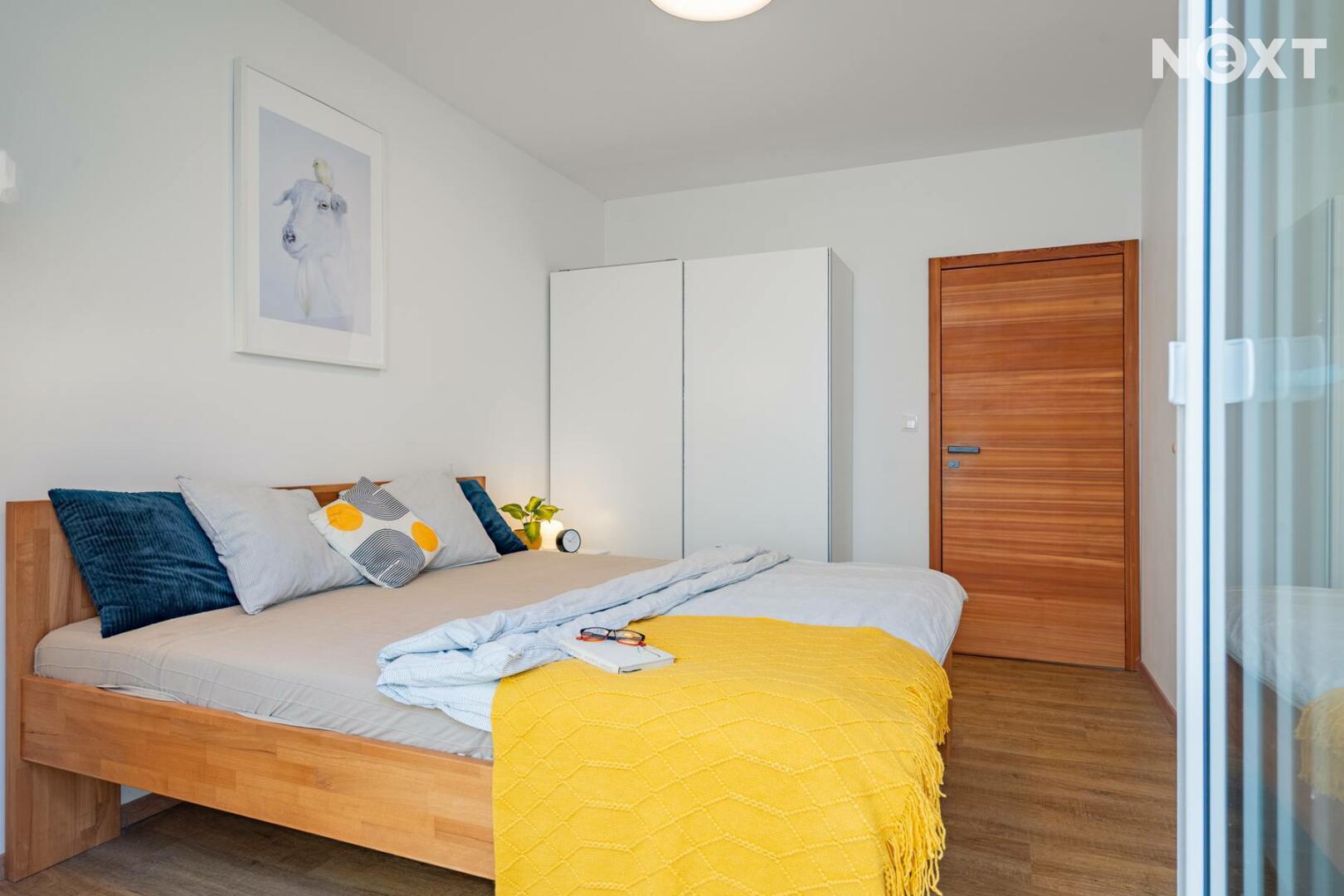 Z obývacího pokoje i ložnice je přímý vstup na terasu, která bytu dodává jedinečný charakter. Okna jsou navíc vybavena předokenními žaluziemi, které zajišťují soukromí i tepelný komfort.