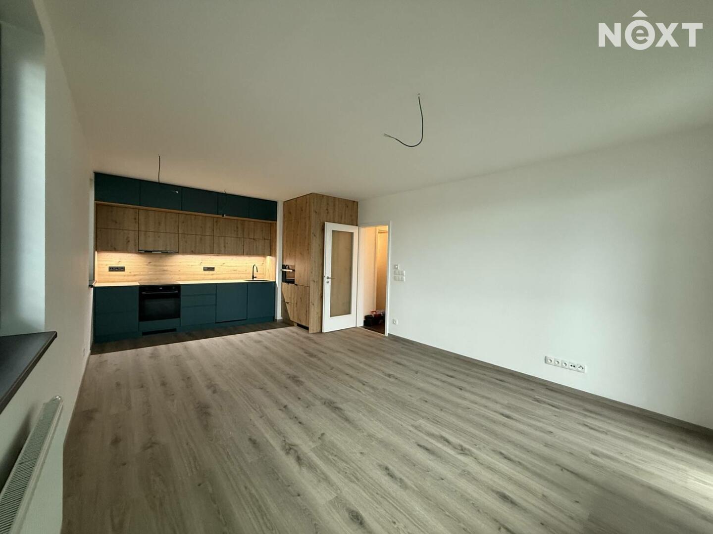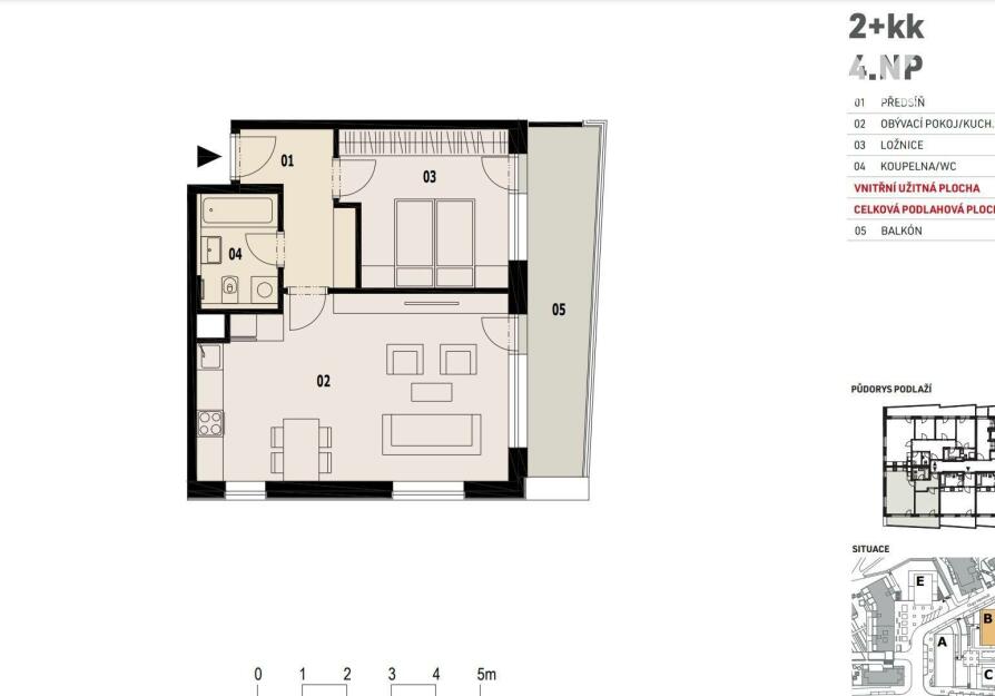 Byt s dispozicí 2KK (53,90m²)/lodžie (11,4m²) vč. garážového parkovacího stání se nachází v 4. nadzemním podlaží a má tyto dispozice: vstupní chodba s vestavěnou skříní, moderní kuchyňská linka s vestavěnými spotřebiči spojená s obývacím pokojem a výstupem na lodžii, ložnice, koupelna s vanou vč. wc a prostorem pro pračku a sušičku.