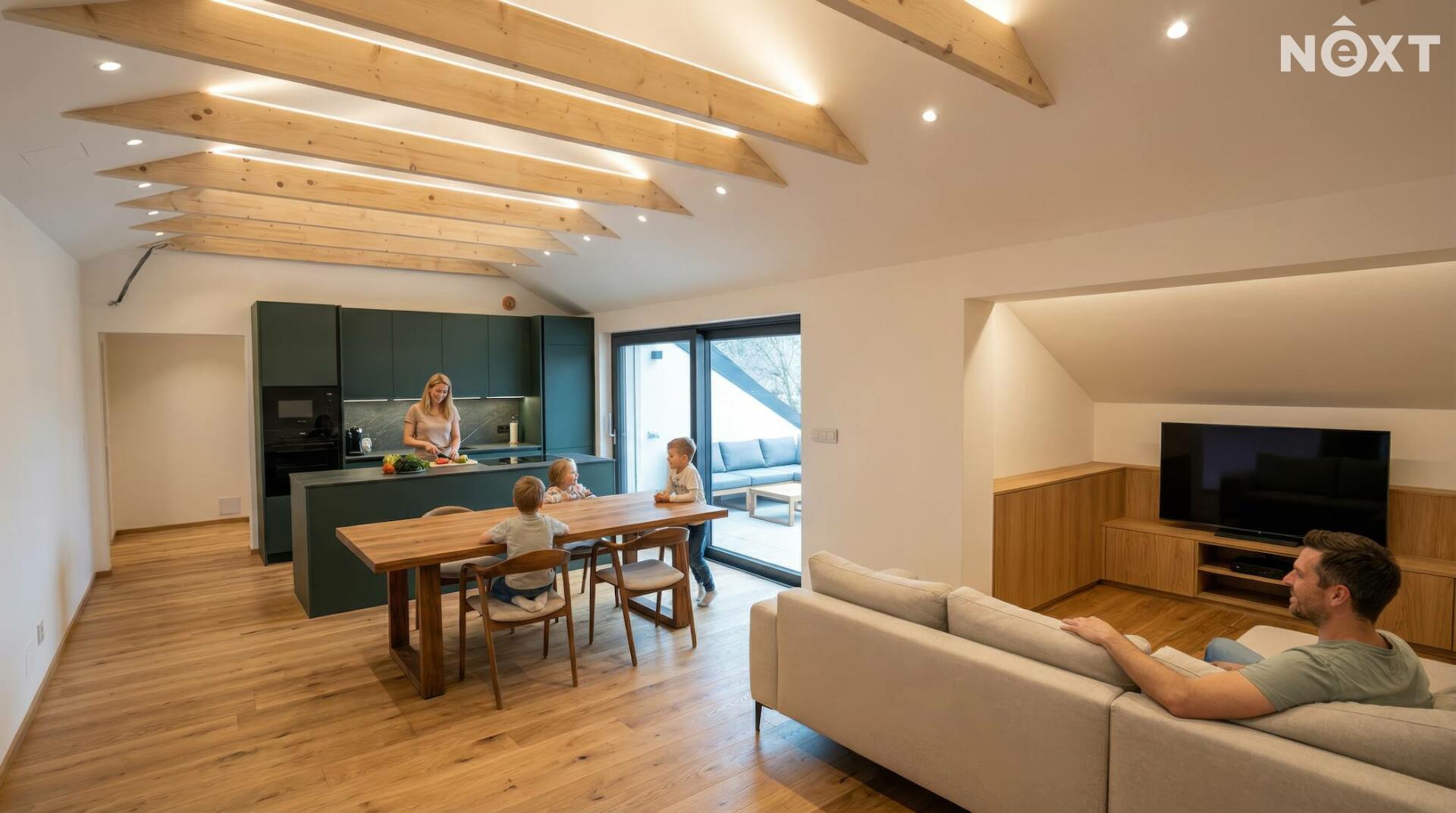 - podlahové vytápění v celém bytě napojené na tepelné čerpadlo, které zajišťuje nízké náklady na provoz