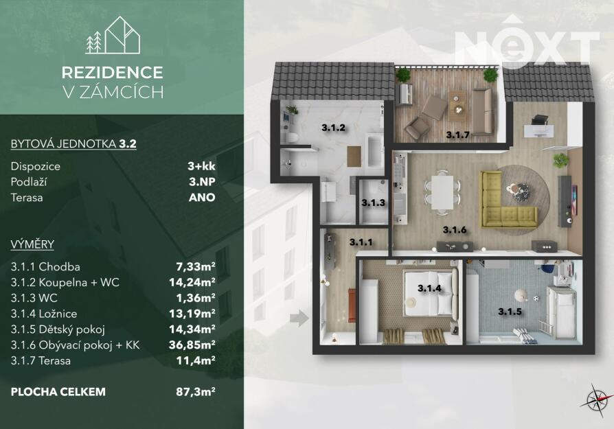 Tento stylový byt o dispozici 3+kk se nachází ve 3. nadzemním podlaží komorního projektu s výtahem. Projekt o pouhých 10 bytových jednotkách, který harmonicky spojuje komfort městského bydlení s blízkostí přírody a výhledem na řeku.
