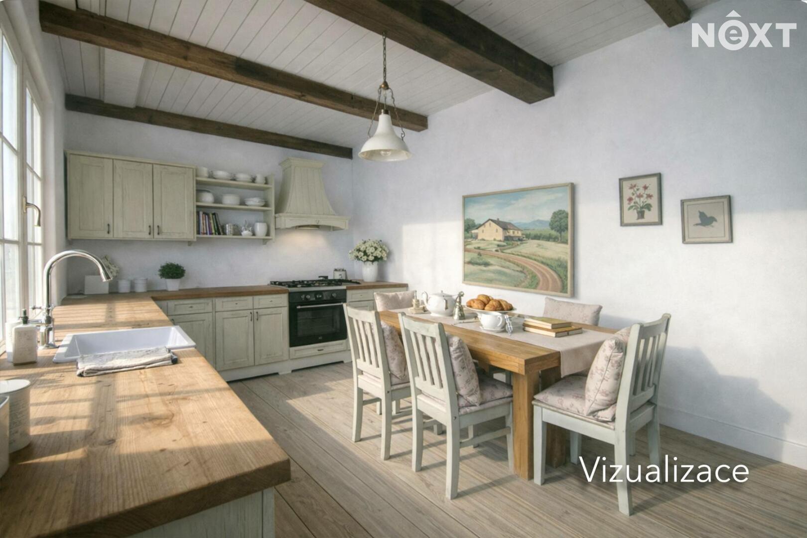Přízemí v rustikálním stylu, které je plně funkční a kde se o teplo starají kachlová kamna. Také zde najdete malou kuchyňku, koupelnu s toaletou a další místnosti, jejích určení už bude na vás.