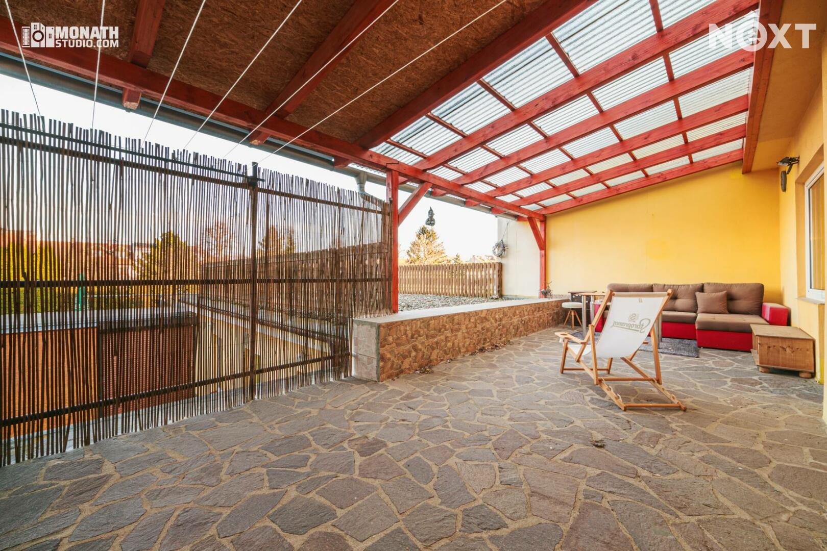 - stylová venkovní zastřešená terasa s krbem a kulečníkem