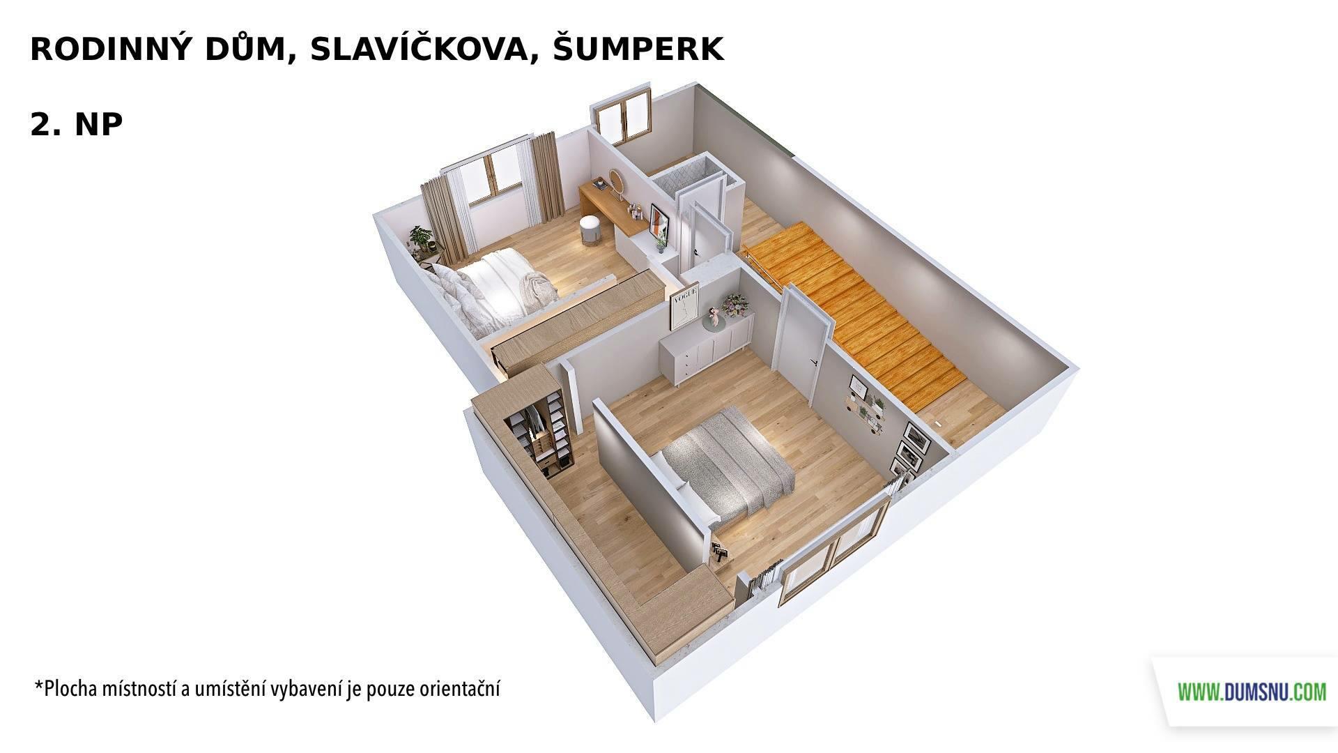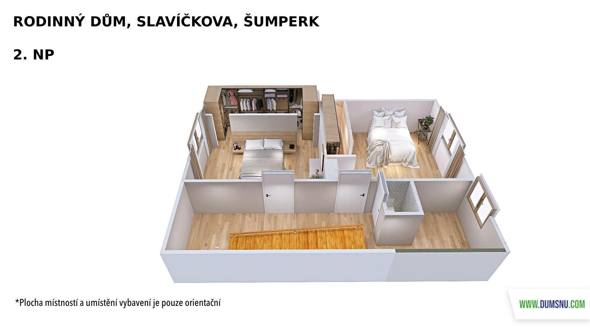 2. nadzemní podlaží nabízí dva pokoje, každý s vlastní šatnou, a samostatnou toaletu.