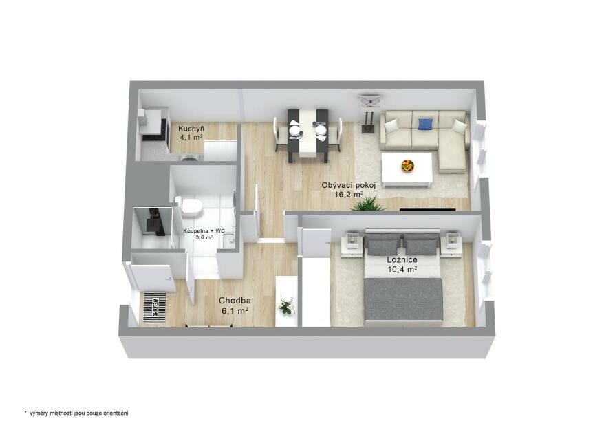 Součástí bytu je také neprůchozí ložnice o velikosti 10,4 m², která poskytuje klid a soukromí. Moderní koupelna (3,6 m²) je vybavena sprchovým koutem a byla kompletně zrekonstruována v nadčasovém stylu. V chodbě (6,1 m²) je dostatek místa pro šatní skříň či vestavné úložné prostory.