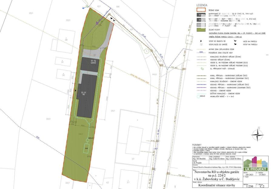 Velkou výhodou této nabídky je skutečnost, že na pozemek je k dispozici zpracovaný stavební projekt rodinného domu včetně garážového stání. V přední části pozemku se nachází kaplička na elektřinu, v přístupové komunikaci je připravena přípojka na vodu. Odpadní vody jsou dle regulativu řešeny vlastní čističkou odpadních vod. Na konci pozemku je příprava pro kolektory na tepelné čerpadlo, což výrazně snižuje budoucí náklady na vytápění a zvyšuje energetickou efektivitu domu.