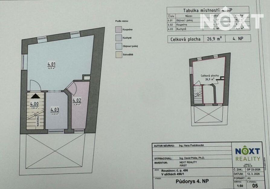 Nabízíme k prodeji pěkný útulný podkrovní byt o dispozici 1+kk a podlahové ploše 26,9 m², který se nachází ve 4. nadzemním podlaží menšího domu bez výtahu přímo na náměstí v Rousínově.