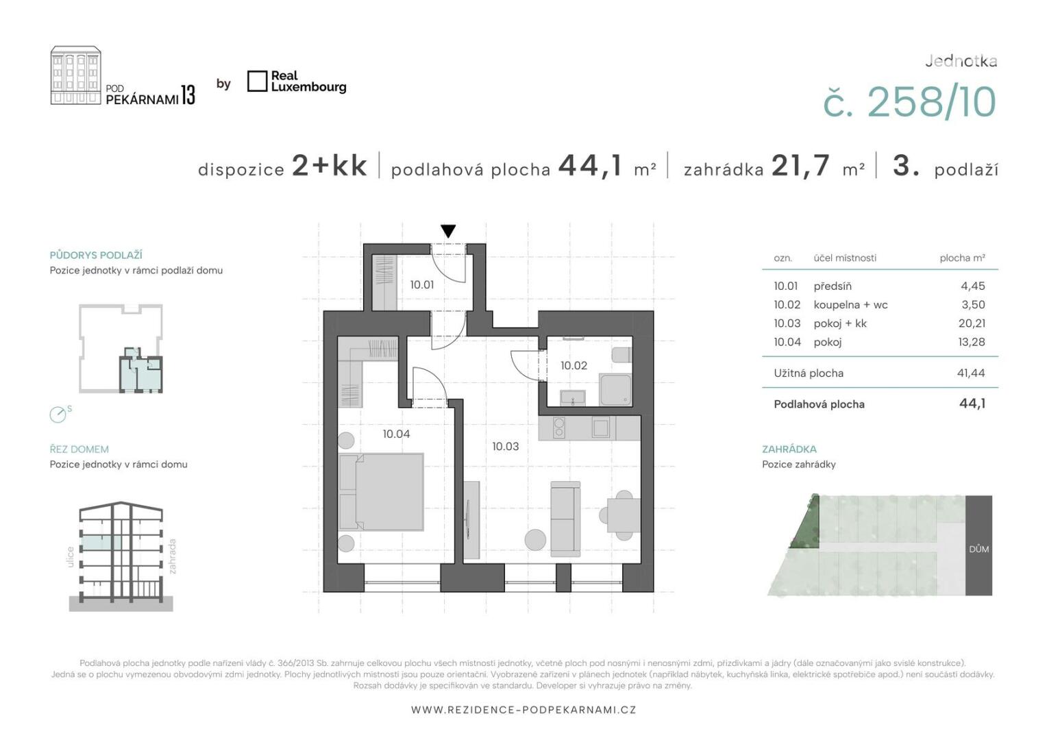 Rád bych Vám v rámci výhradního zastoupení developera představil byt 2+kk o podlahové ploše 44,1 m² v citlivě rekonstruovaném projektu Rezidence Pod Pekárnami 13, situovaném v klidné části Prahy 9. Byt se nachází ve 3. nadzemním podlaží, je orientovaný na jihovýchod, směrem do ulice a jeho benefitem je soukromá zahrádka o výměře 20,2 m².