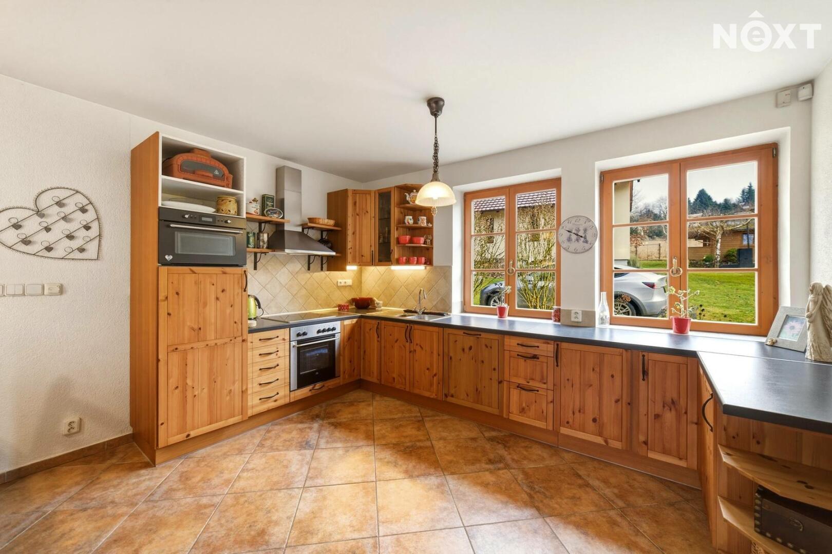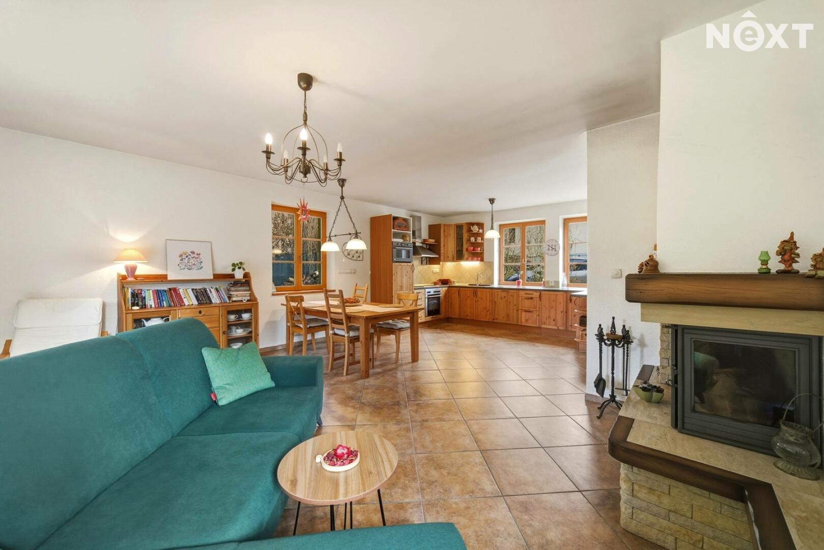 Dominantou domu je světlý obývací pokoj propojený s kuchyní, která je vybavena moderními spotřebiči a nabízí dostatek úložného prostoru.