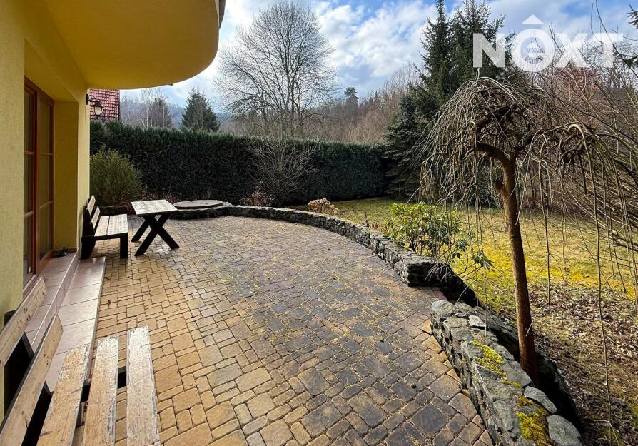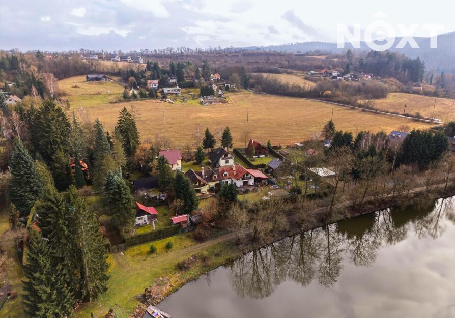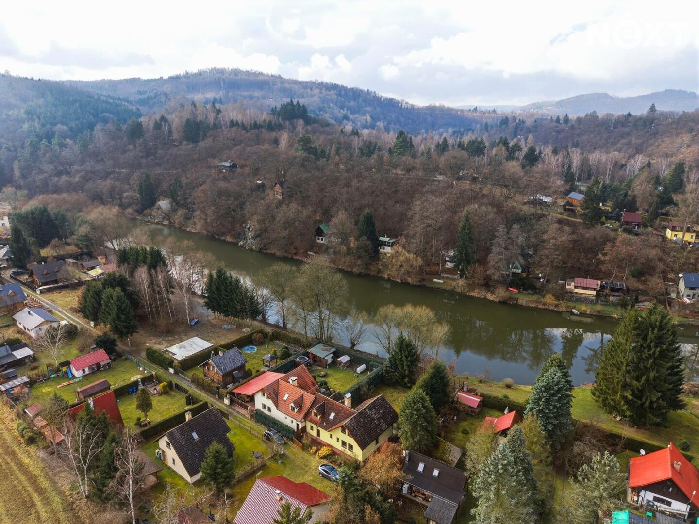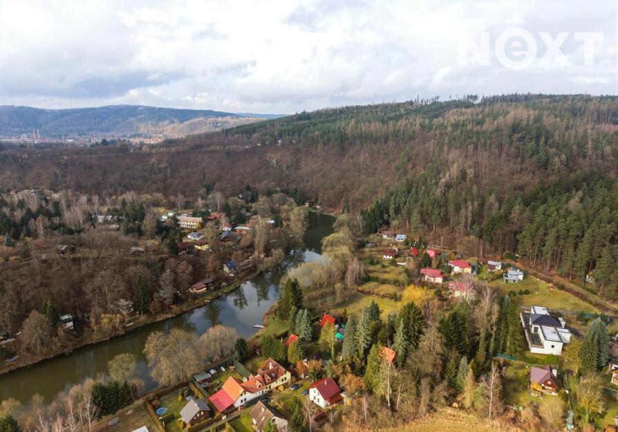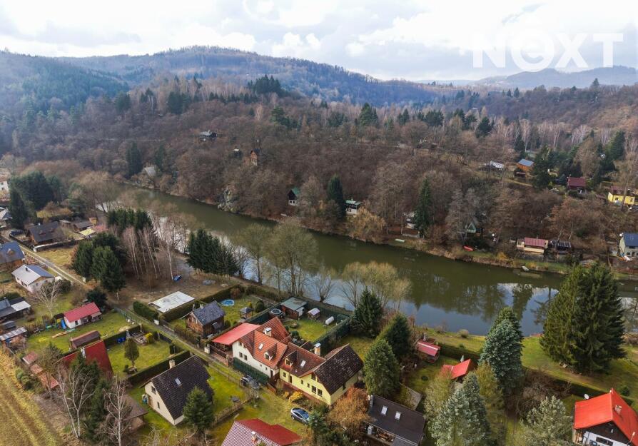 Dům stojí na obdélníkovém, ze tří stran oploceném pozemku o celkové výměře 567 m², z čehož pečlivě udržovaná okrasná zahrada tvoří 463 m². Ta nabízí dostatek prostoru pro relaxaci, dětské hry, zahradničení nebo jen pro nicnedělání, které je zde překvapivě návykové. Využít k tomu můžete rozlehlou terasu s výhledem na řeku. A pokud bude hlad, tak lze i něco ugrilovat v kamenném grilu.